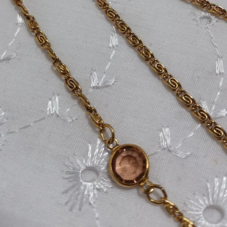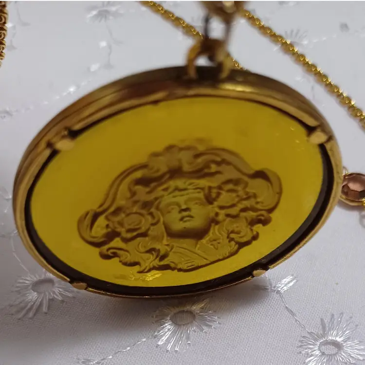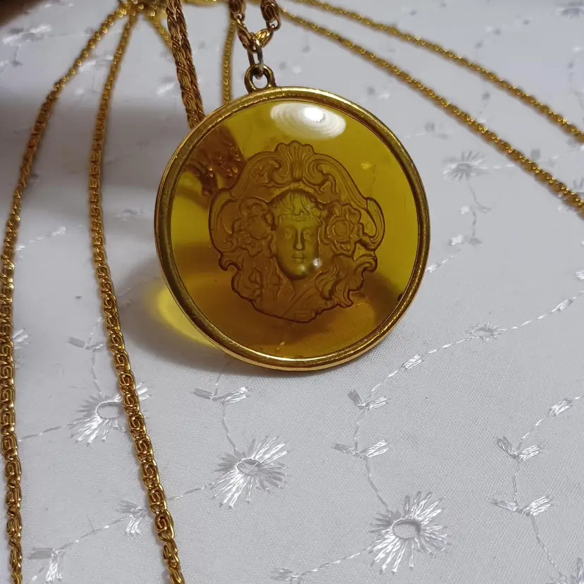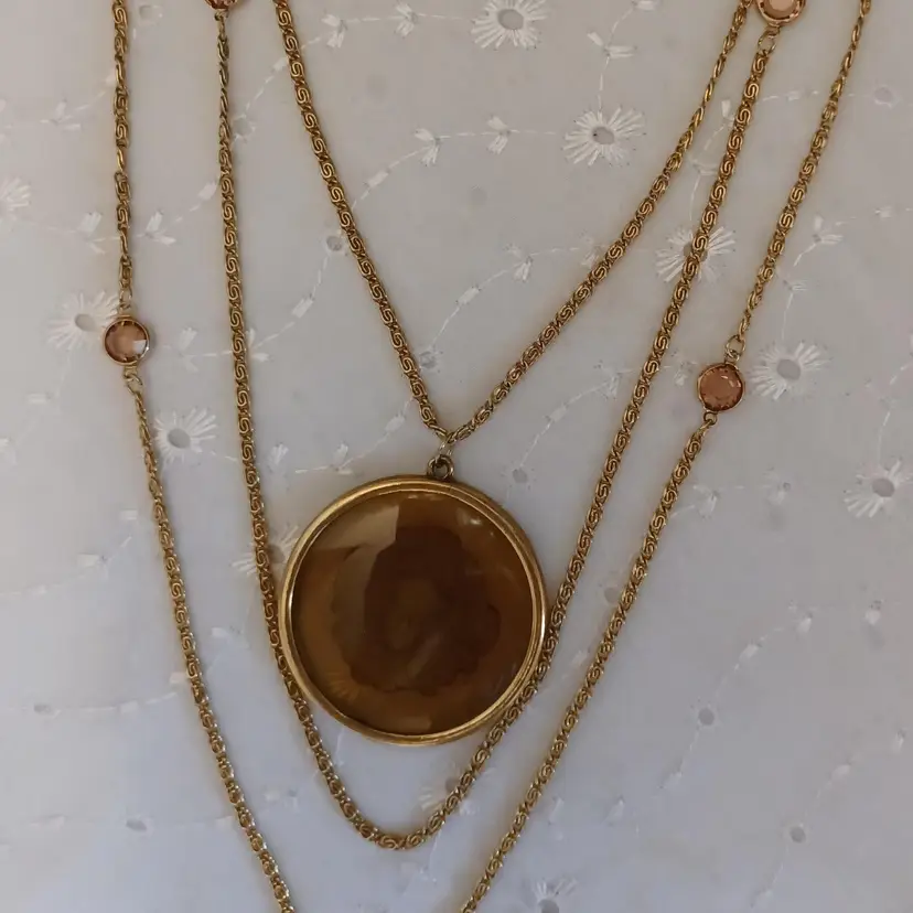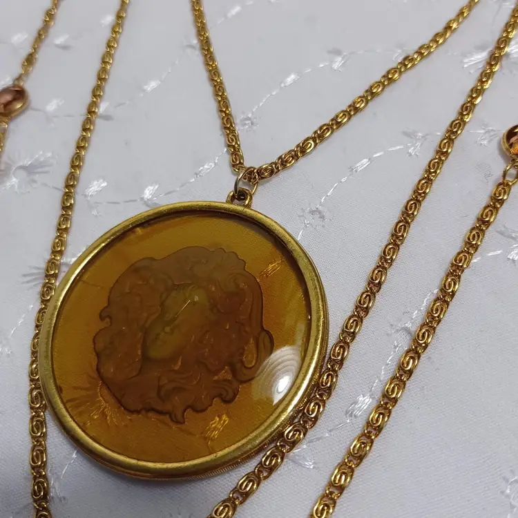 This vintage goldtone necklace features a stunning cameo pendant with intricate detailing. Perfect for adding a touch of classic elegance to any outfit. 30" longest on the multi strand