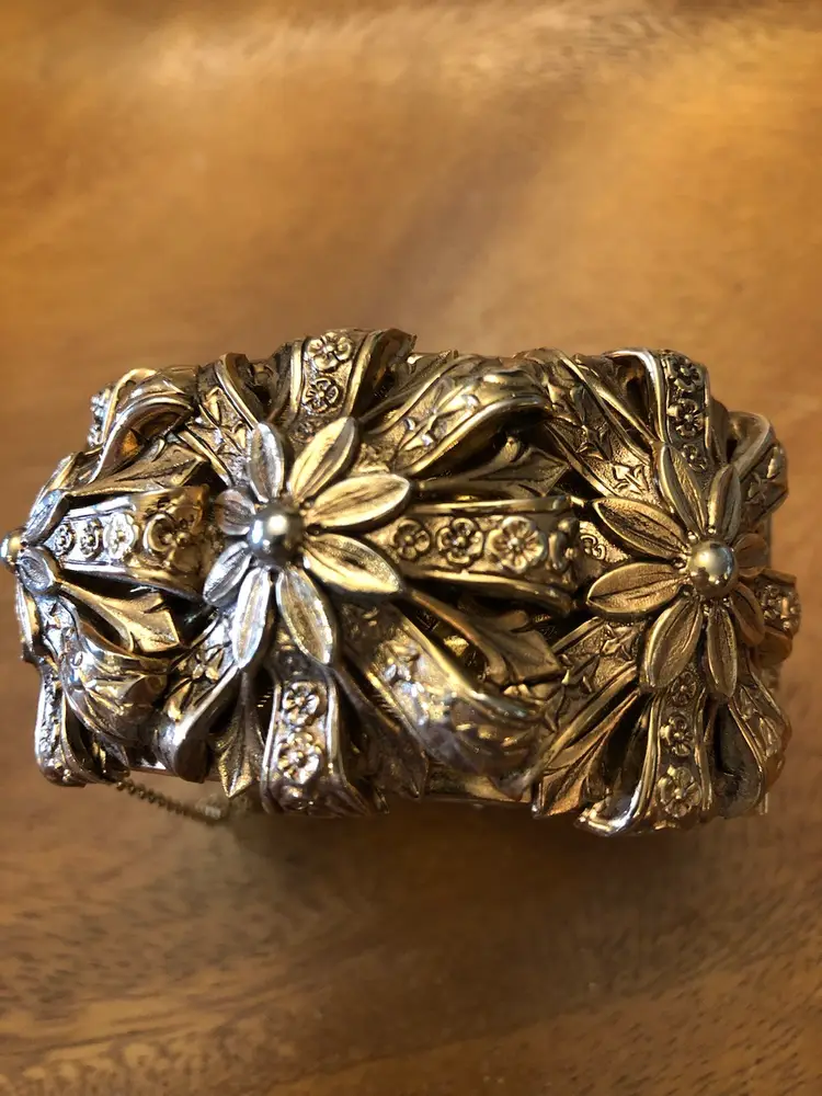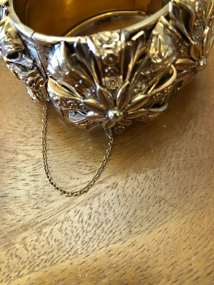 Beautiful 6 raised flower blooms that have always reminded me of poinsettias. 3 layers of intricate sculpt design. This is a oldie but goodie. A real beauty. From my mother’s collection purchased sometime in early 60’s. Excellent condition. Clasp tight w secure safety chain