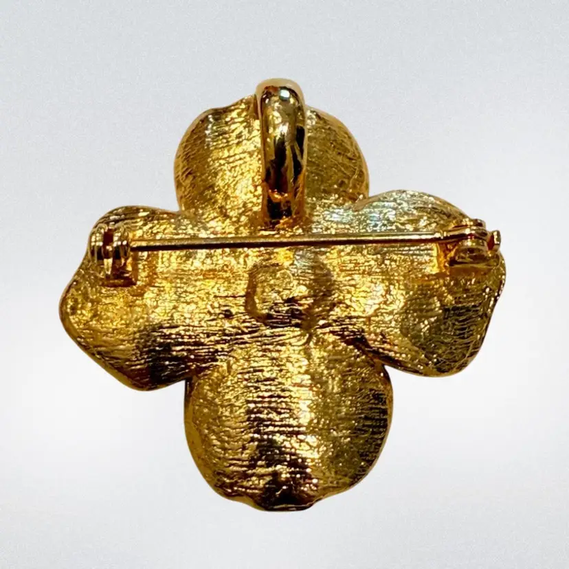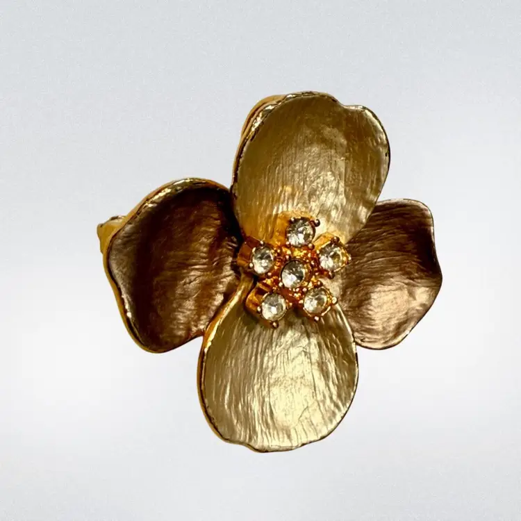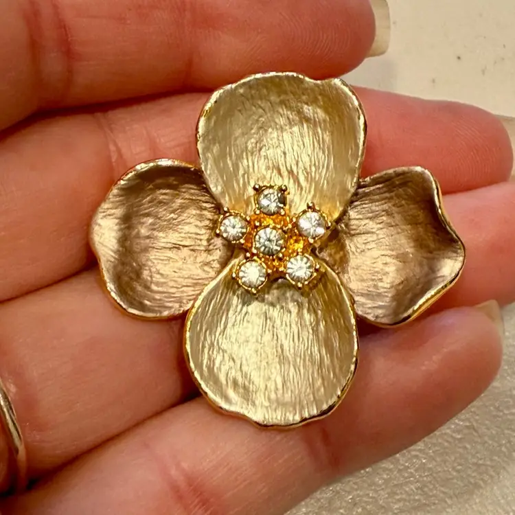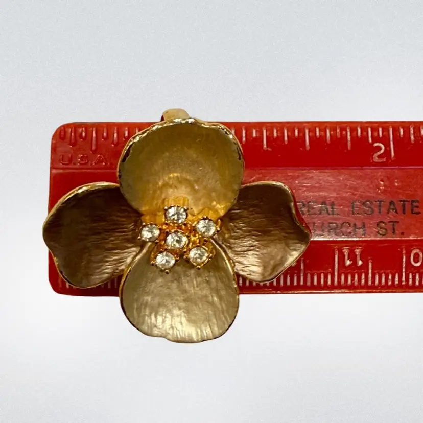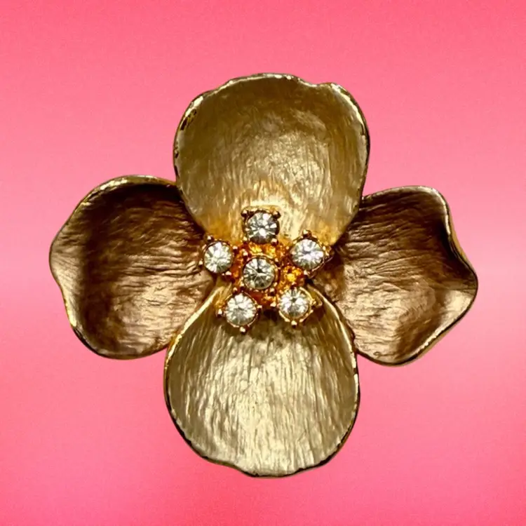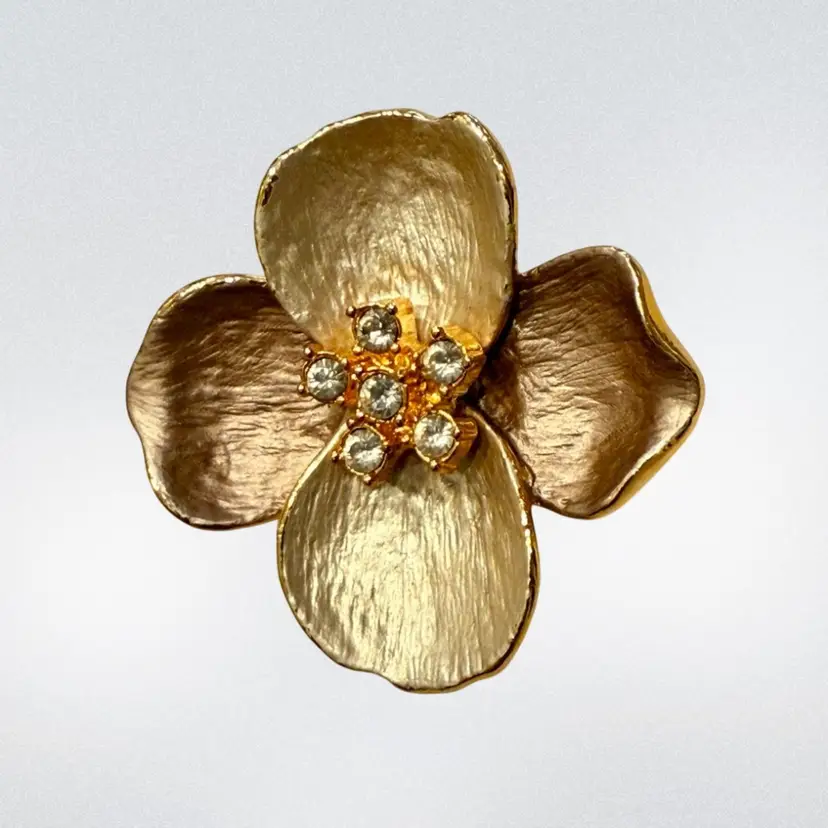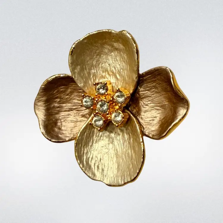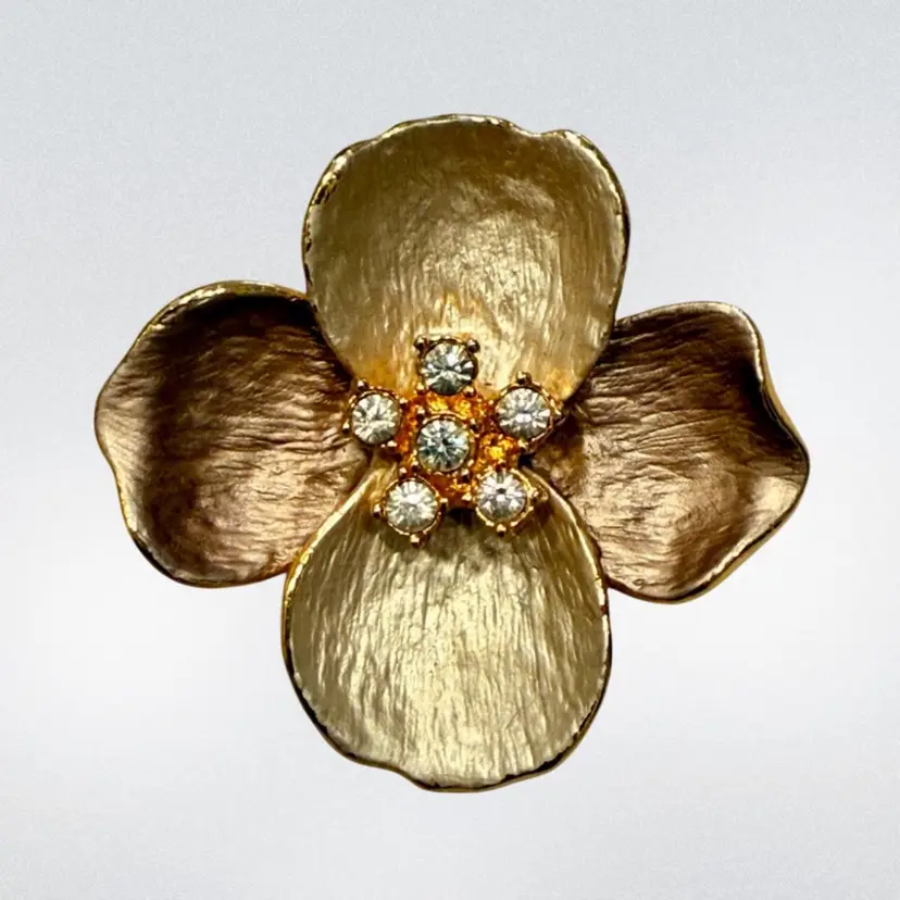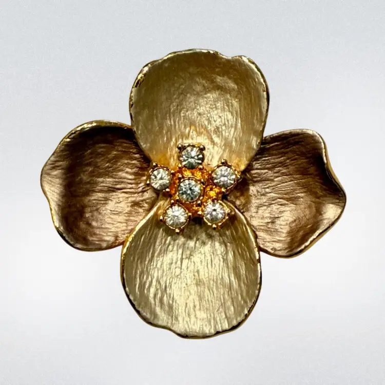 Vintage GoldTone Champagne Enamel Finish Rhinestone Dogwood Brooch 1.5”