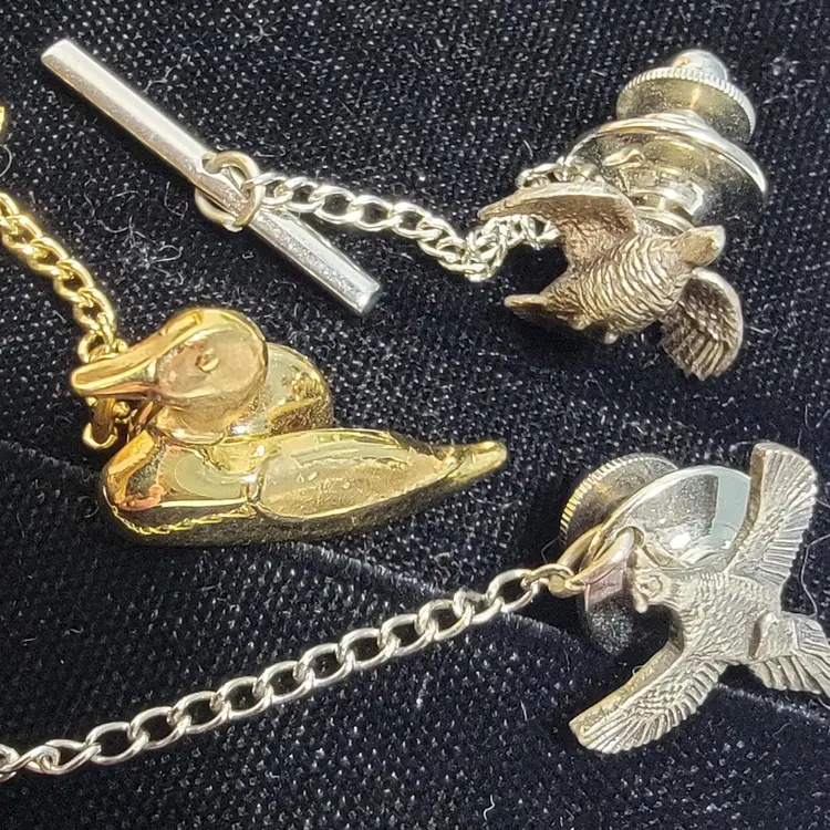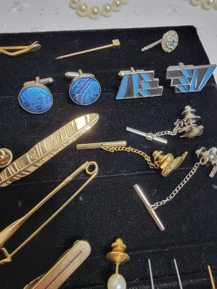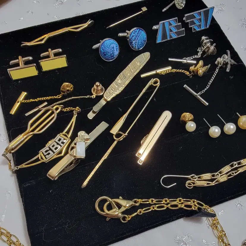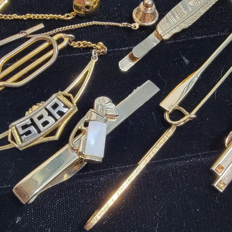 Explore this eclectic collection of vintage goldtone tie clips and cufflinks. Featuring unique designs and classic styles, these pieces are perfect for adding a touch of elegance to any formal attire.