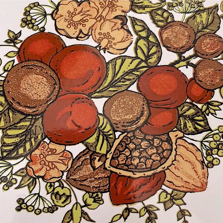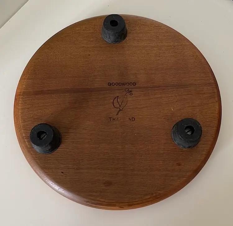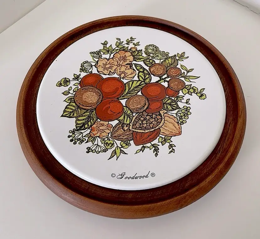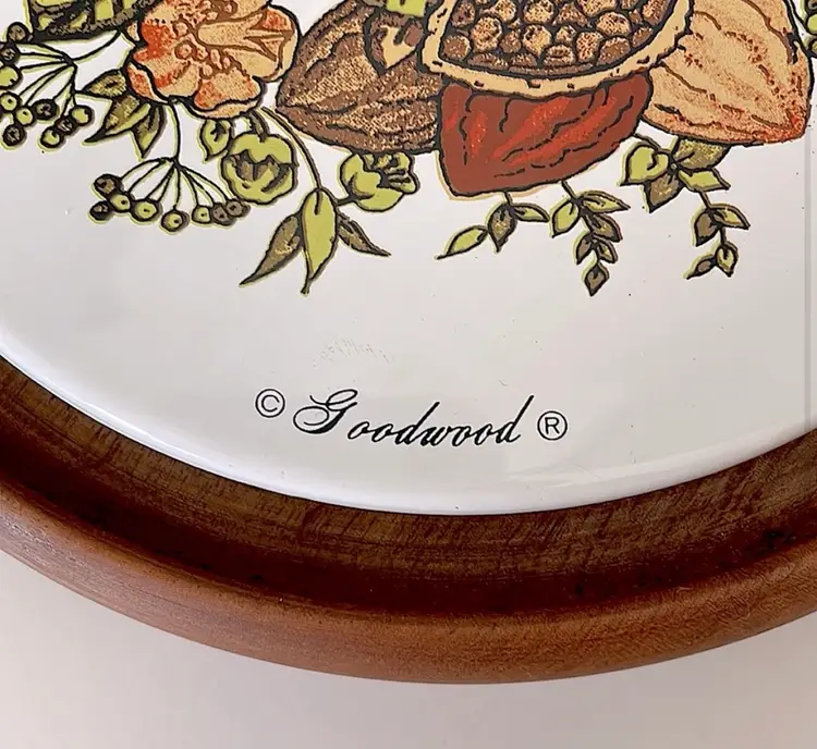 Vintage Goodwood, ceramic, wood, warm colors, tripod trivet made in Thailand. Excellent condition and lots of fun! Measures approximately 7.5” in diameter.