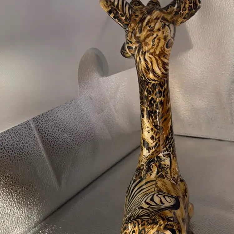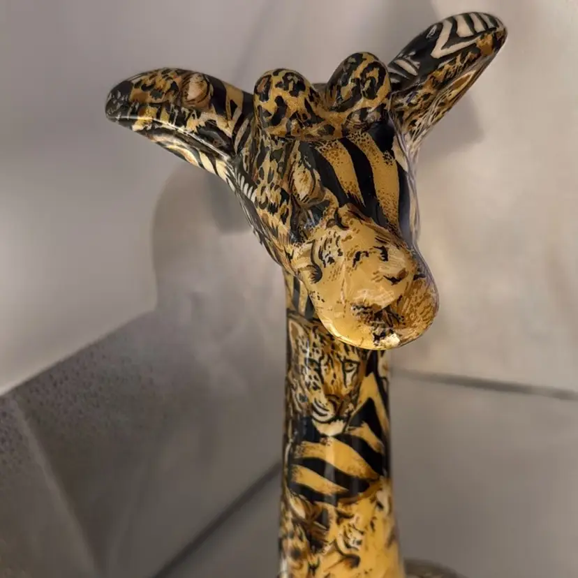 It stands 11 inches tall. It’s covered in zebra, leopard, lion print. It’s part of a collection.