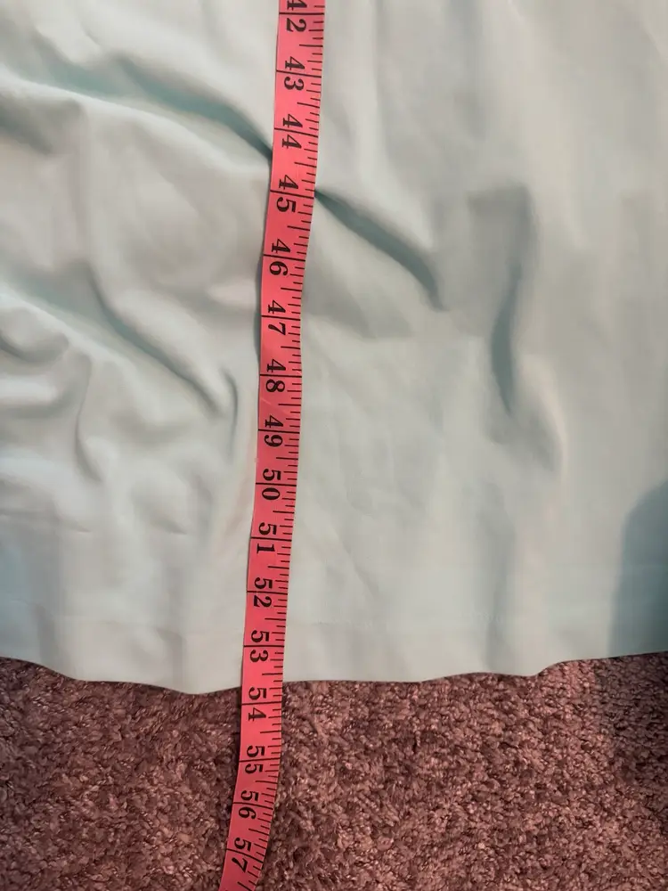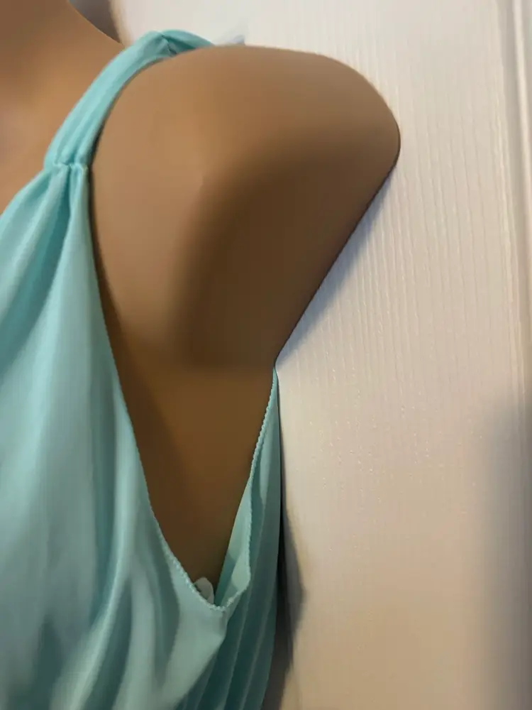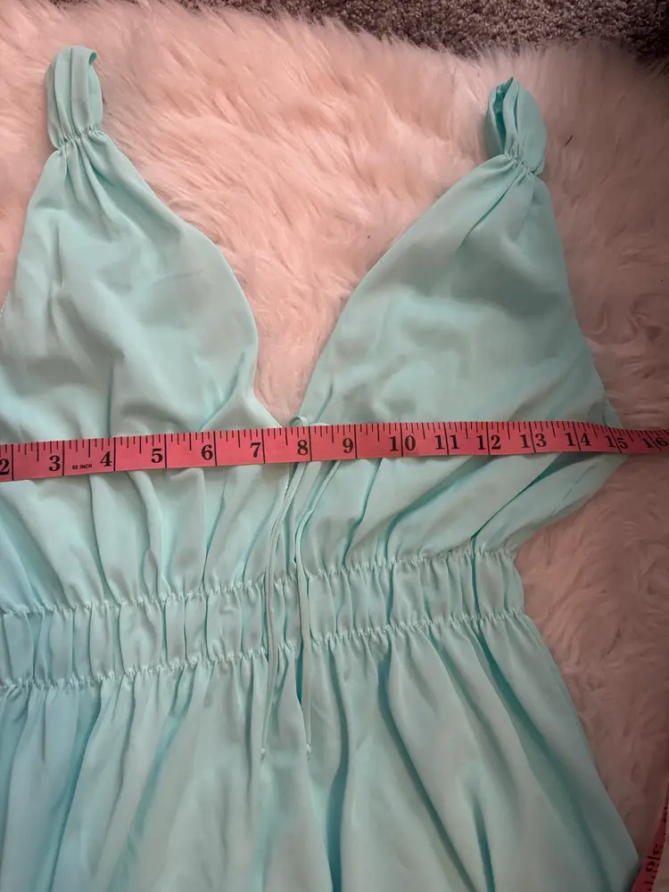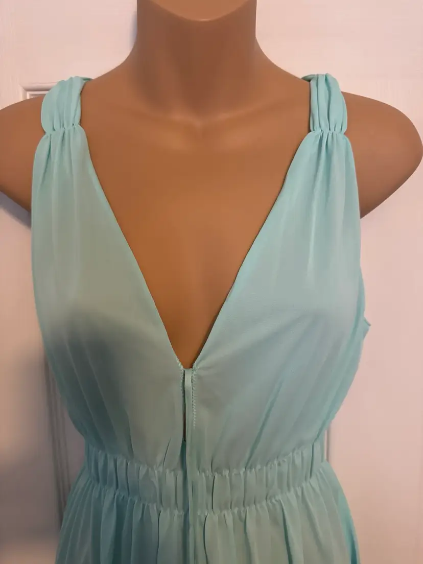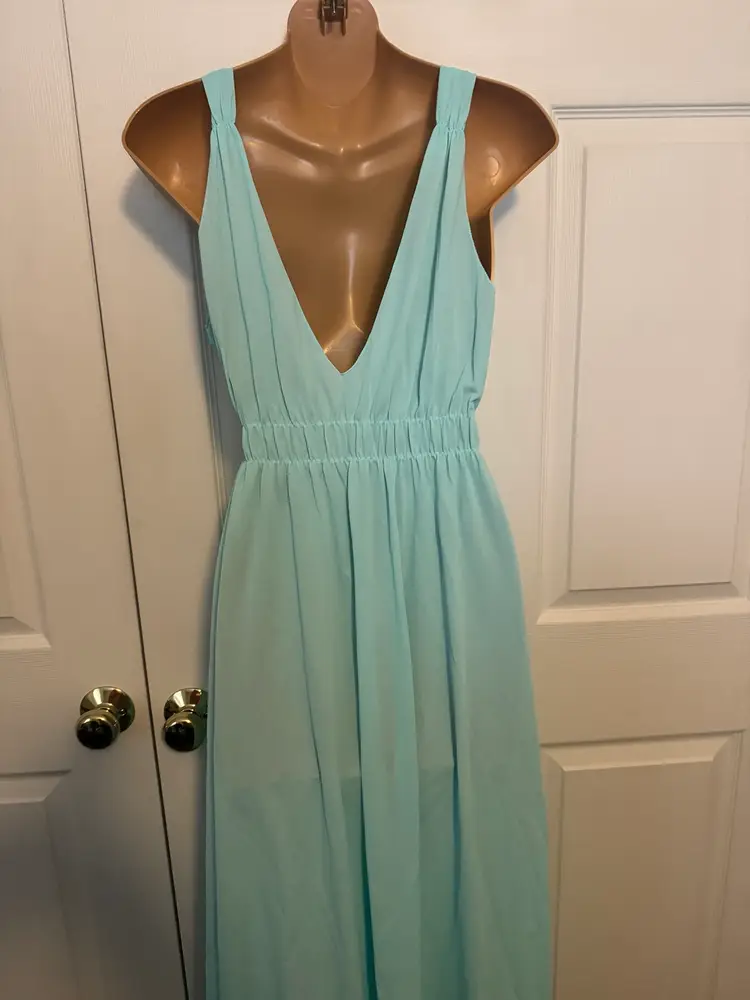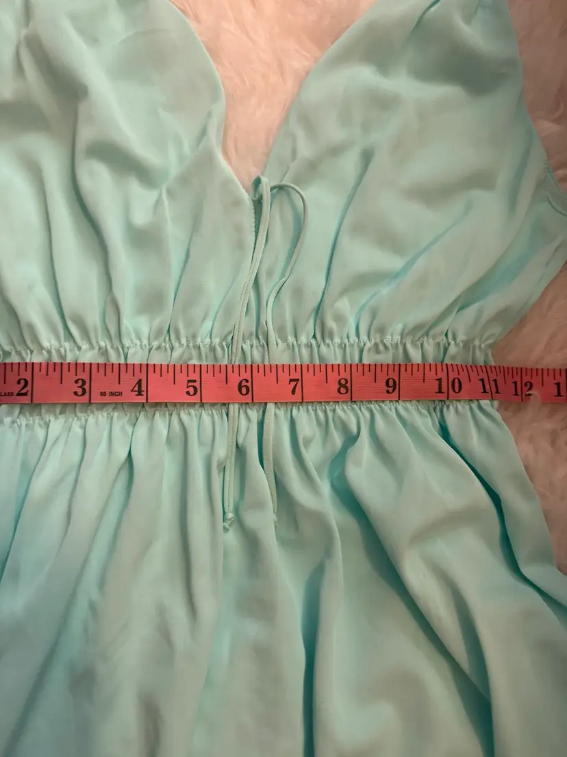 Very pretty blue nightgown, greek goddess style with cinched waist and straps, v neck and v back. Measurements: Length-53 inches, Pit to Pit-15 inches, Waist-11 inches ( but elastic waist so it stretches). Condition is good - no flaws found.