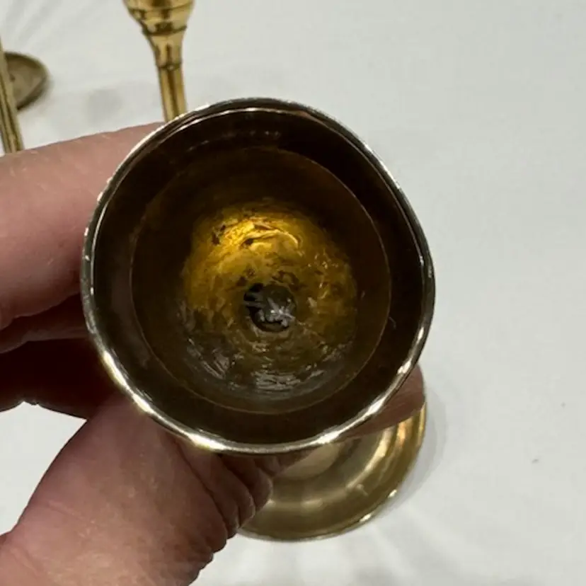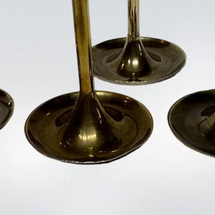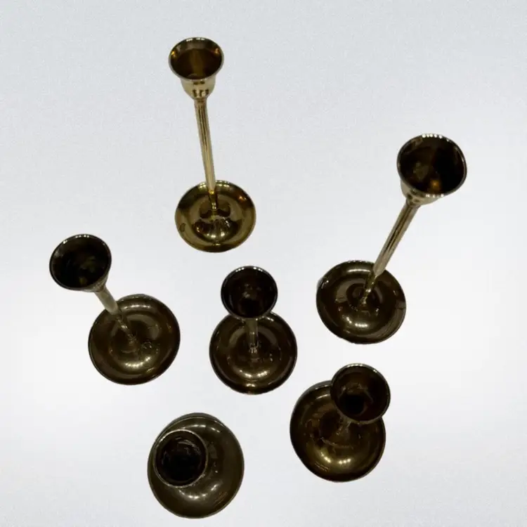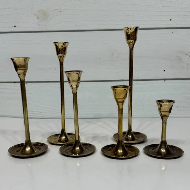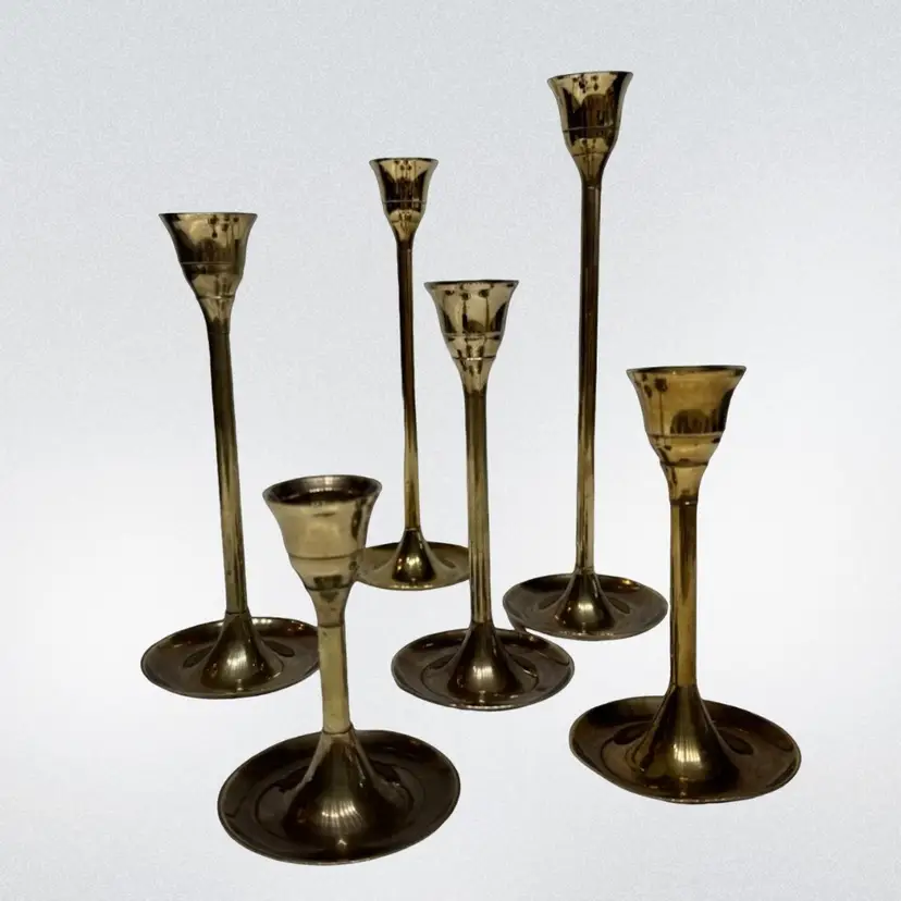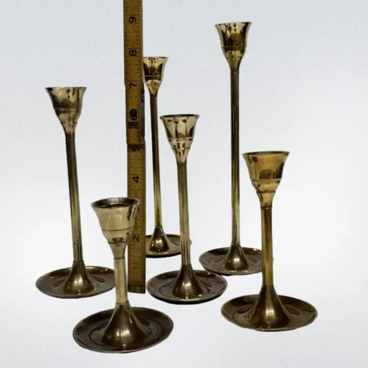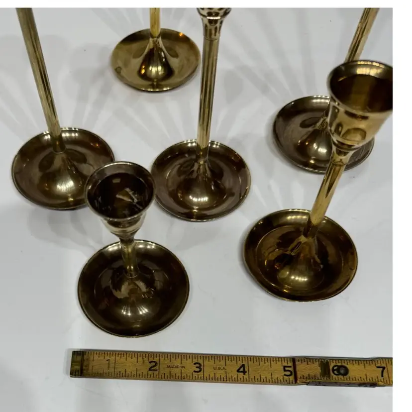 Candles not included. Perfect for the holiday season. they have an incredible patina to them (if you like that sort) 9”, 8”, 7”, 6” 5”, 4”. There is a indent on one candle holder top (please see photos) and also on the bottom of one holder