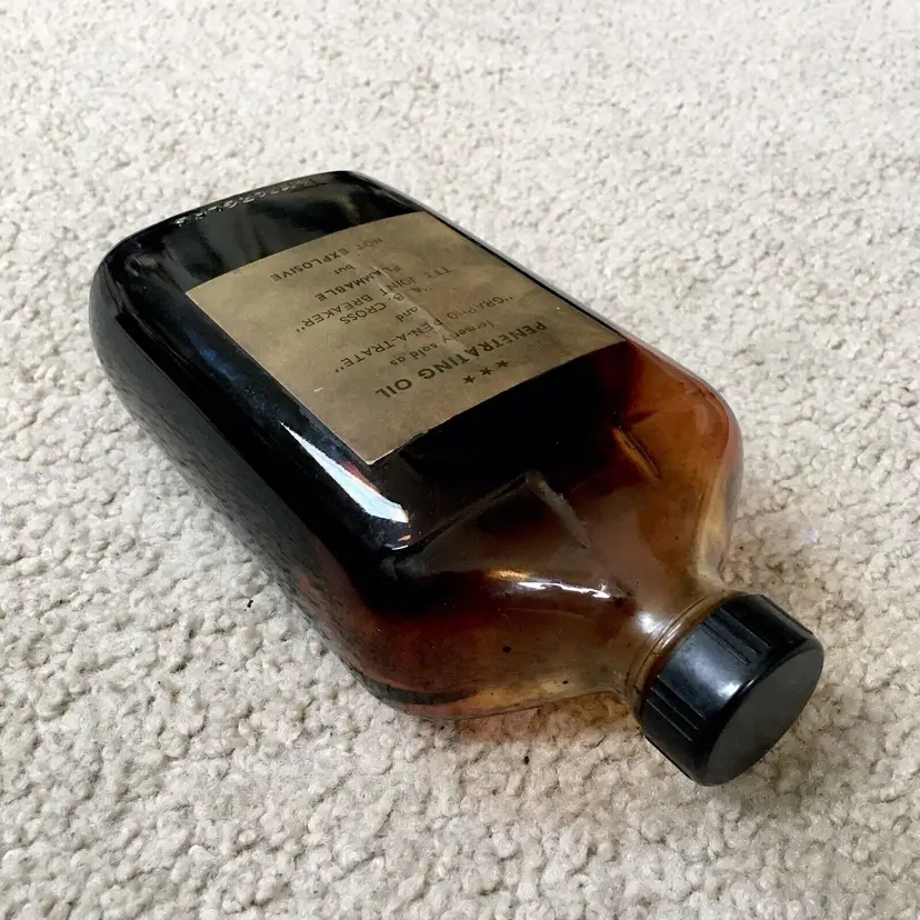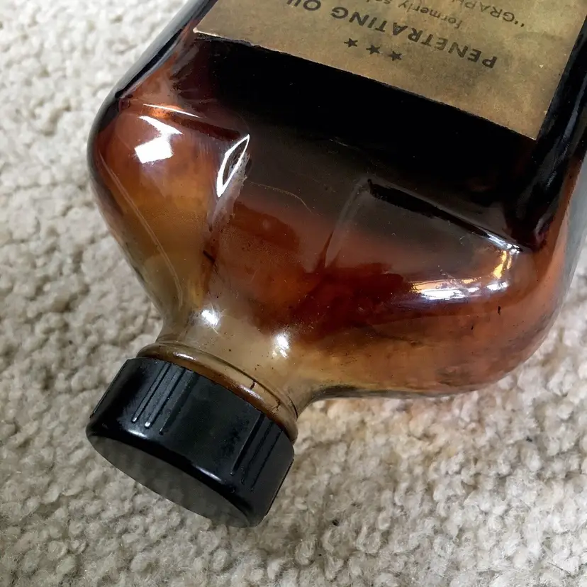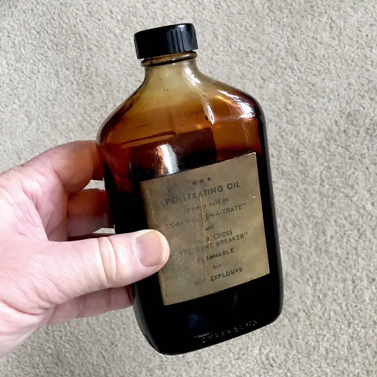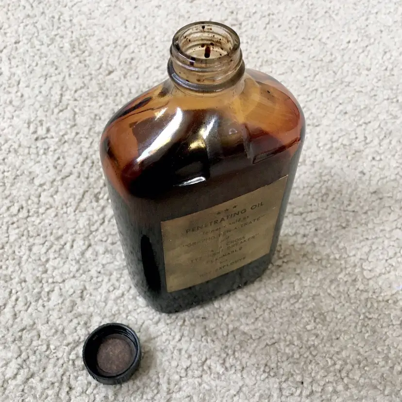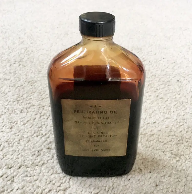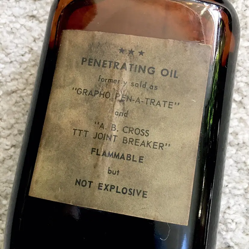 Very rare item for your gas and oil collection!! Vintage PENETRATING OIL formerly sold as “GRAPHO PEN-A-TRATE” and “A.B. CROSS TTT JOINT BREAKER”. Not sure where this company was located and have not found another one of these listed anywhere. Very good overall condition with no chips or cracks to the empty Temperglas bottle. Plastic lid unscrews as normal. Paper labels front and back are intact with some wear from age and handling as shown. Wrinkle to front label. Bottle measures about 6 7/8” high. See pics for more details.