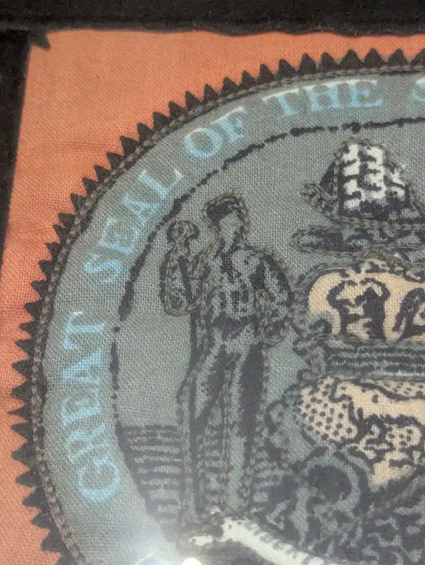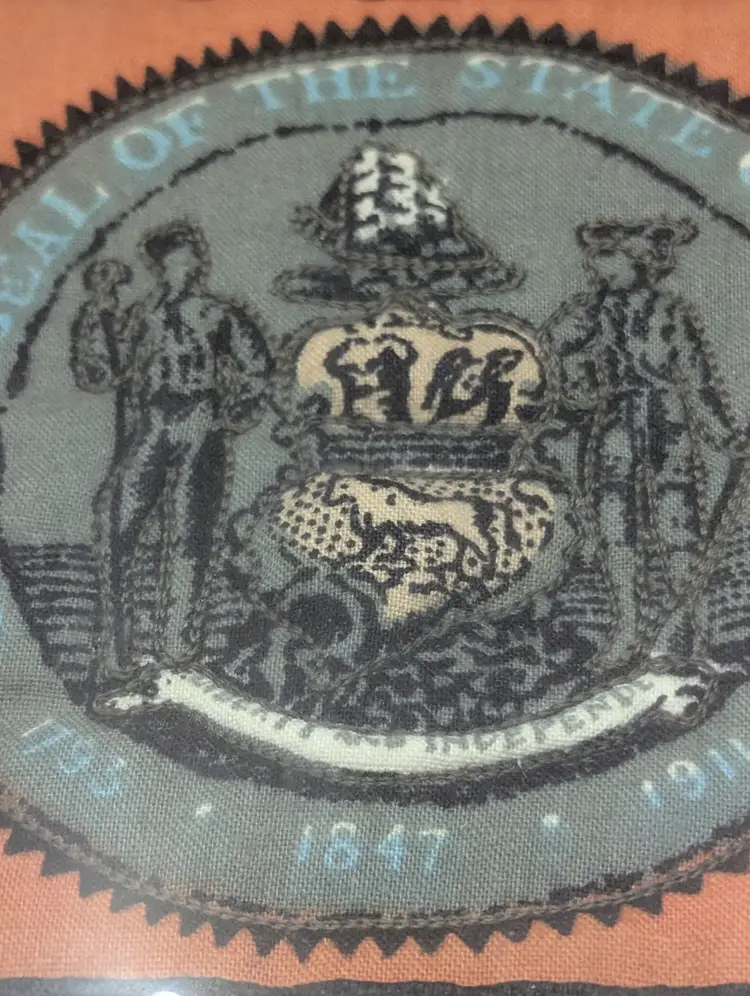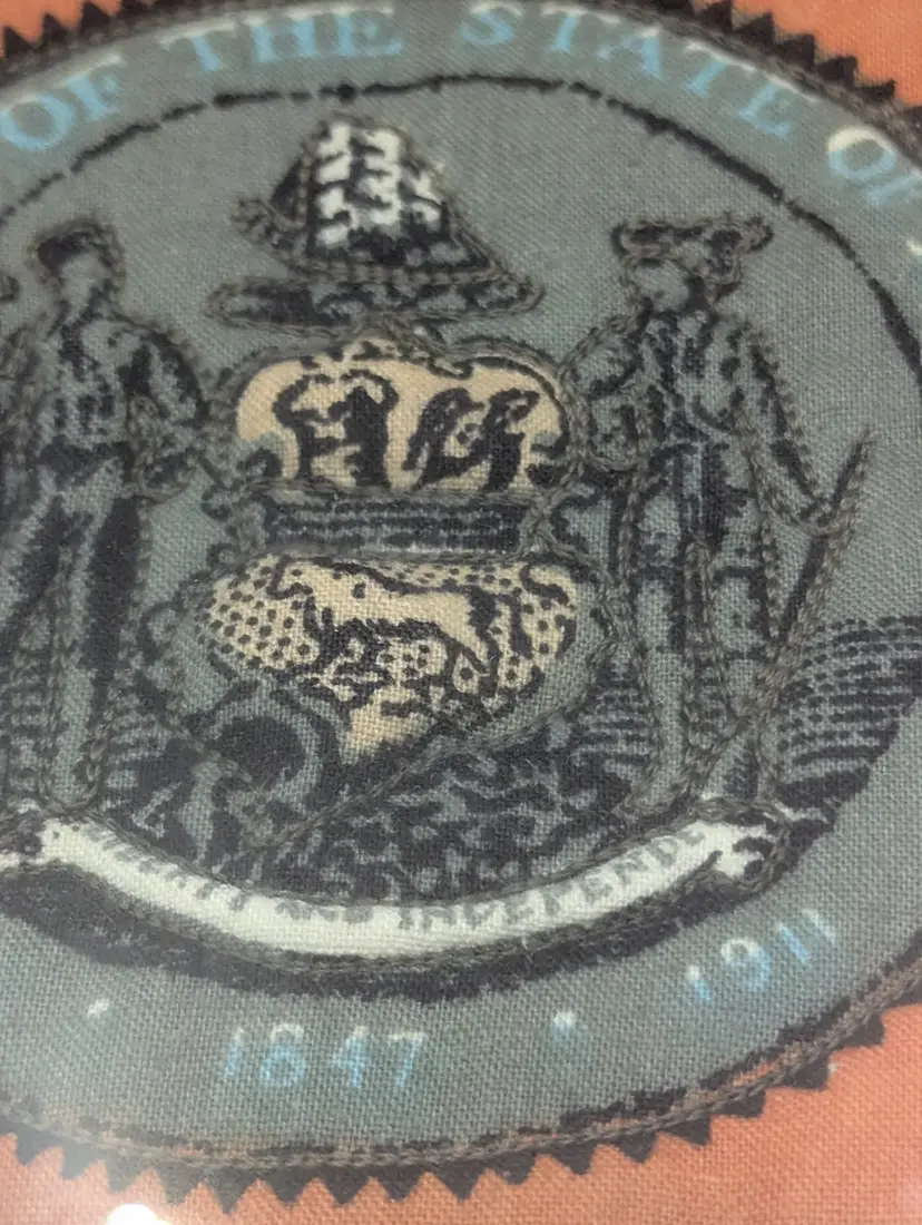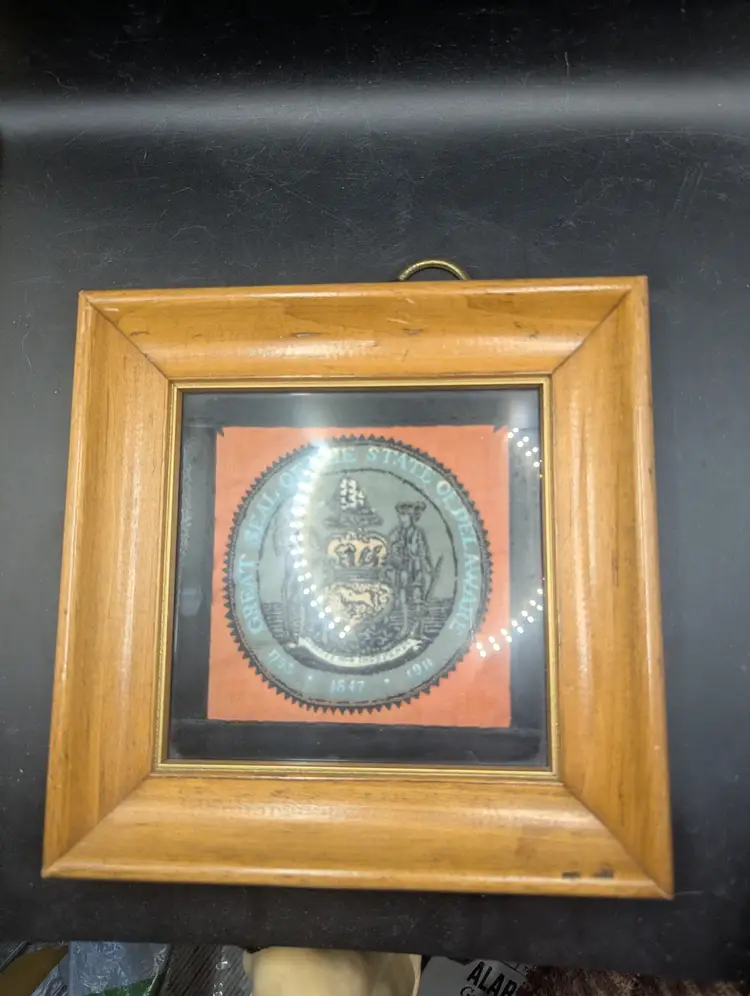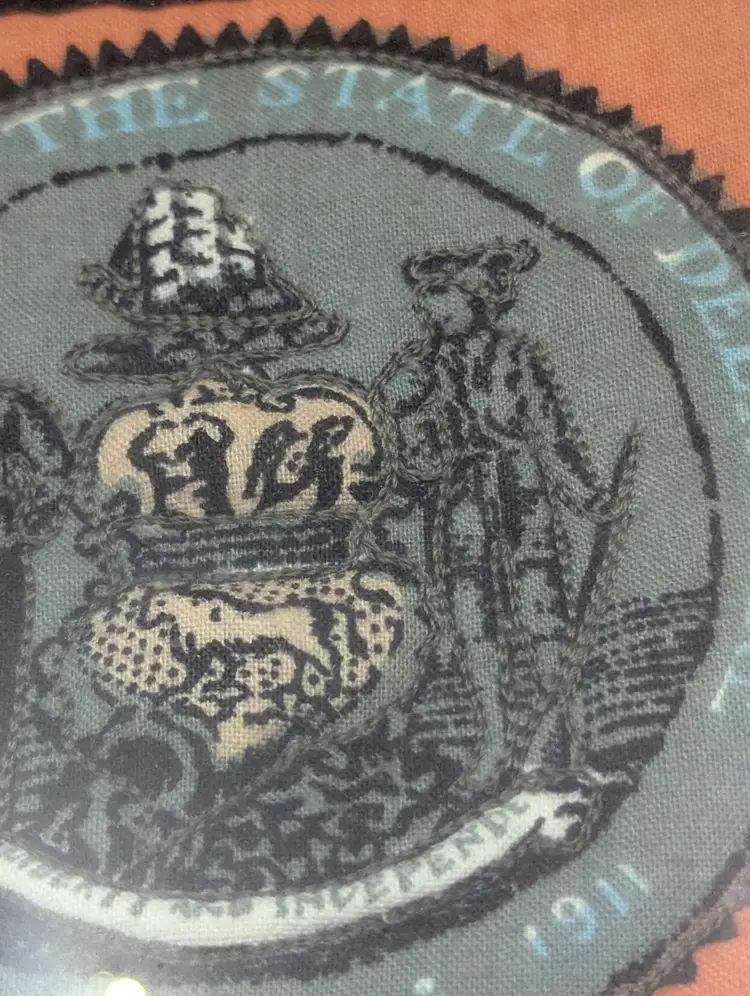 This is a fantastic Vintage Great Seal Of The State Of Delaware Quilted Under Glass And Frame. I believe it was something manufactured in the Mid Century by a company who did other states. I have found a New Jersey framed identical for sale. That is really all I know about this piece. Great piece for any history buff. Please see all pictures for condition and measurements.