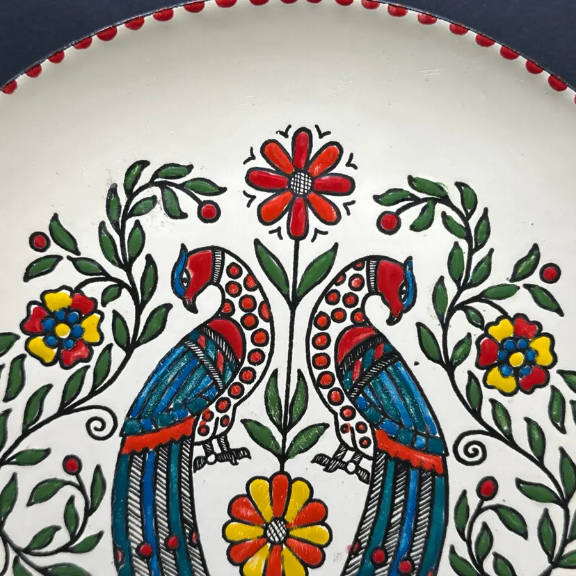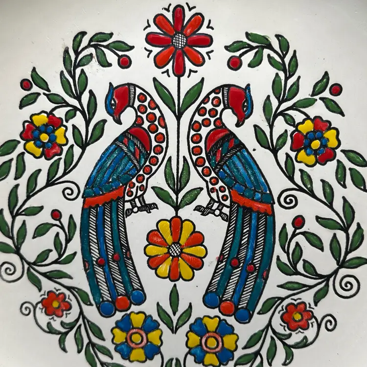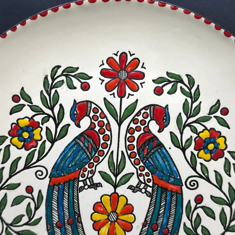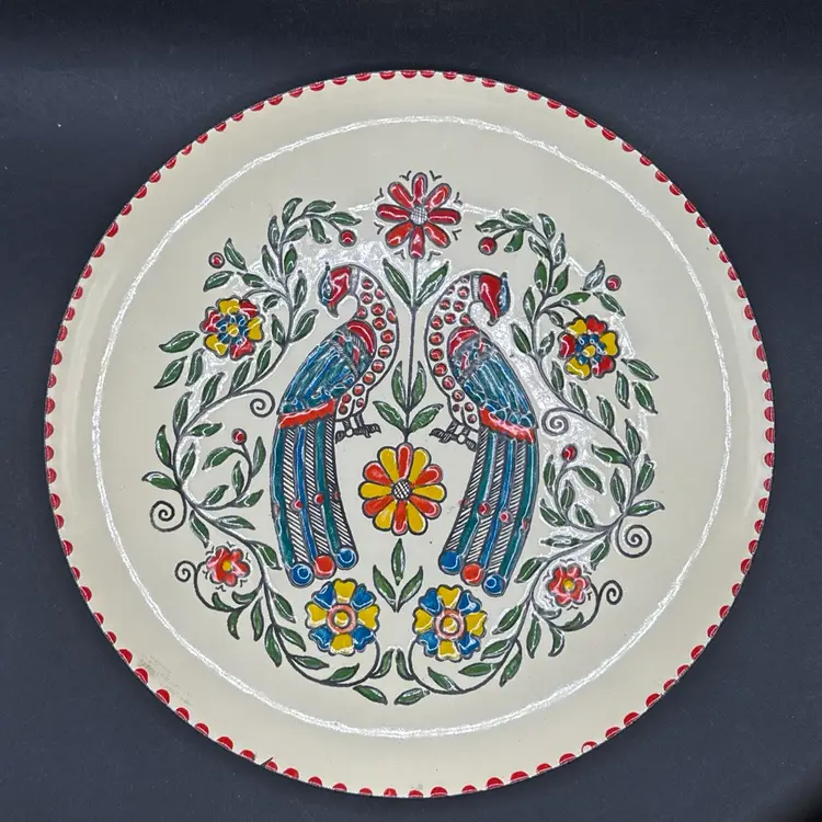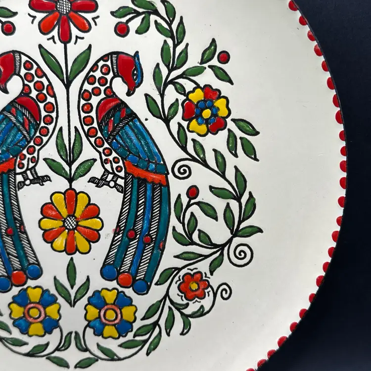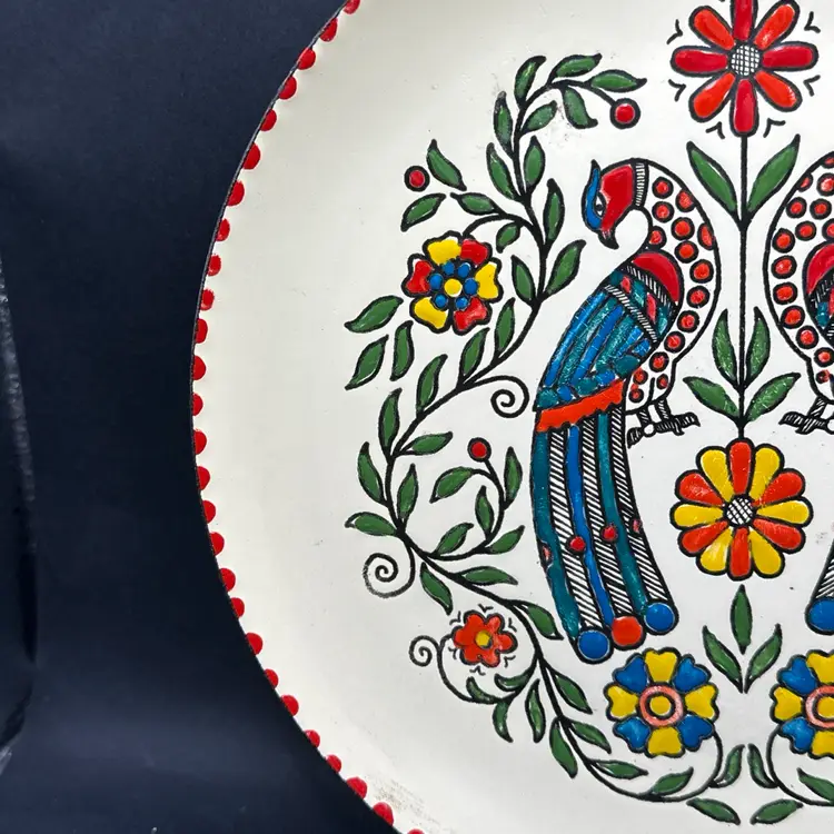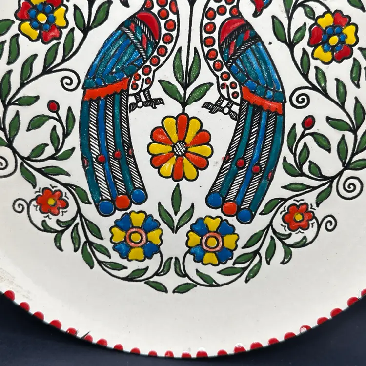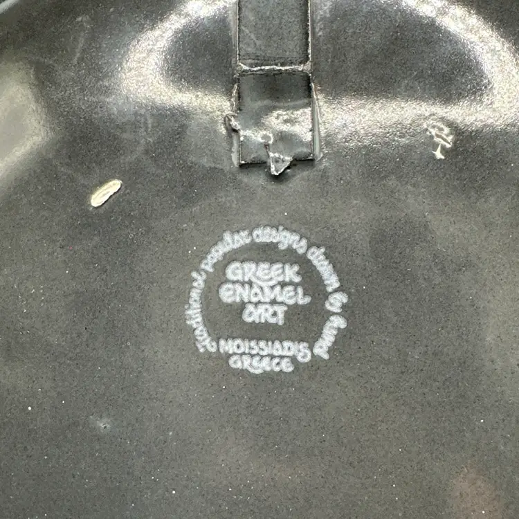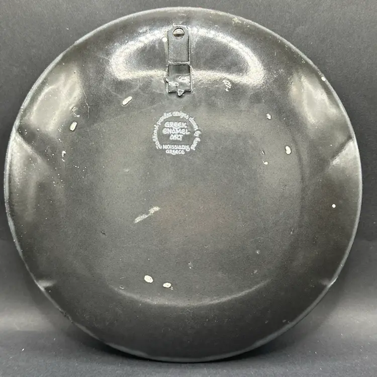 This vintage Greek Enamelware Art Plate by Moissiadis Greece features a colorful bird-themed design, perfect for all occasions. The decorative plate has a diameter of 8.25 inches and is made of enamel with a glossy finish, reflecting a mid-century modern style. Its break-resistant feature adds durability, making it a unique and charming addition to any home decor collection. Made in Greece in the late 20th century, this original piece exudes a cottage aesthetic that is sure to draw attention and add character to any room.