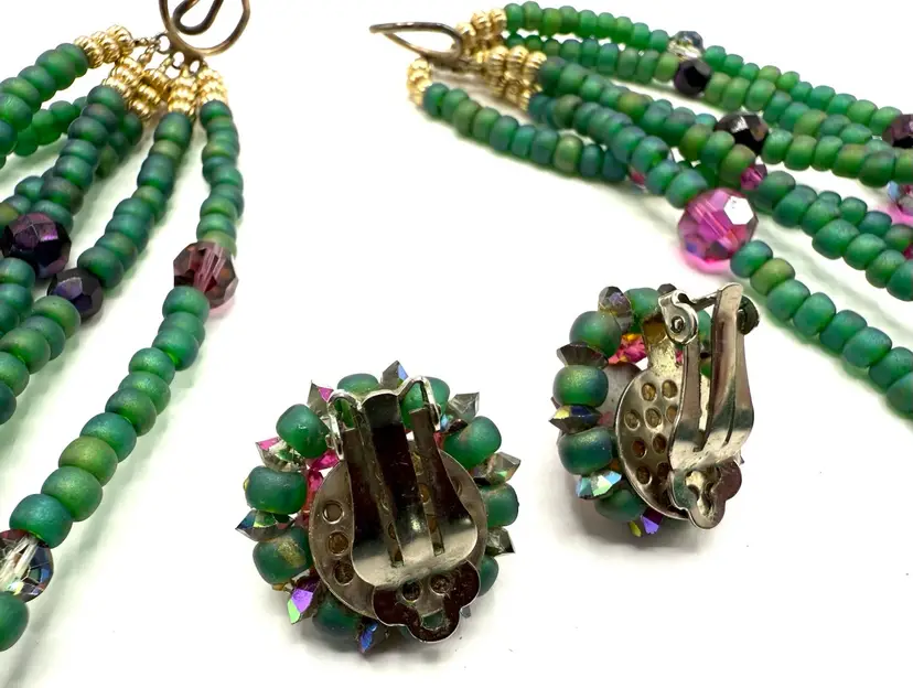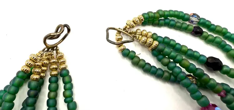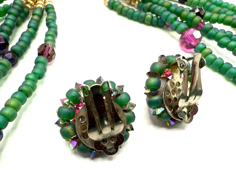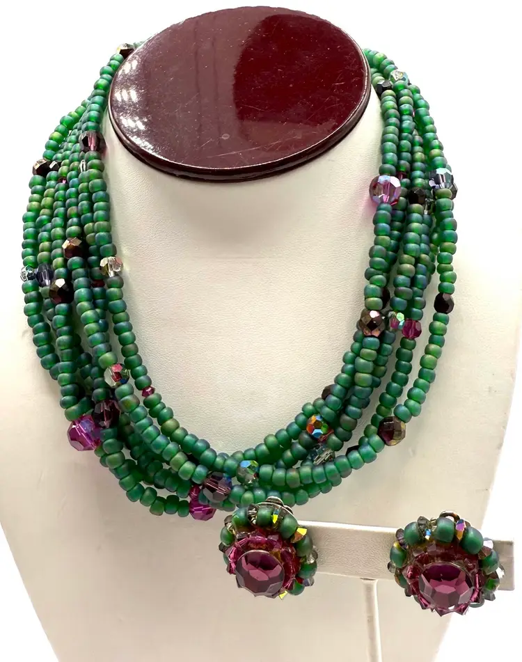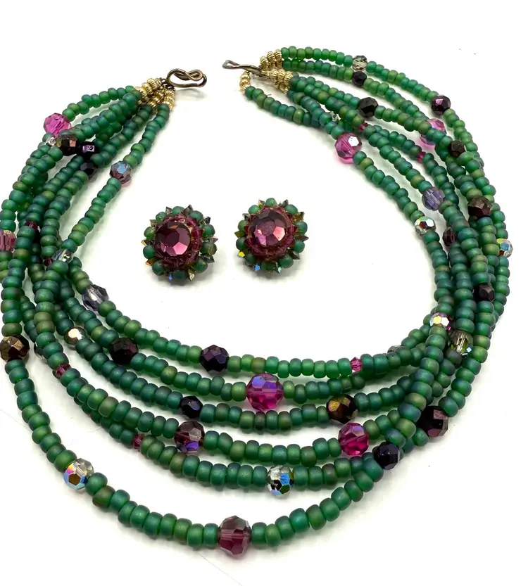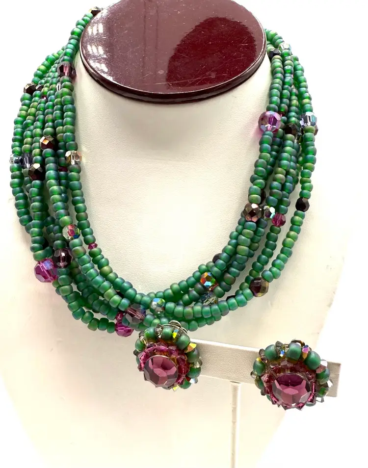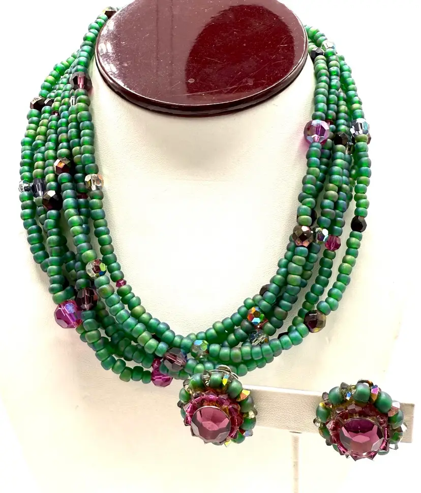 Gorgeous necklace made up of green and purple art glass beads. Interspersed in this 6 strand necklace is larger purple and gold tone beads..From an estate of a locally prominent woman, this necklace has 6 strands of art glass beads.Frames the neck like a bib necklace. Gold hook clasp. Size: 6 strands - shortest is 16 inches longest is 18 inches Earrings - clip on - green and purple - 1 inches diameter Condition: vintage excellent