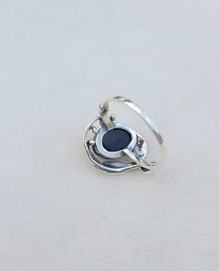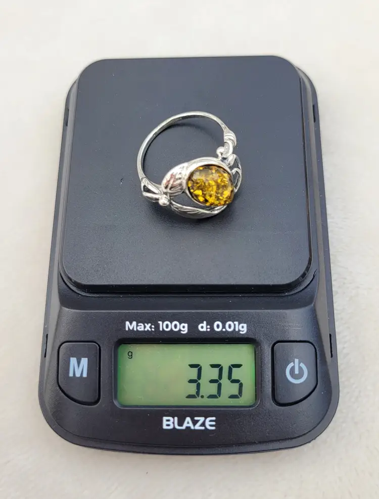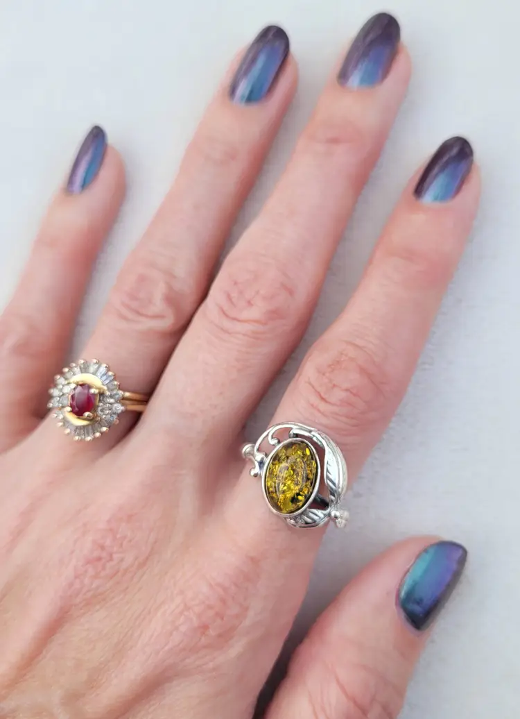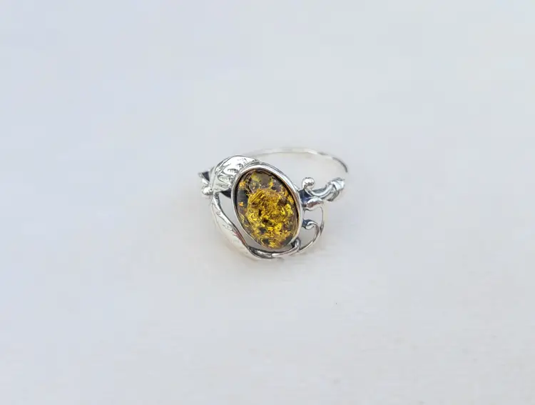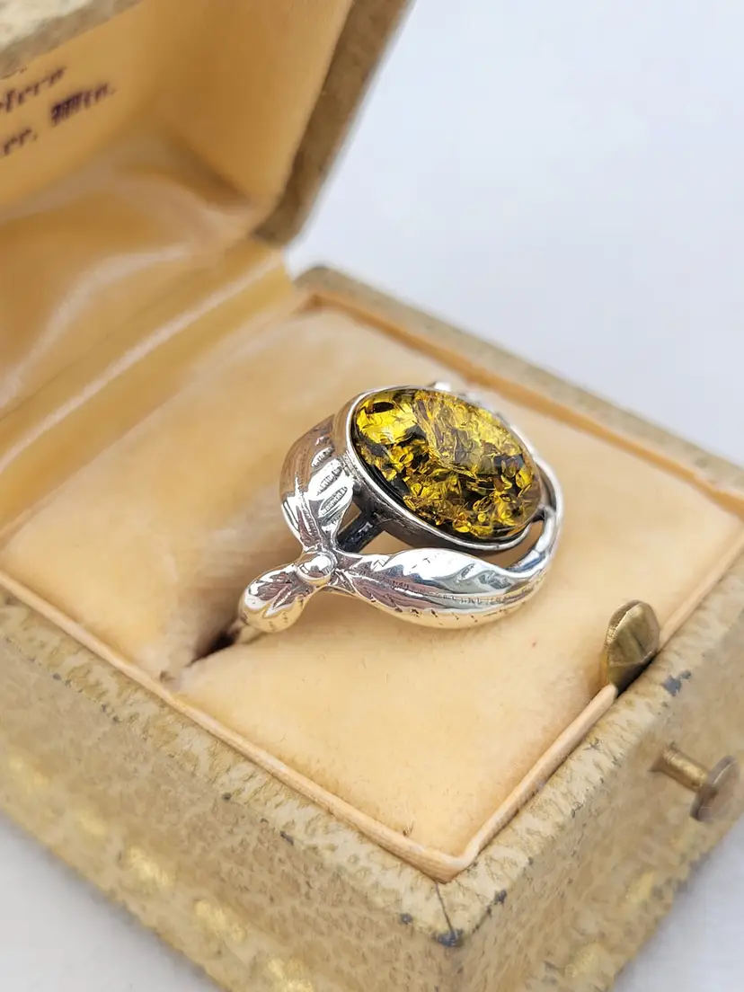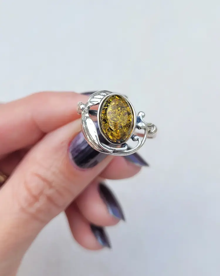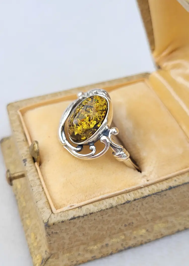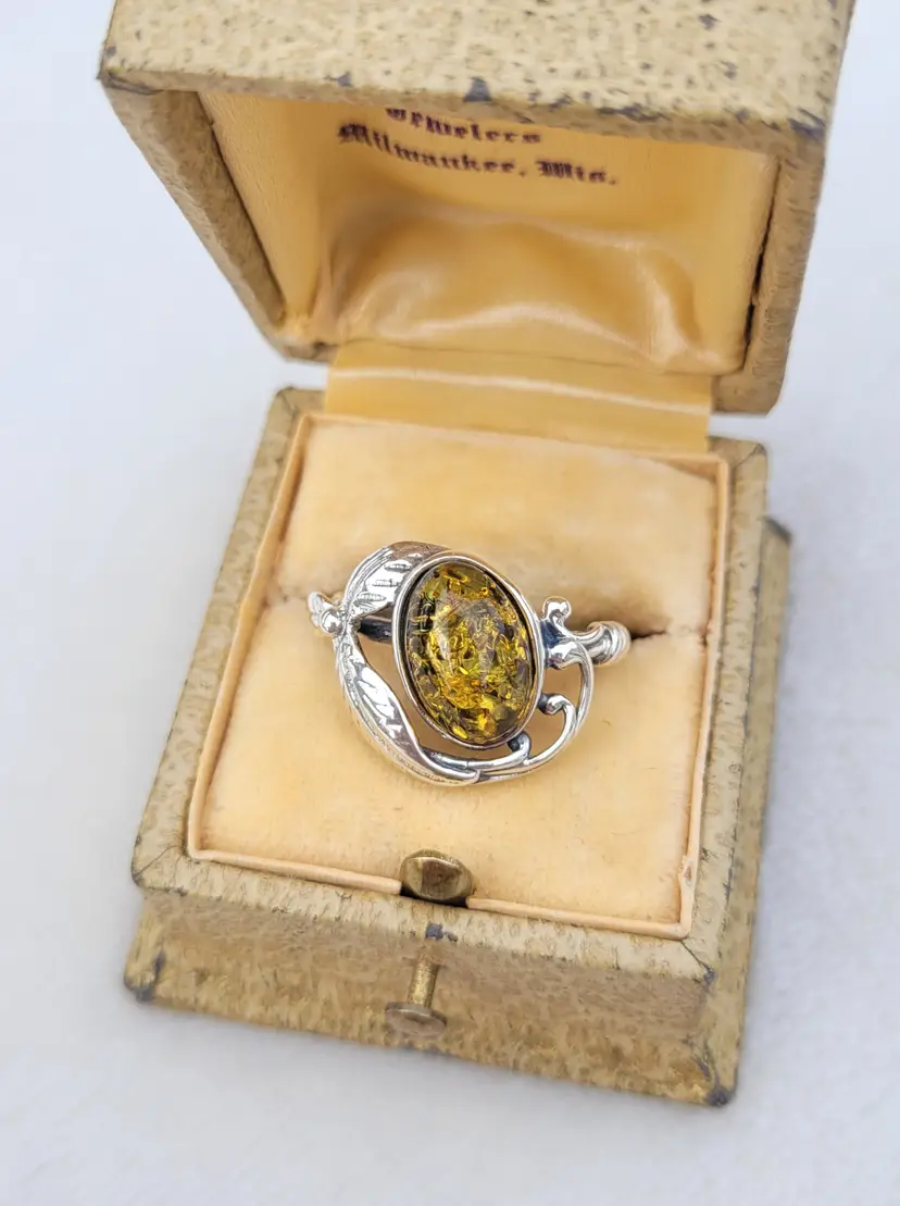 Beautiful green amber cabachon set in a swirling sterling silver design. The metal is unmarked but tests as sterling, and is circa 1990s. This is from an estate and in good condition. Please see pictures for details and measurements, does not include my ring box.