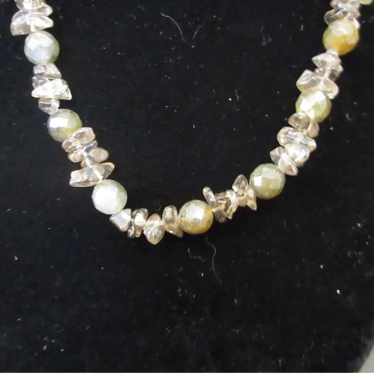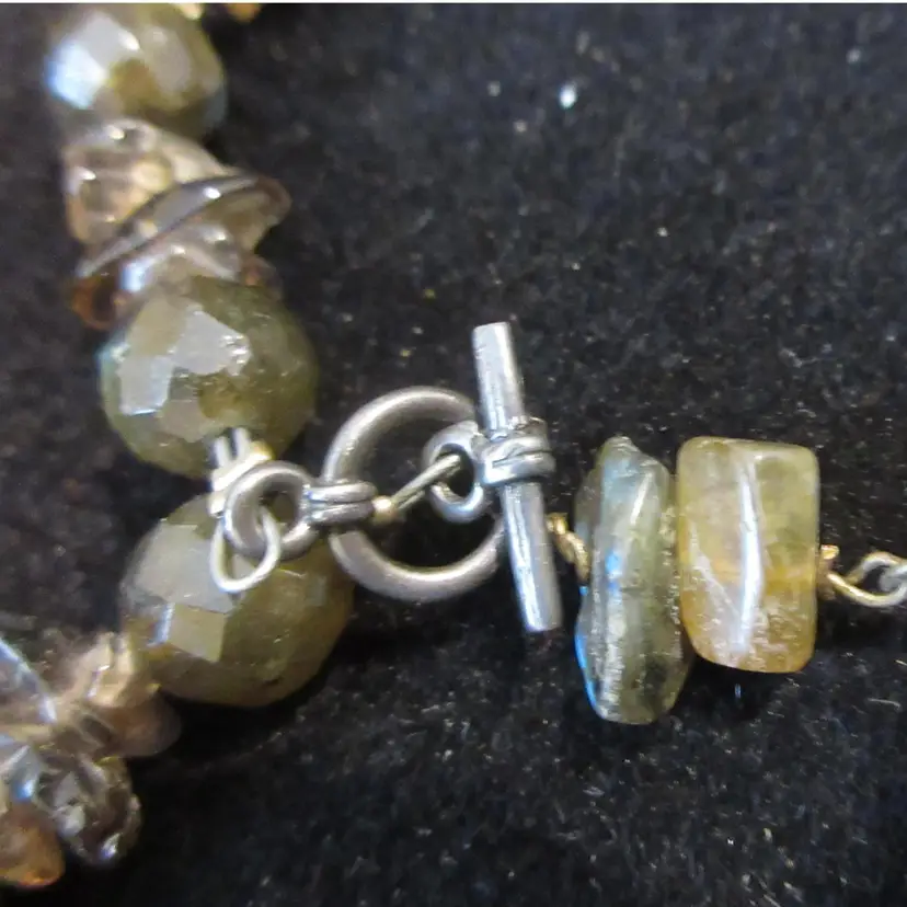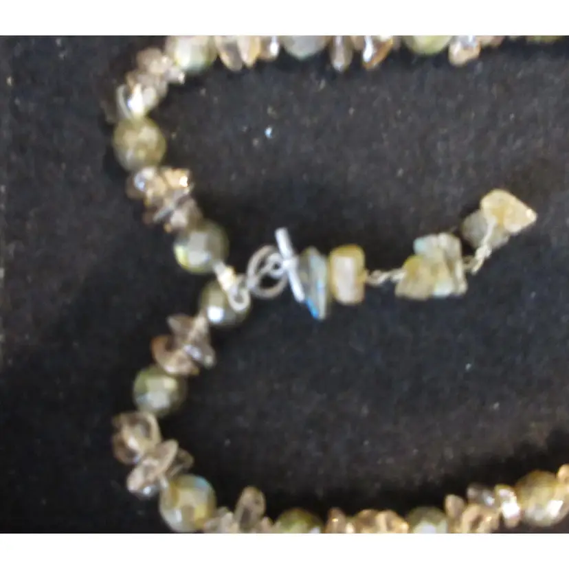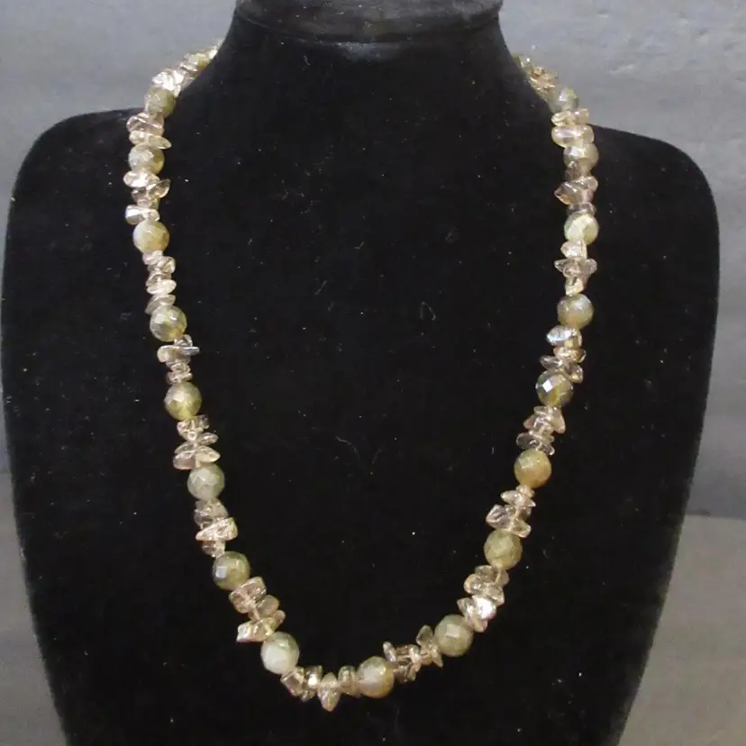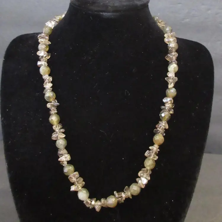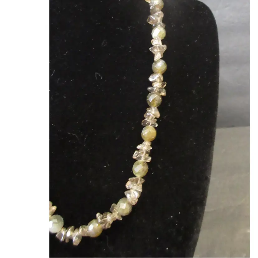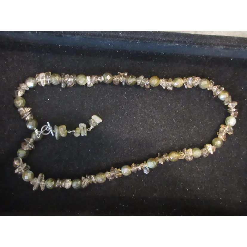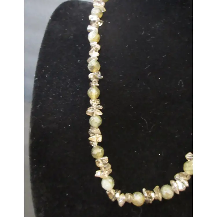 This is a BEAUTIFUL vintage agate nugget and glass bead necklace. The agates are beautiful in green and gray tones, and are naturally shaped as nuggets. The glass beads are geometric spheres, and are in green tones. The necklace ends in a toggle clasp that is made of sterling silver and is marked "925". It is about 17 inches long, and has a dangle down the back of about 1.5 inches.