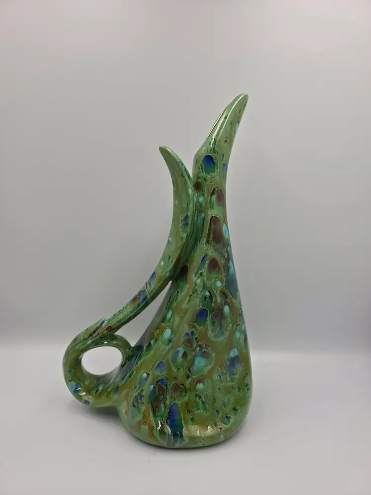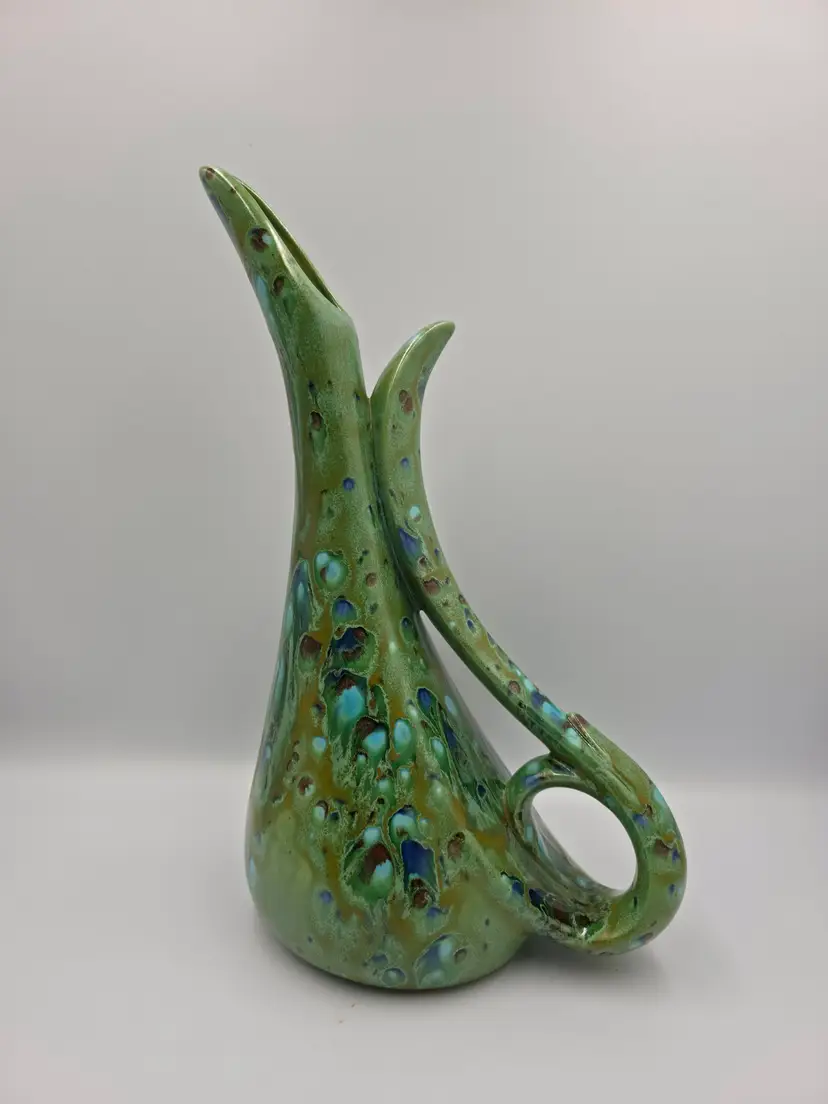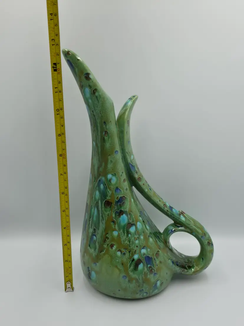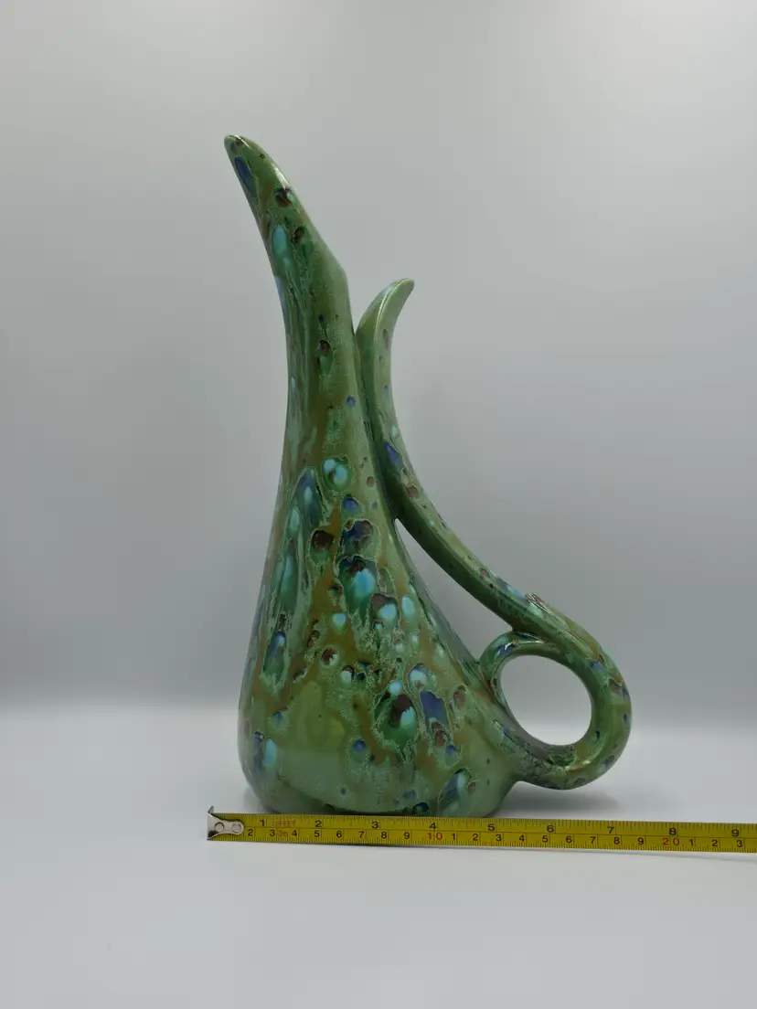 I absolutely love this piece af art pottery! The glaze combines green, turquoise, and brown tones, giving it a vibrant, textured appearance. MCM style artistic curved handle and teardrop shaped spout. Initials written on bottom. Measures just under 13 inches tall, 7.5 inches wide and 4.75 inches deep. It is in great condition no chips or cracks. Thank you for looking and have a great day!