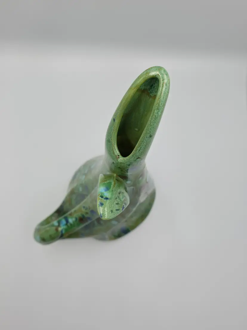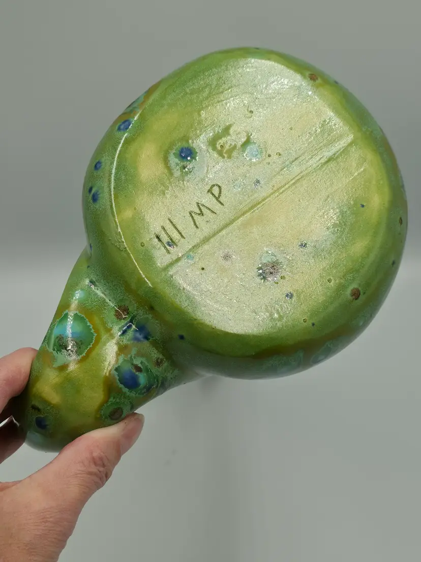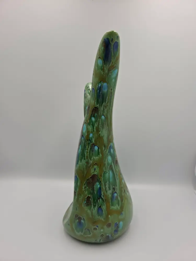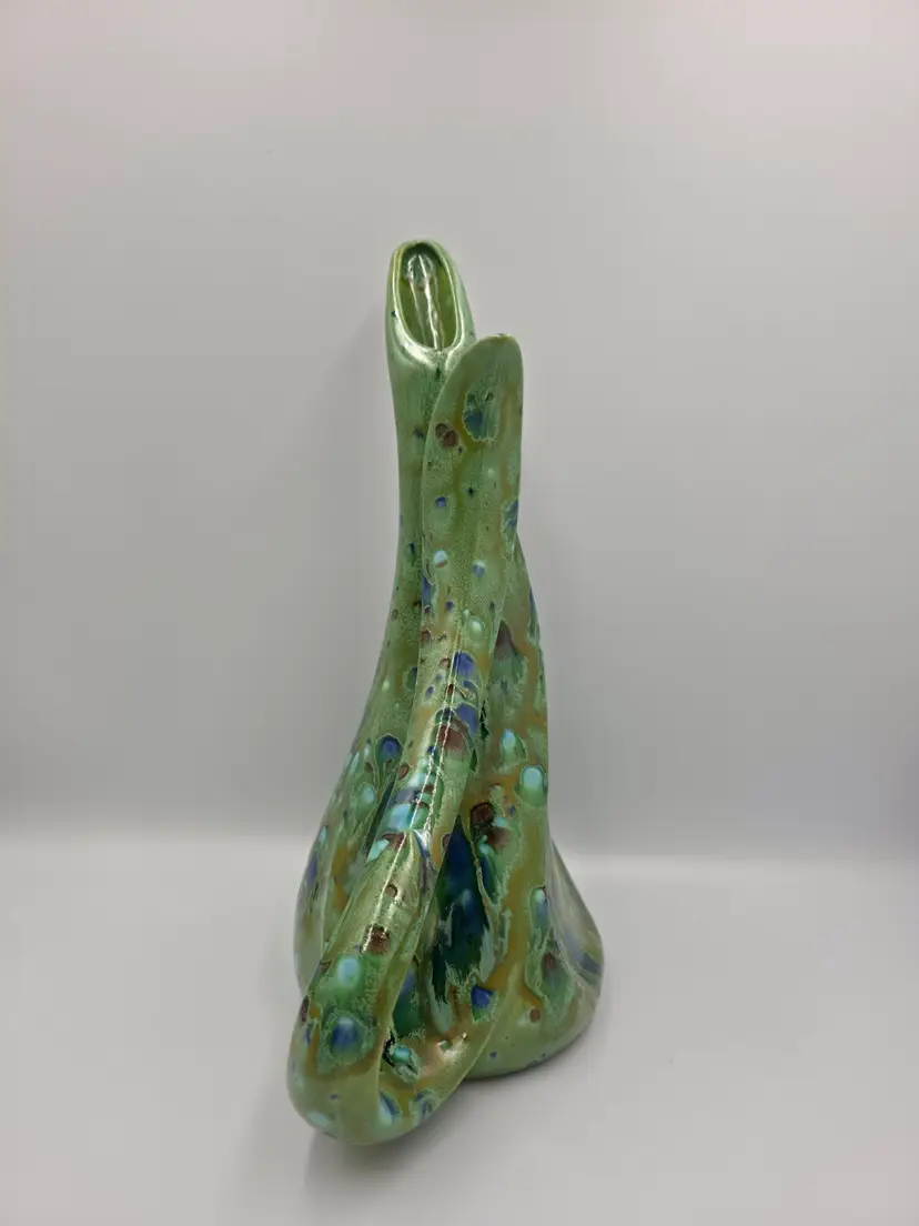 I absolutely love this piece af art pottery! The glaze combines green, turquoise, and brown tones, giving it a vibrant, textured appearance. MCM style artistic curved handle and teardrop shaped spout. Initials written on bottom. Measures just under 13 inches tall, 7.5 inches wide and 4.75 inches deep. It is in great condition no chips or cracks. Thank you for looking and have a great day!