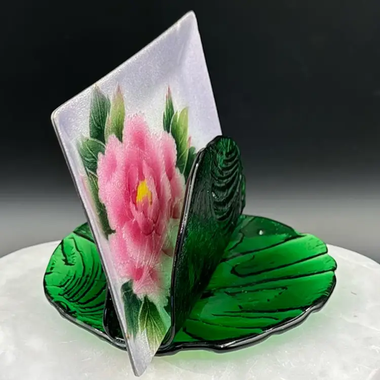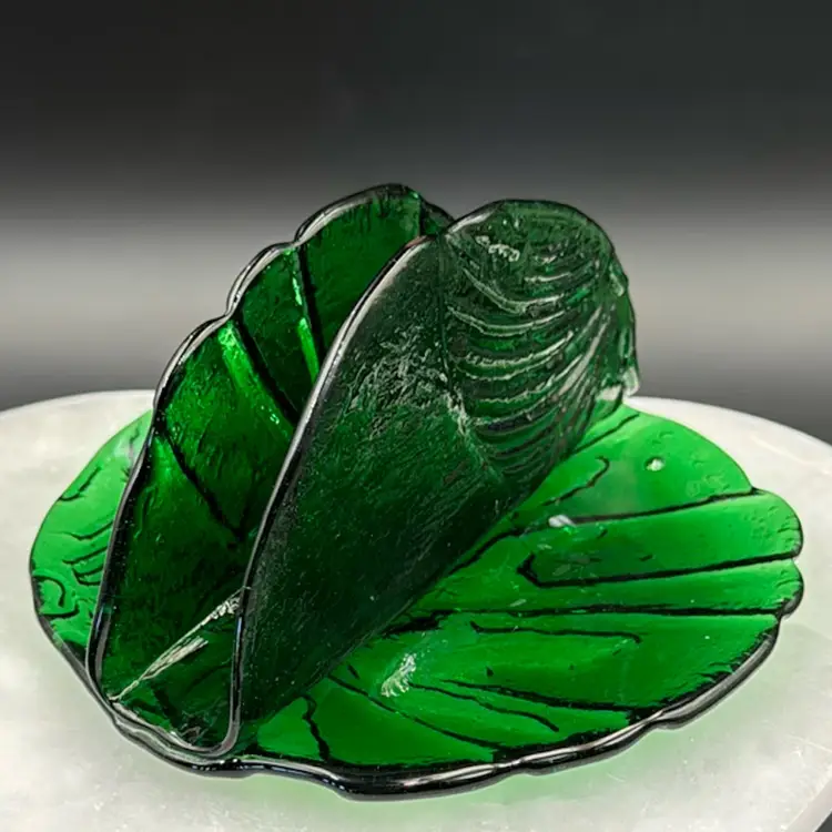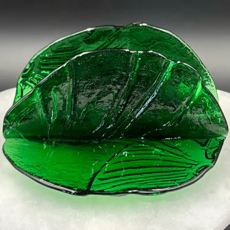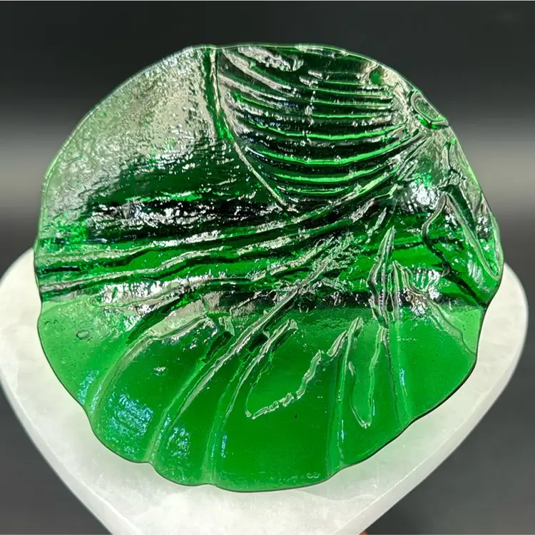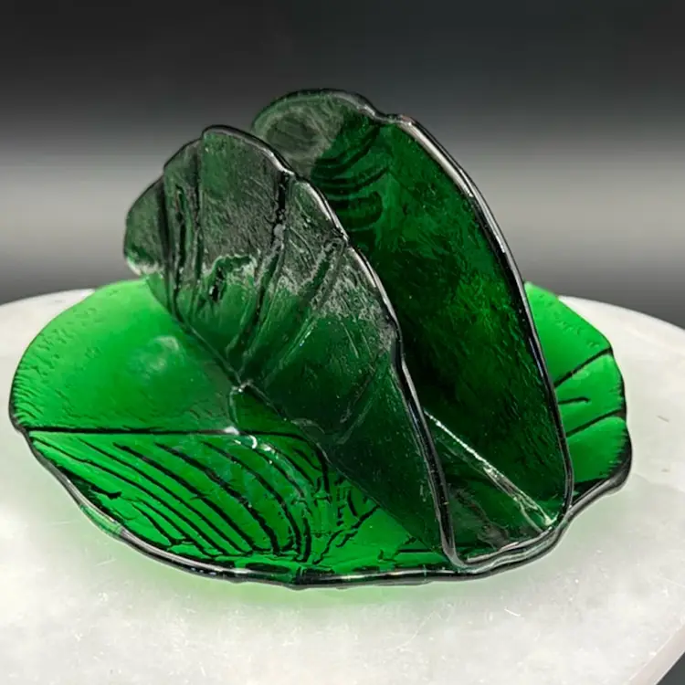 6”R 3”T no chips cracks are brakes in wonderful vintage condition has no makers mark. It’s a very beautiful piece of art glass that holds paper napkins.