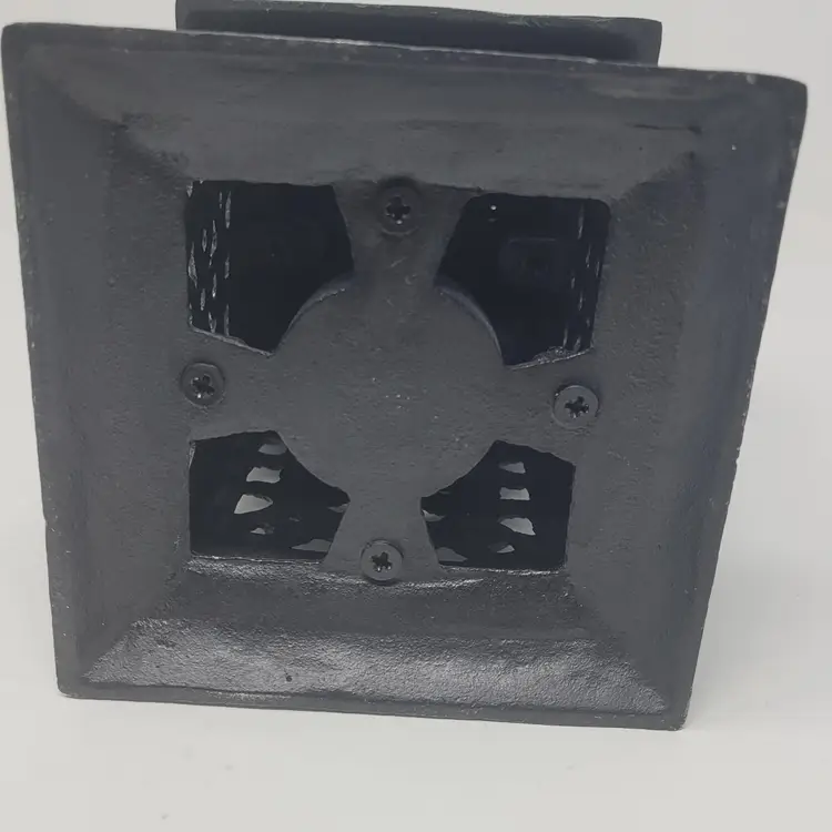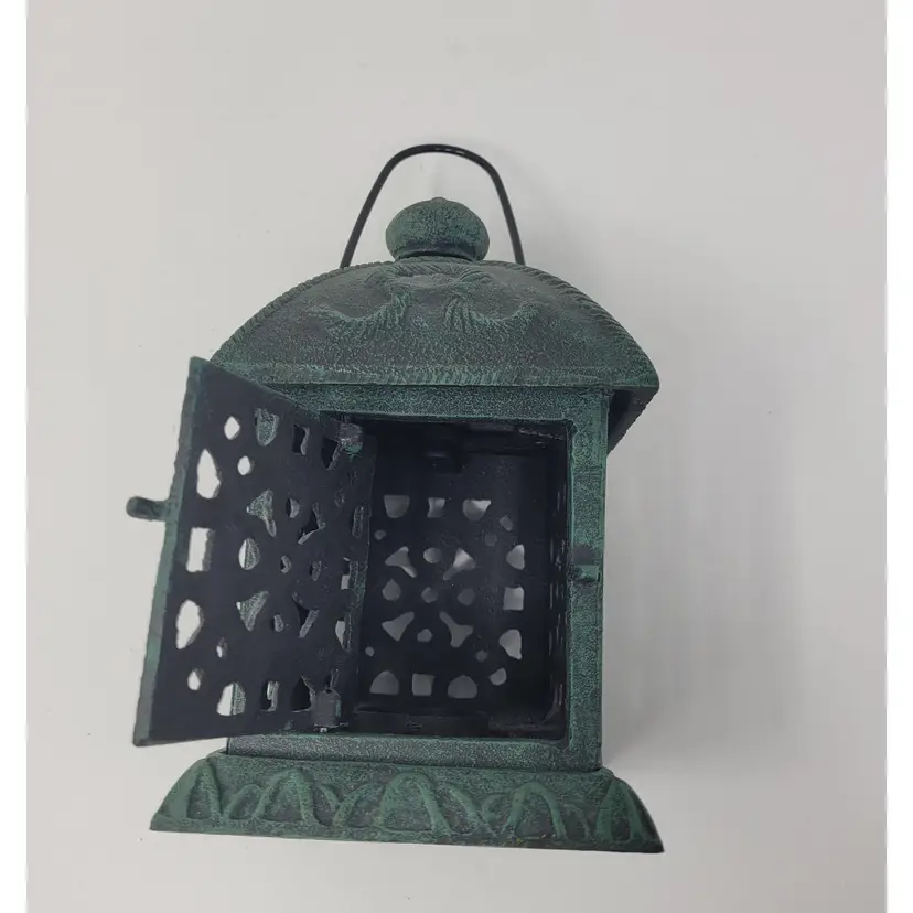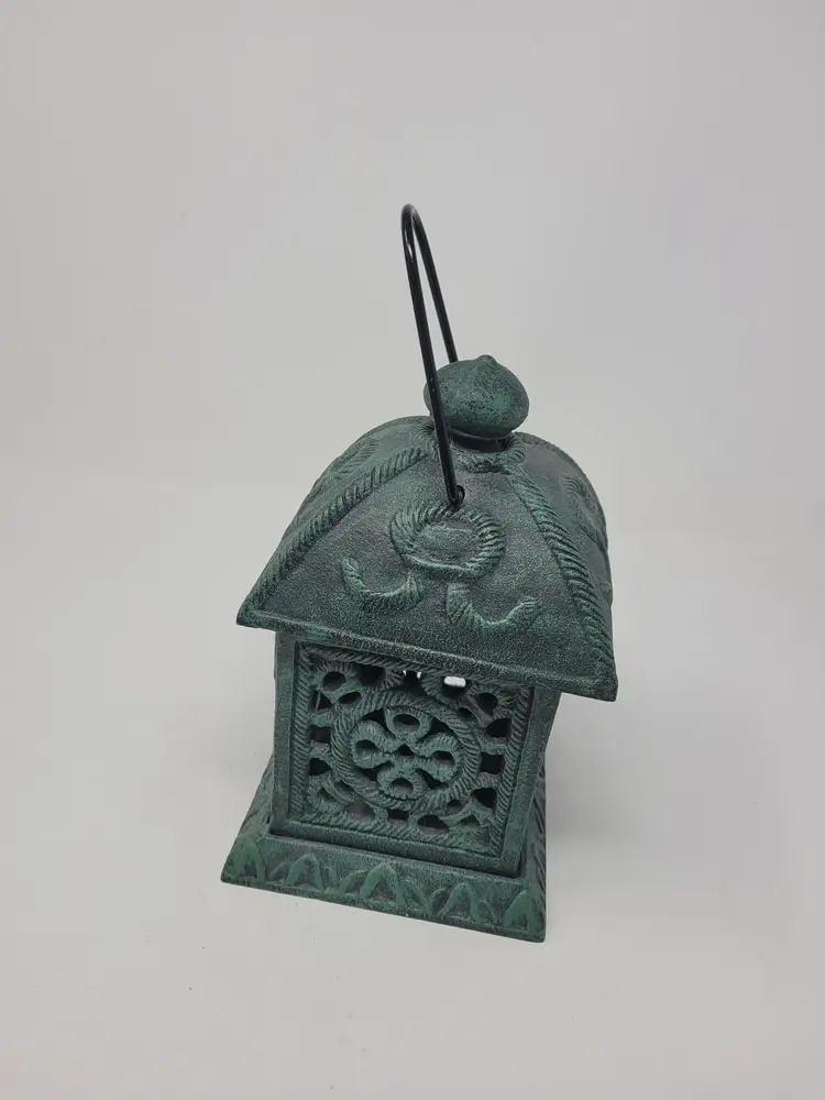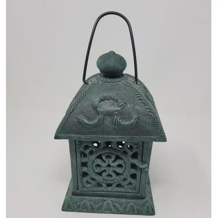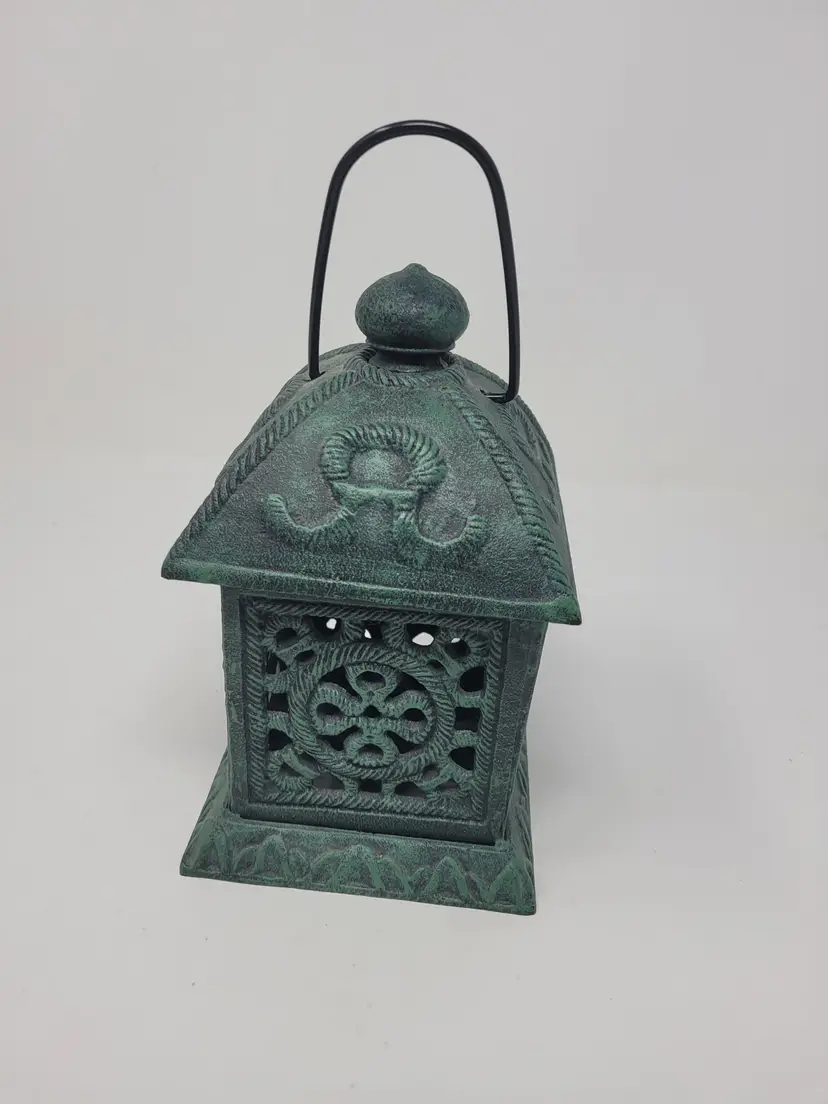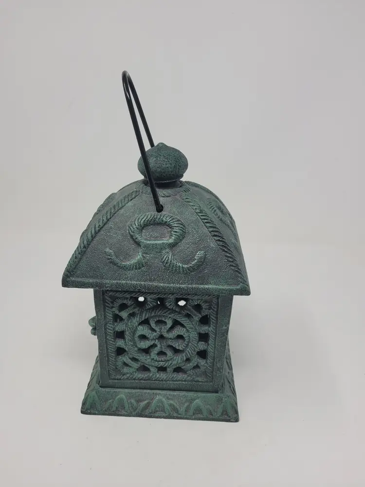 This charming vintage lantern is crafted from cast iron and features an intricate floral design. Perfect for adding a rustic touch to your decor or as a unique collectible piece. Measures approximately 8 inches in height.