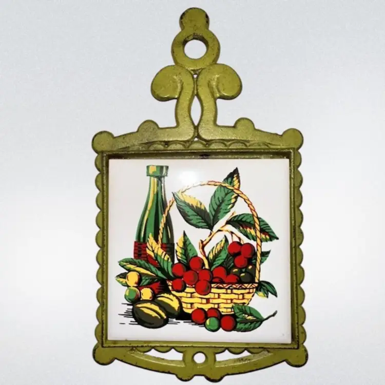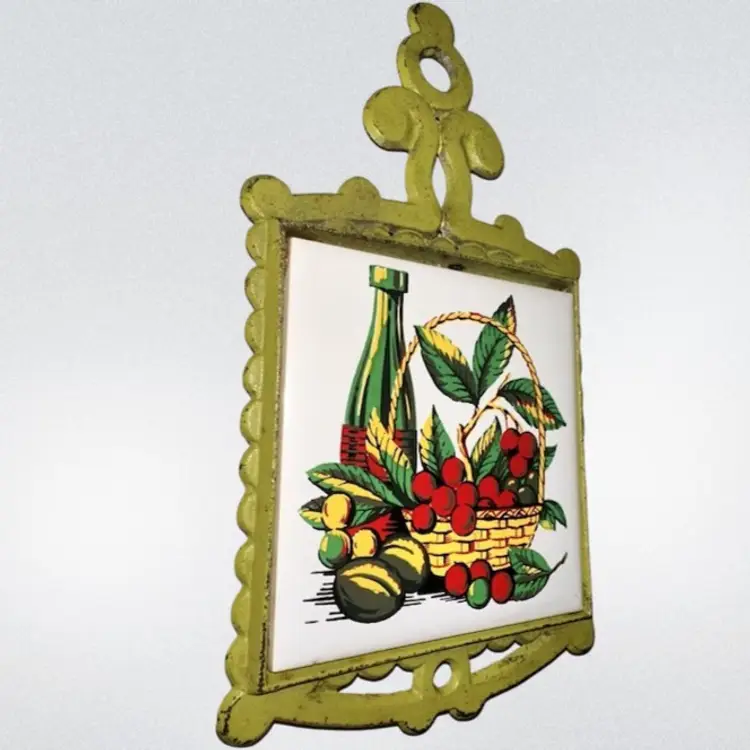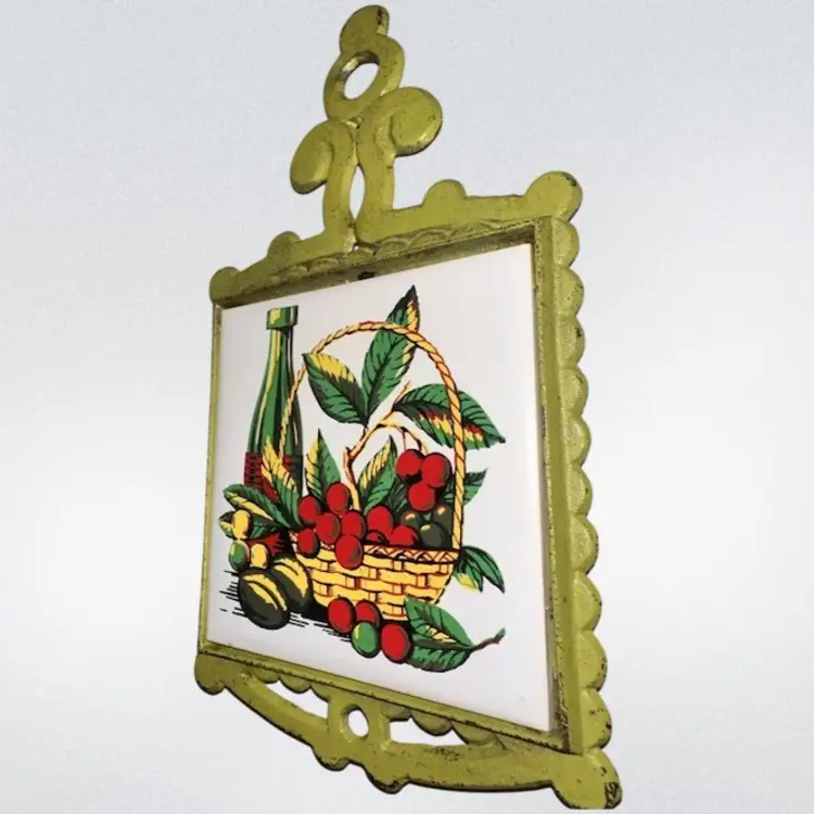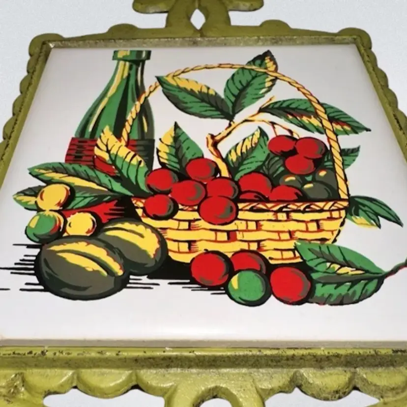 Vintage Green Cast Iron TILE Trivet Pot Holder JAPAN Basket Of Cherries 9 1/4” tall x 5 1/4” wide Cherry brand tile Some wear on green paint, but love it the way it is.