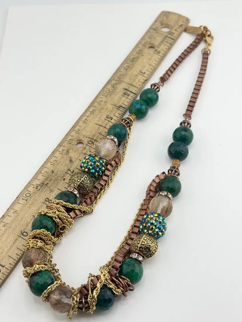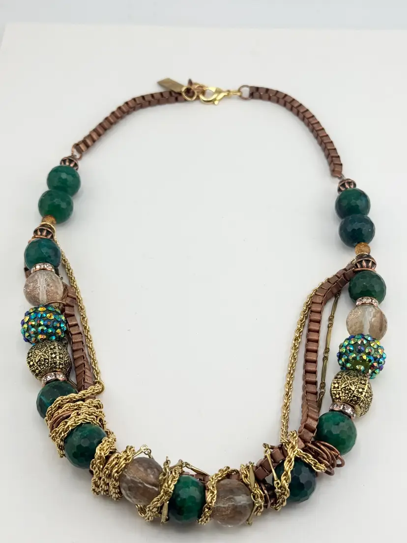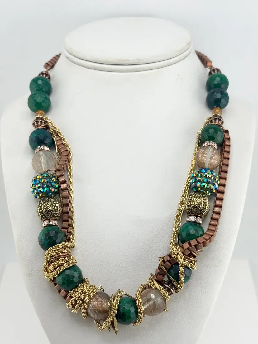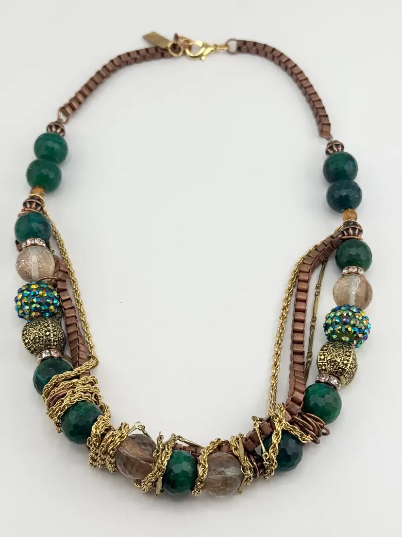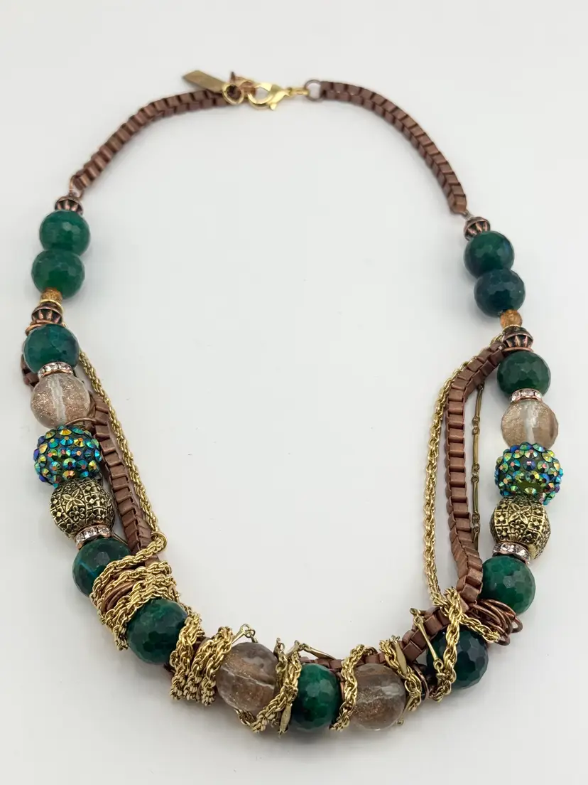 Vintage green crystal glass and rhinestone chain collar necklace. Hanging chains gold and brass tone, box chain with extension at end. Gold tone beads, glass beads, rhinestone beads, crystals and rhinestones. Full beaded chain collar necklace. MN54FF.