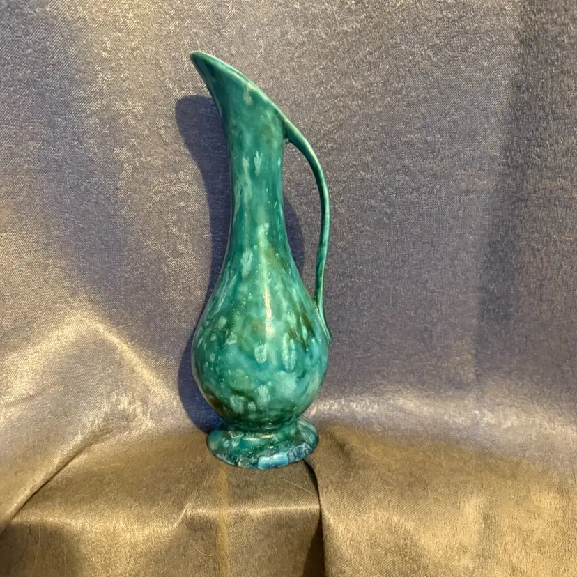 This vase is likely from the 1950s. These vases are known for their distinctive drip glaze finish and are considered classic pieces of American pottery. The vase pictured has a green, mottled glaze and a curved handle. It stands approximately 9 inches tall.