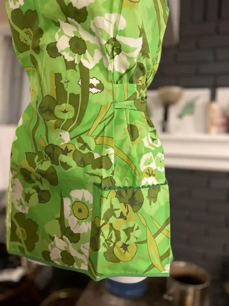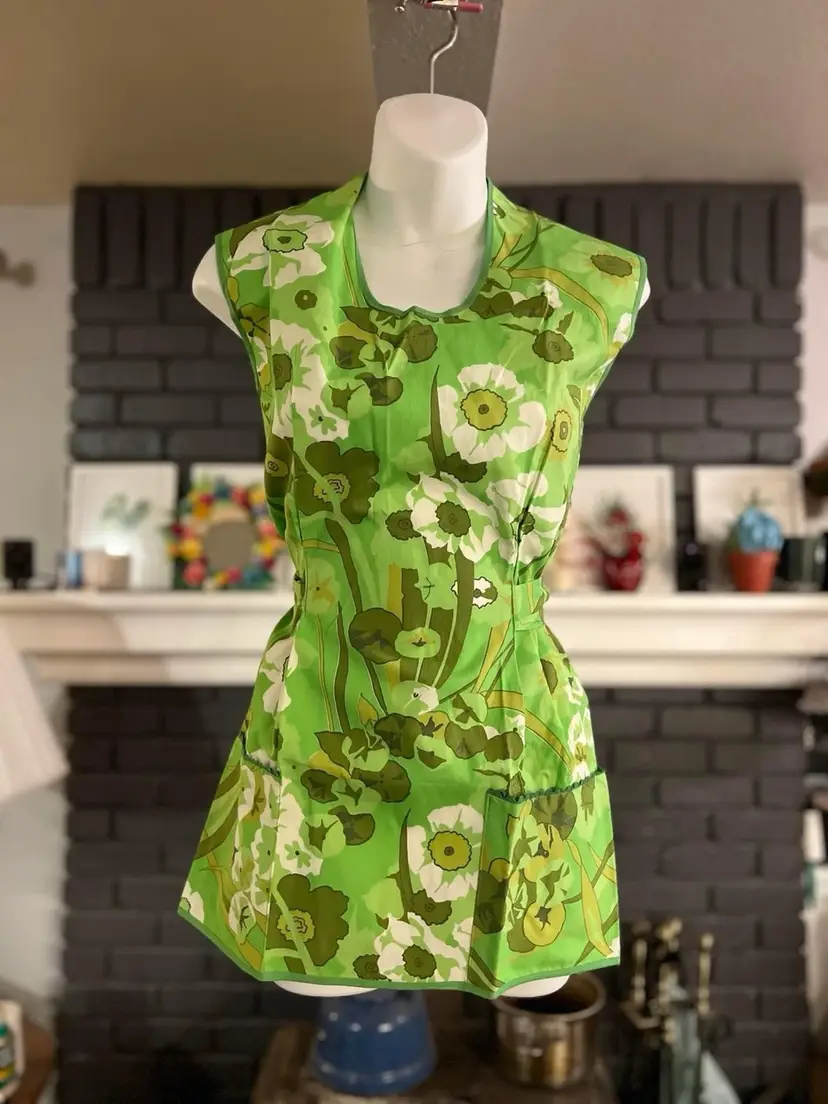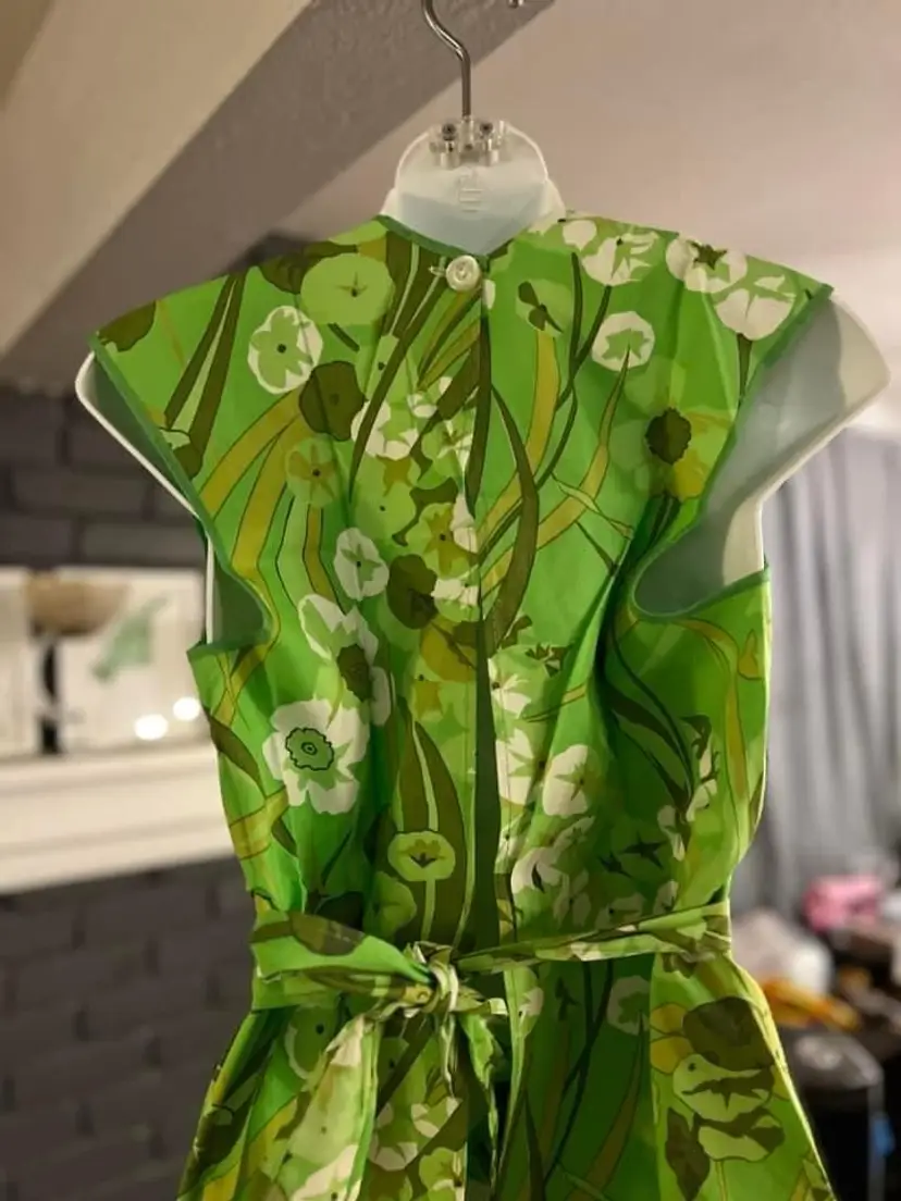 π: sleeveless green floral design . Button at neck and waist belt closure. One pocket. 28β long and open otherwise. EVC