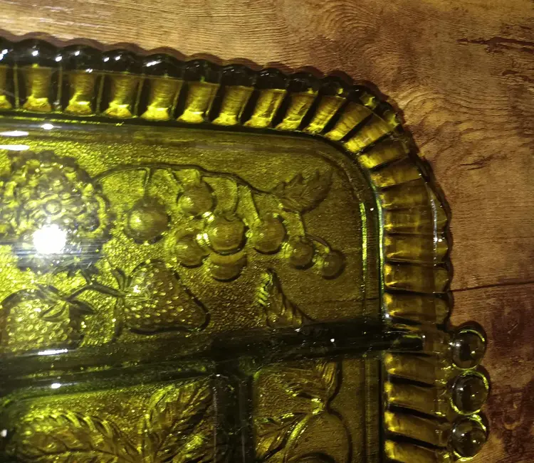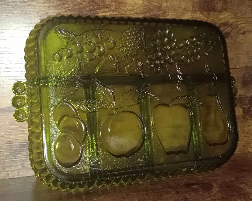 Vintage green glass fruit platter. One corner is chipped, see photos, good condition otherwise, Chip is not sharp, very smooth. It measures approx. 12.5x9 inches.