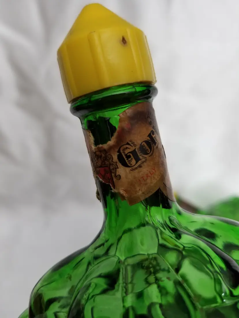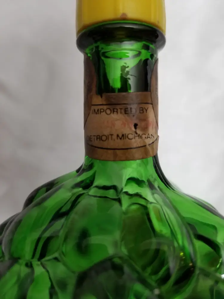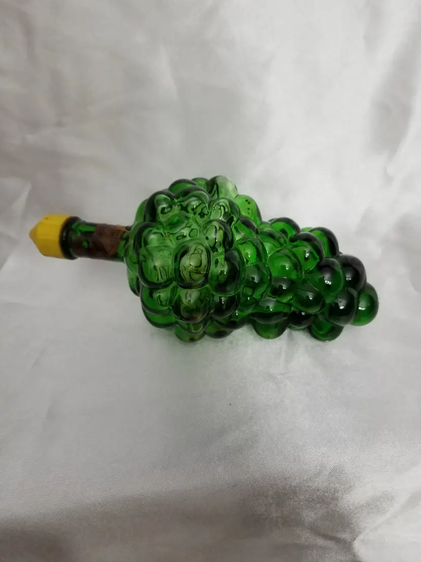 Vintage Green Glass Grape Bunch Wine Bottles - Pair. This is a pair of green glass wine bottles shaped like grape bunches. Both have the remnants of labels around the necks and yellow plastic cap. They are 7 ½” long. No chips, cracks, or repairs. Please view pictures and feel free to ask questions. Thank you for visiting my shop.