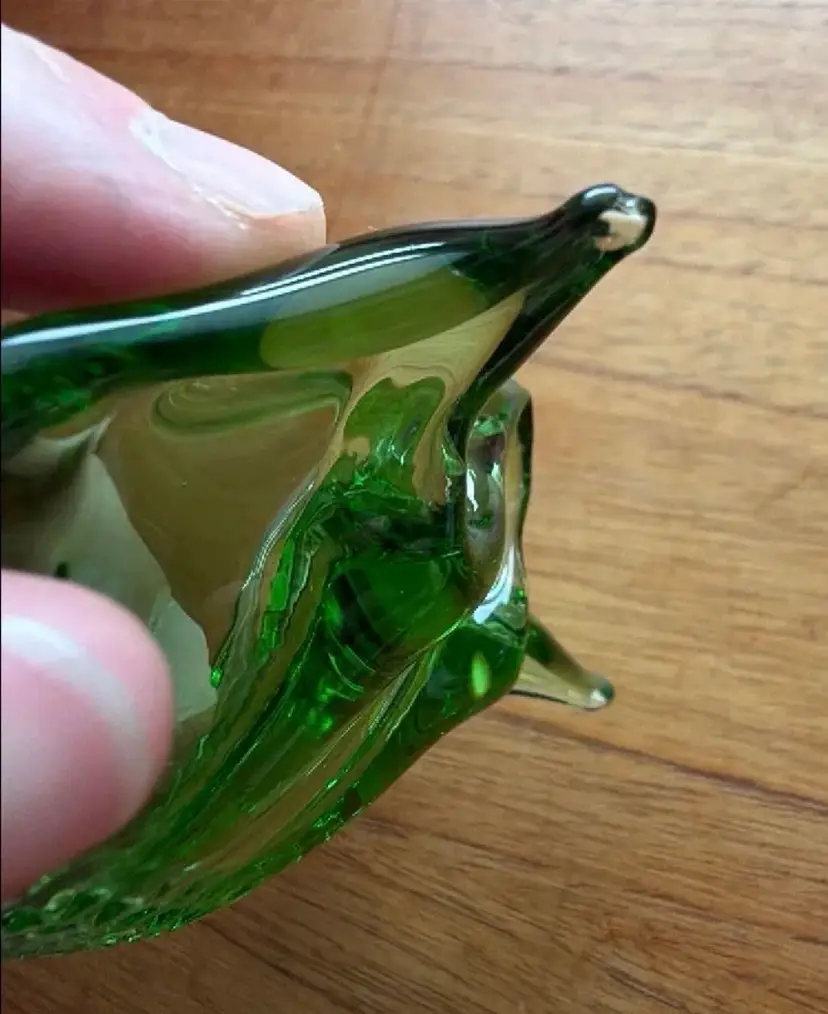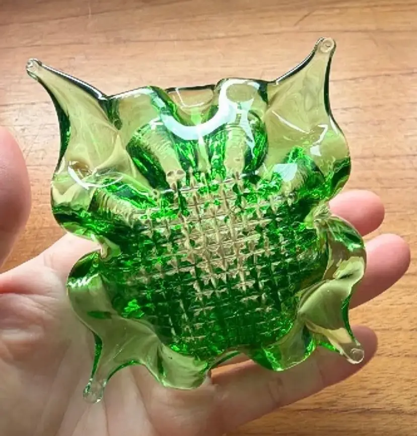 Has a mini chip on very tip on of one corner. I believe it is chalet glass. About 3” diameter