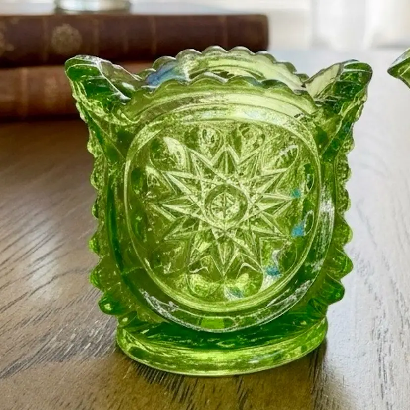 Vintage green glass mini vessel, Indiana Glass in the Sunburst pattern. 2” T & 2” W
