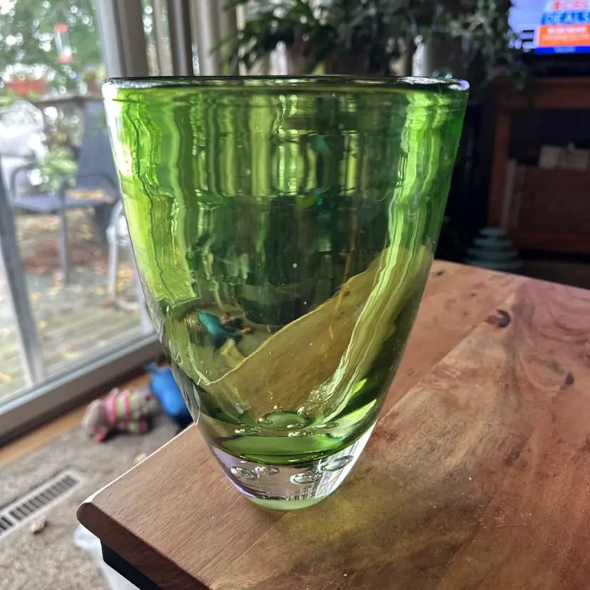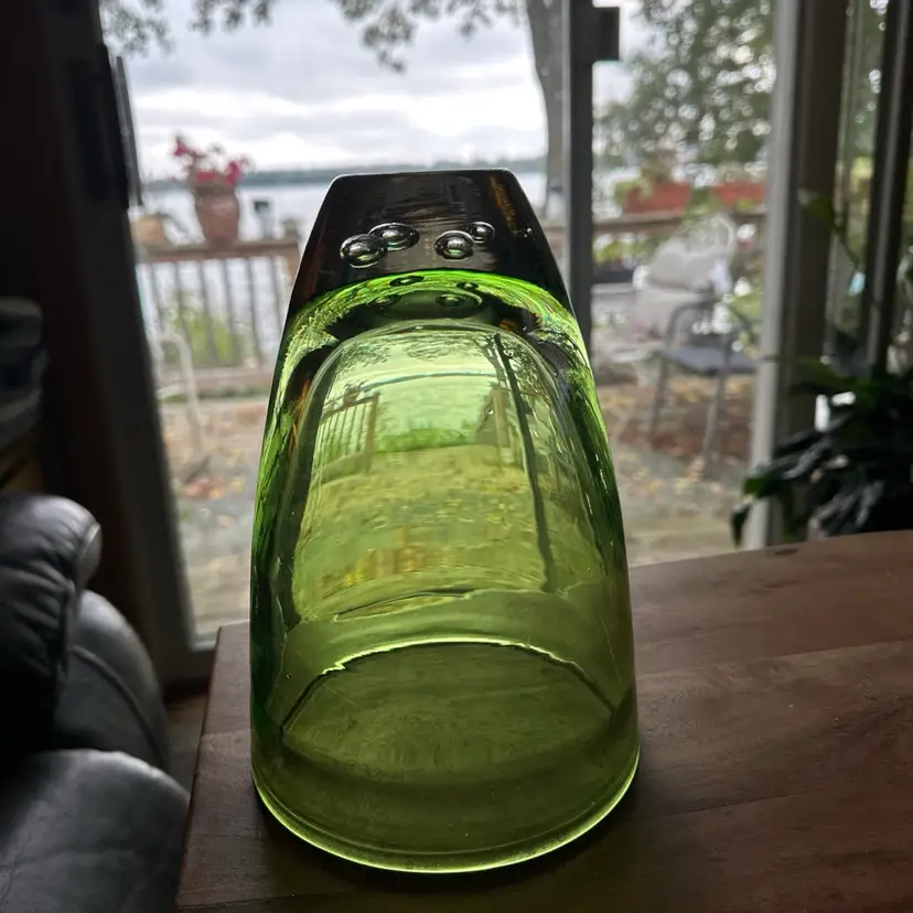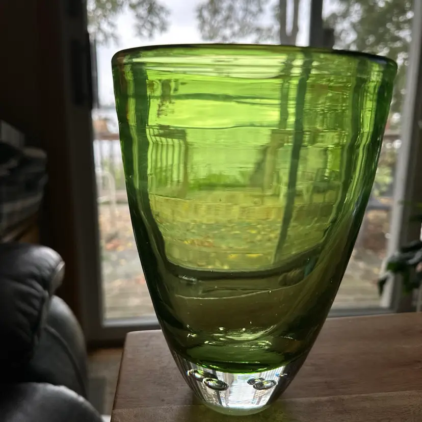 This Vintage Green Glass Suspended Bubble Base Hand Blown Art Vase from KROSNO, Poland is a unique and decorative piece that exudes Mid-Century Modern style. Standing at 7.5 inches tall and 5.5 inches wide, this handmade vase features a solid green color with a suspended bubble design, adding a touch of artistry to any space. Made of glass using a hand-blown production technique, this original piece is perfect for adding a vintage flair to your home decor. Whether used as a standalone display or as a functional vase, this KROSNO creation is sure to make a statement. No chips or cracks. Has one light scratch on the outside.