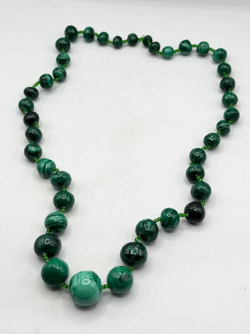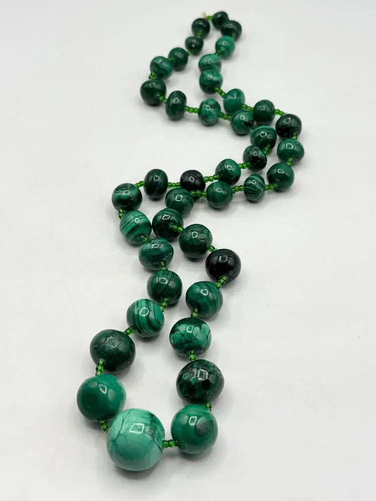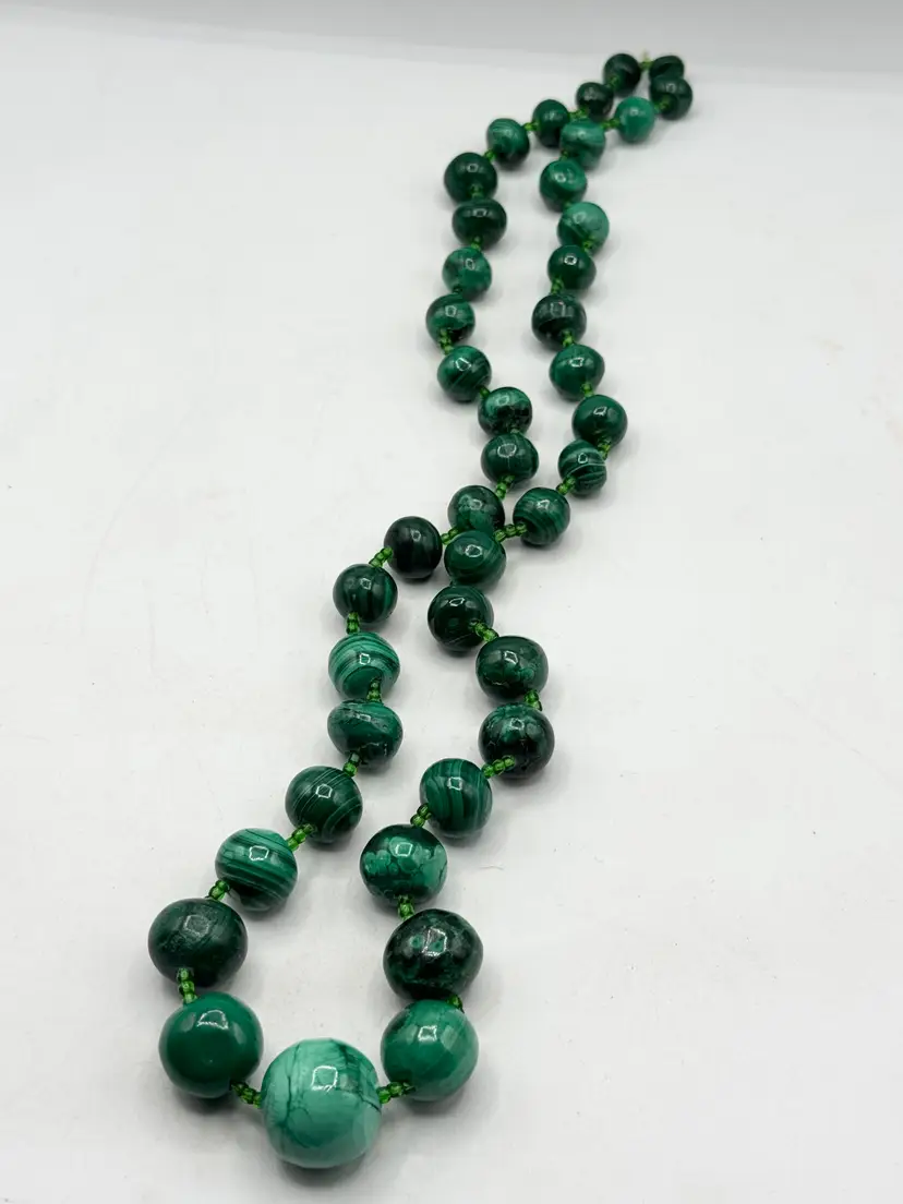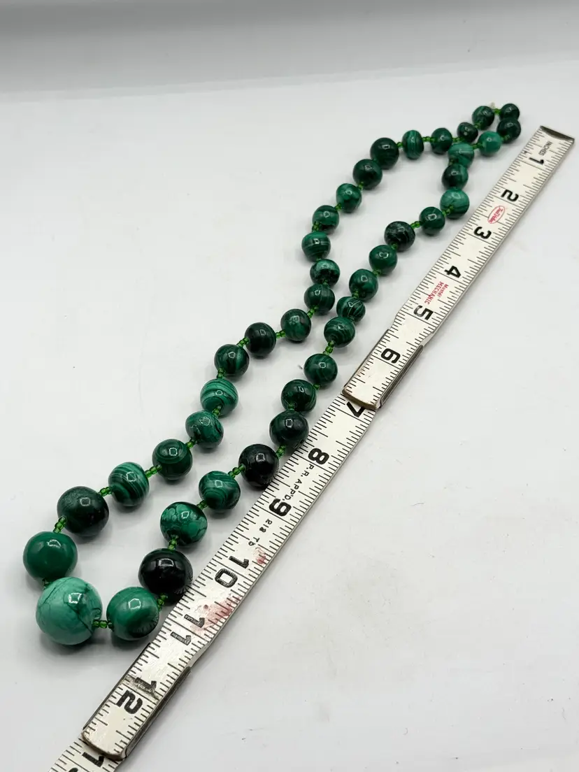 Vintage green malachite stone beaded necklace. Vintage green beaded long graduating sized beads. Vintage estate stone necklace. MN56H.