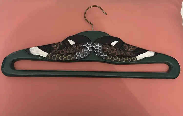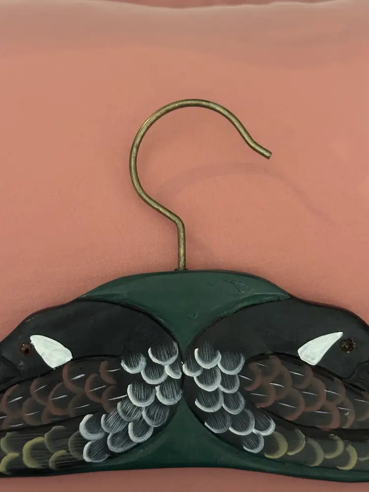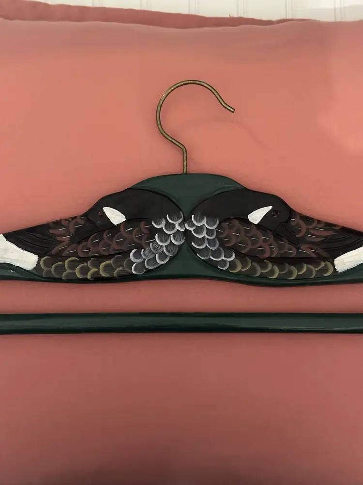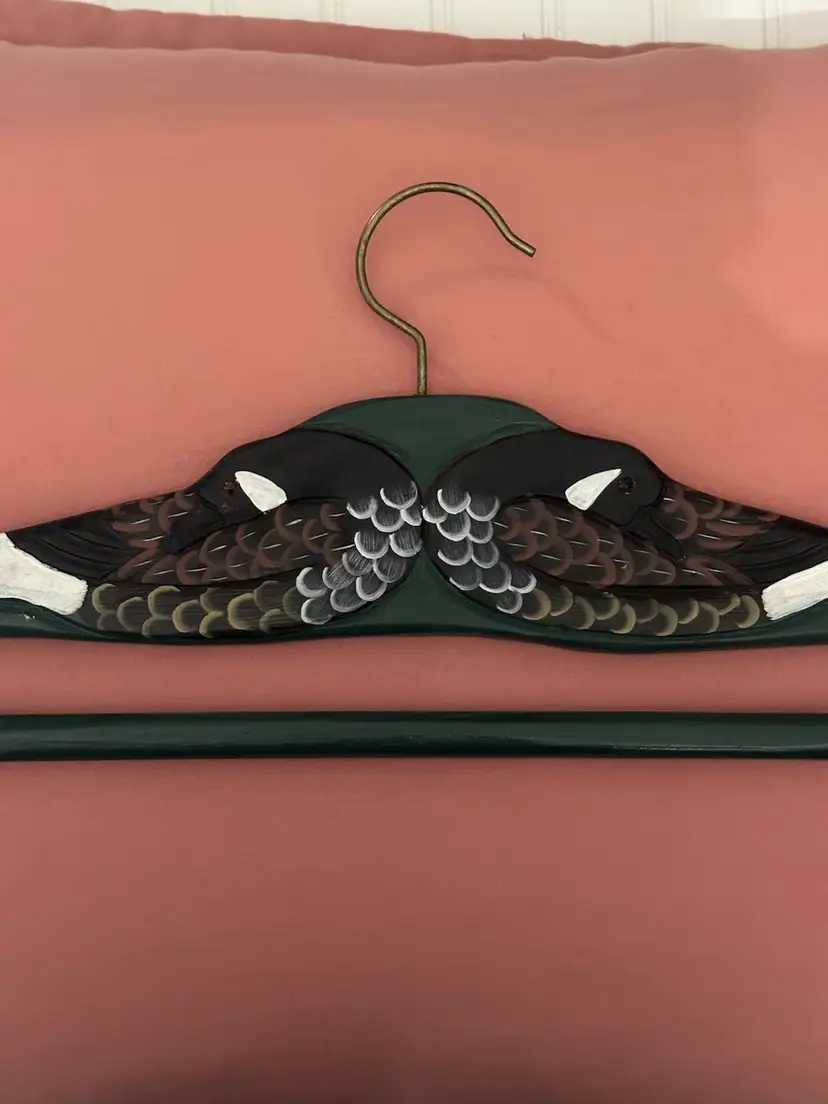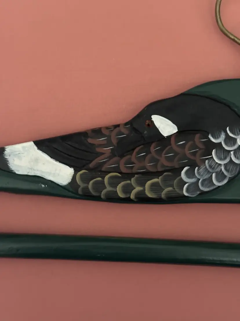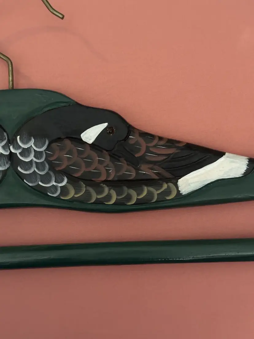 The Vintage Green Painted Wood Carved Duck Ornamental Clothing Hanger is a unique and handmade decorative piece featuring a carved duck design. Made from wood, this hanger showcases intricate details and a vintage charm that adds character to any room. Perfect for hanging clothing or as a standalone ornament, this piece captures the essence of nature and craftsmanship in a stylish and functional way. Measures 17 inch length and 7.5 inch height with brass hanger piece at the top great condition only. Few minor flaws to the paint are pics.