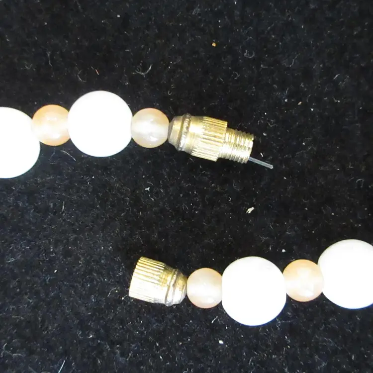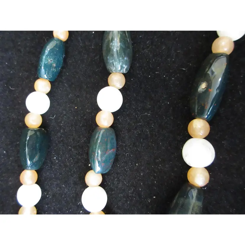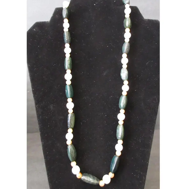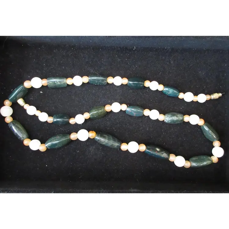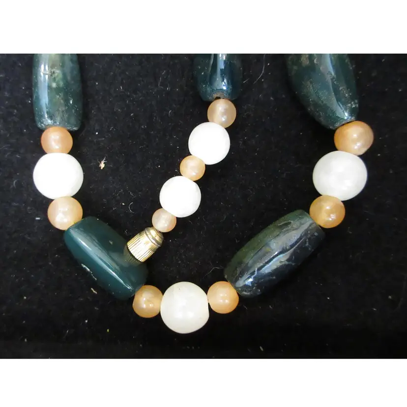 This is a BEAUTIFUL VINTAGE 24 inch necklace made of agate beads of various shapes and colors. The beads vary from long, cylindrical green agate, small pink agate spheres and larger white agate sphere. There is a gold tone metal barrel clasp in the back.