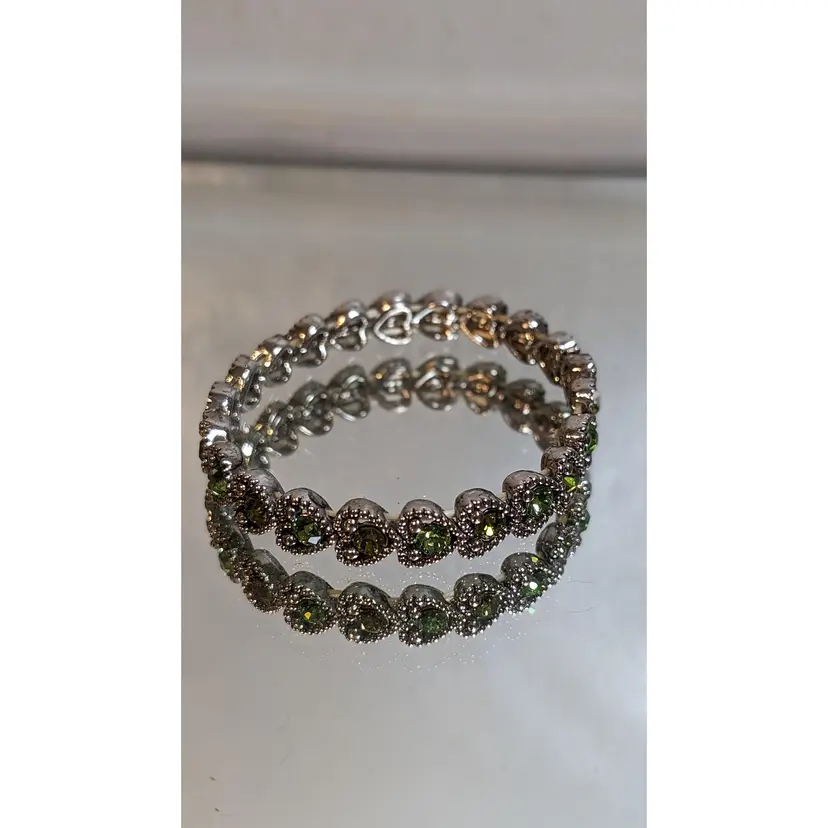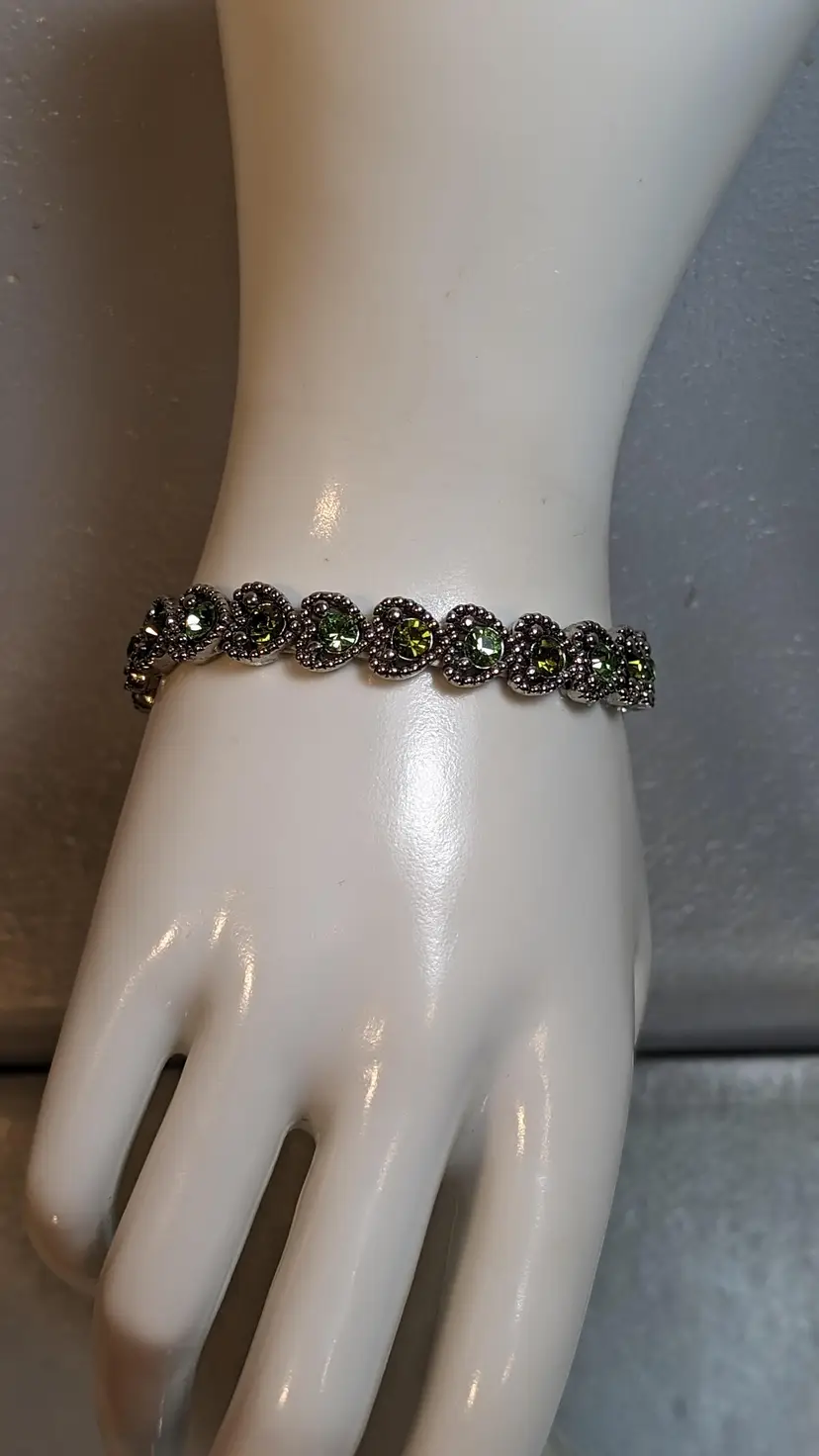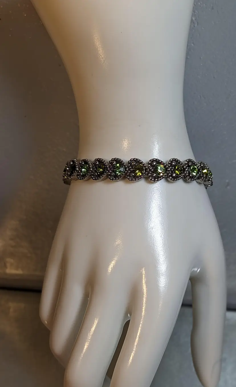 This vintage stretch bracelet features sparkling green rhinestones set in silver tone metal. Perfect for adding a touch of vintage charm and elegance to any outfit. See photos for size reference.