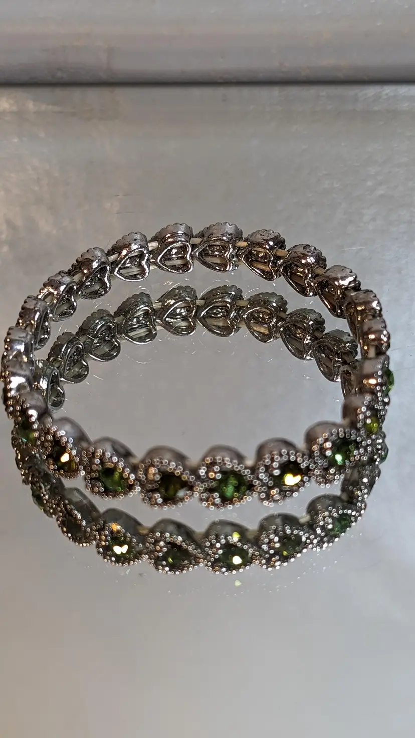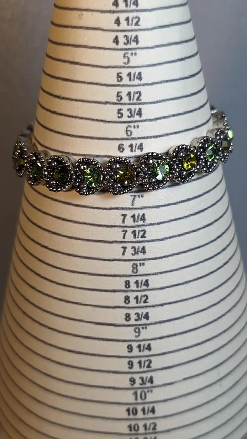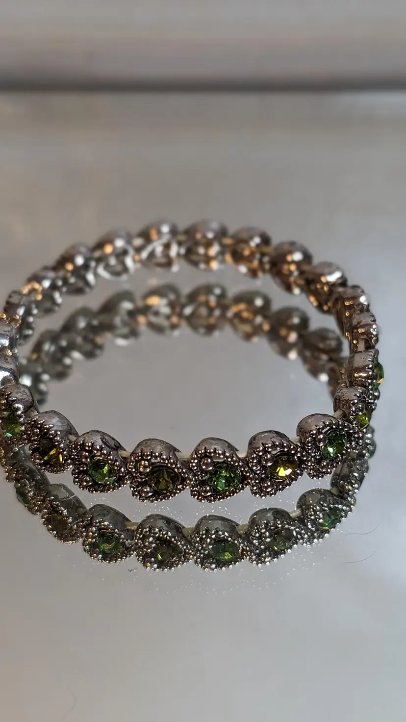 This vintage stretch bracelet features sparkling green rhinestones set in silver tone metal. Perfect for adding a touch of vintage charm and elegance to any outfit. See photos for size reference.