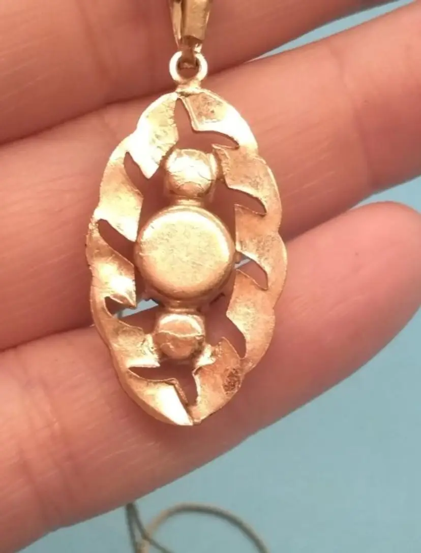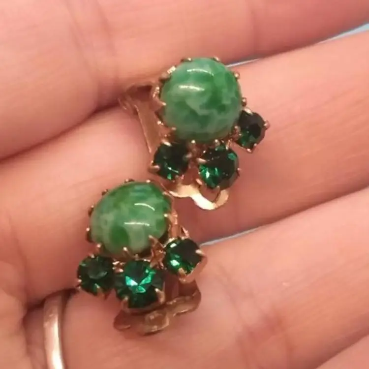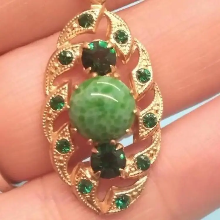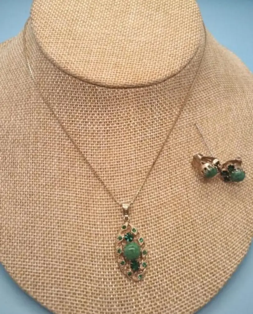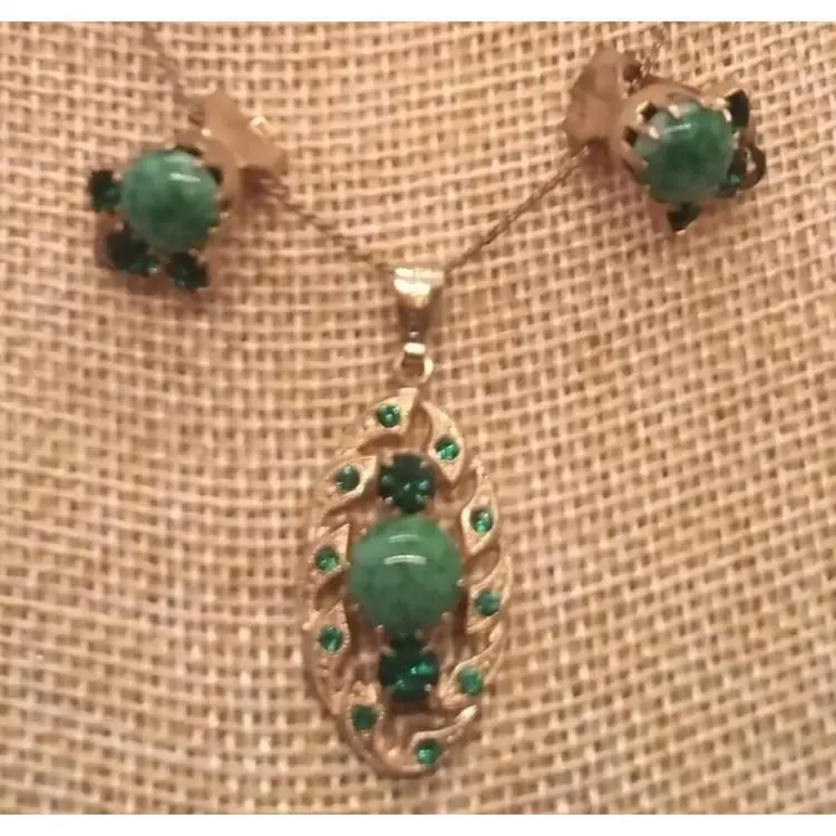 This vintage jewelry set includes a beautiful pendant necklace and matching earrings, each featuring striking green stones, and sparkleing rhinestones. The intricate gold-tone settings add a touch of elegance. Perfect for adding a vintage flair to any outfit. In good vintage condition with no major issues.