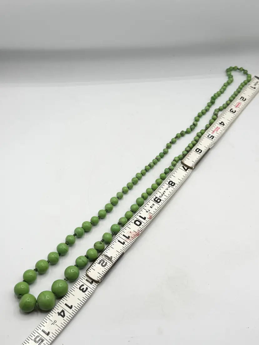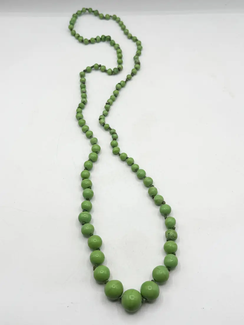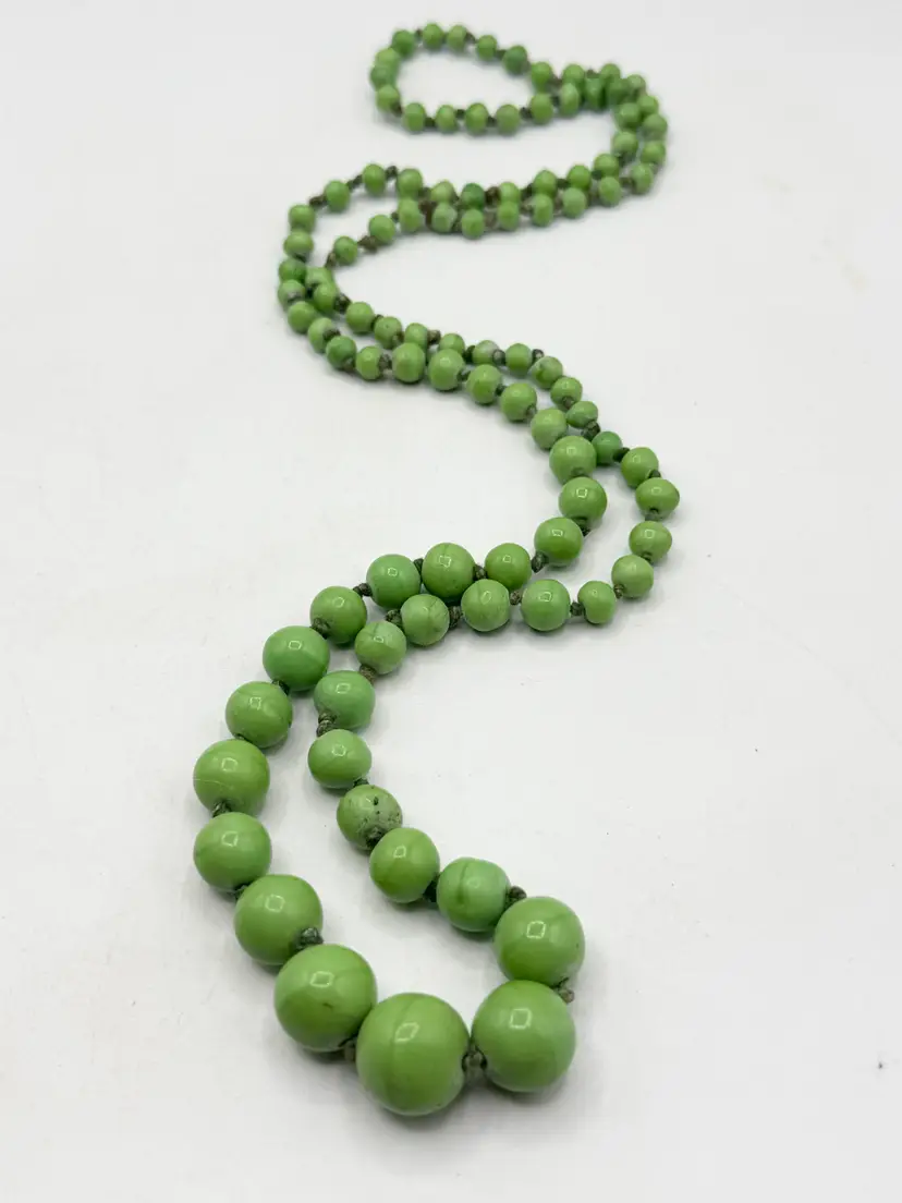 Vintage green stone beaded long necklace. Vintage estate green stone beaded long necklace. Beautiful green colored graduating beads. MN56HJ.