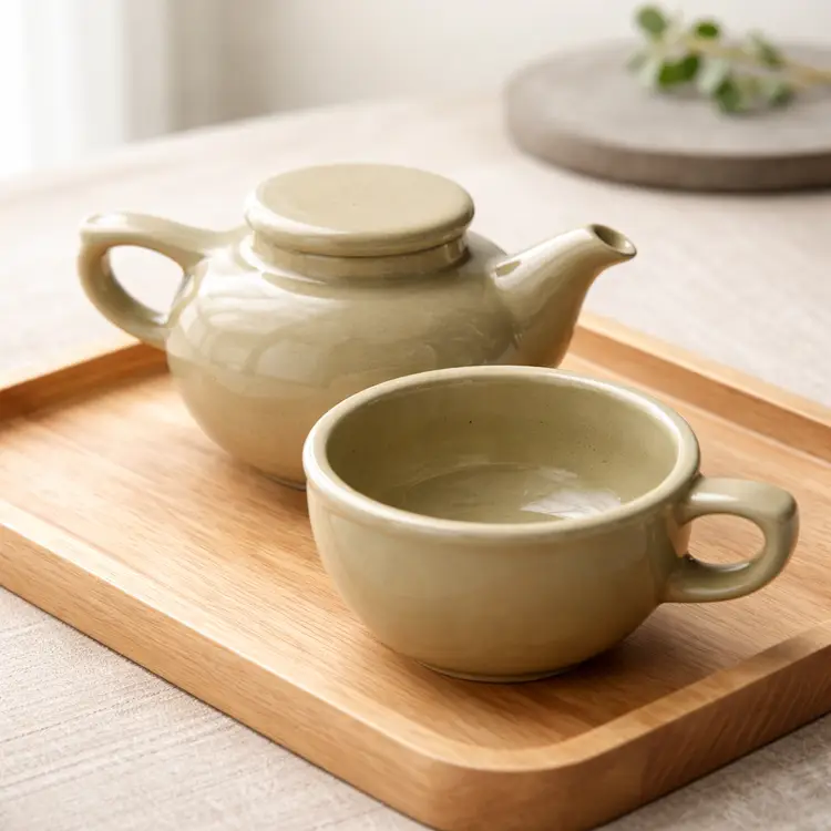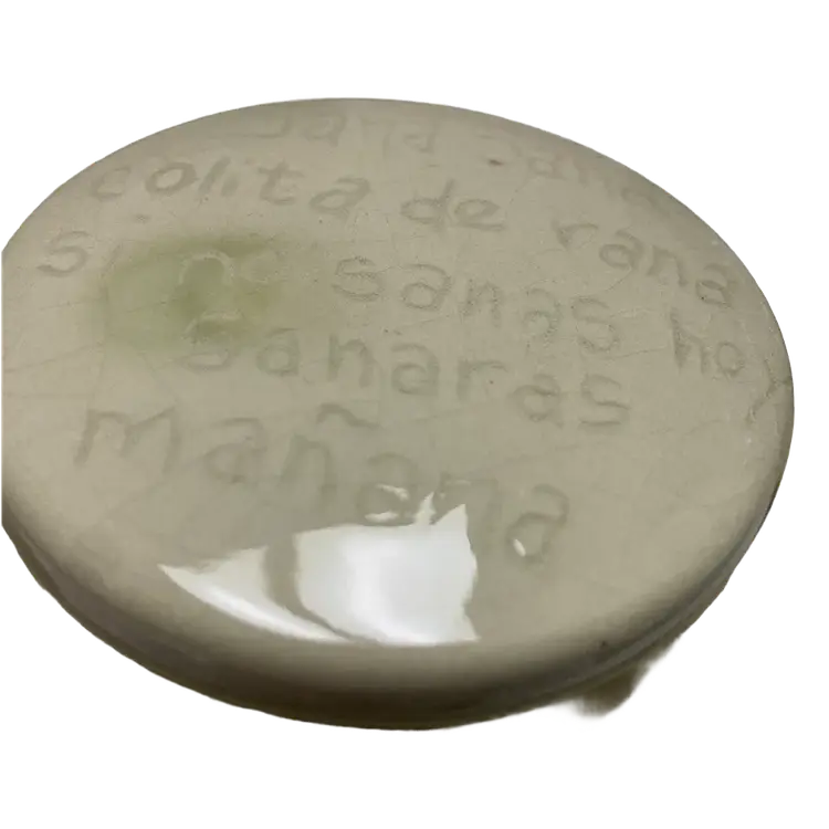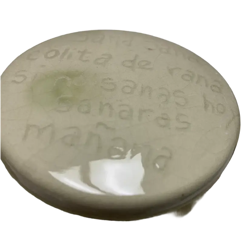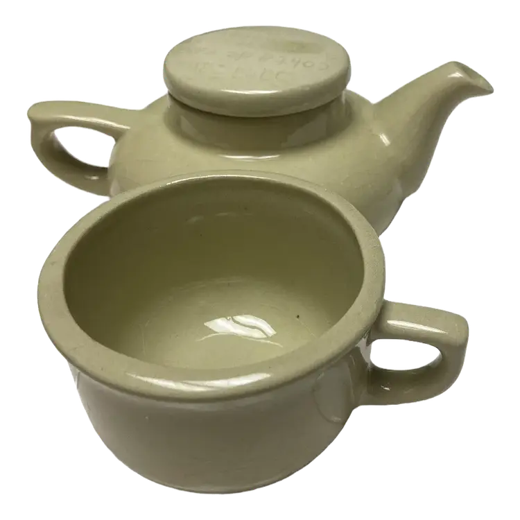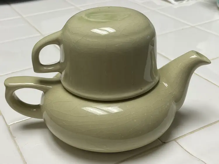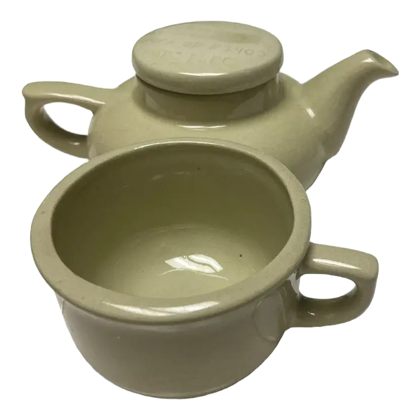 Vintage Green Tea For One Stackable Teapot & Cup Set, impressed with the Spanish Children's Rhyme "Sana Sana Colita de Rana Is No Sanas Hoy Sanaras Mañana" which translates to "Heal, heal, little frog's tail, if you don't heal today, you'll heal tomorrow," Should be used for decor only due to crazing.