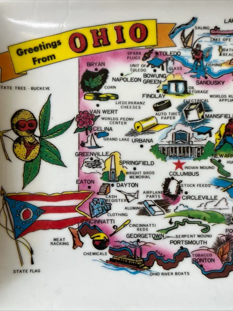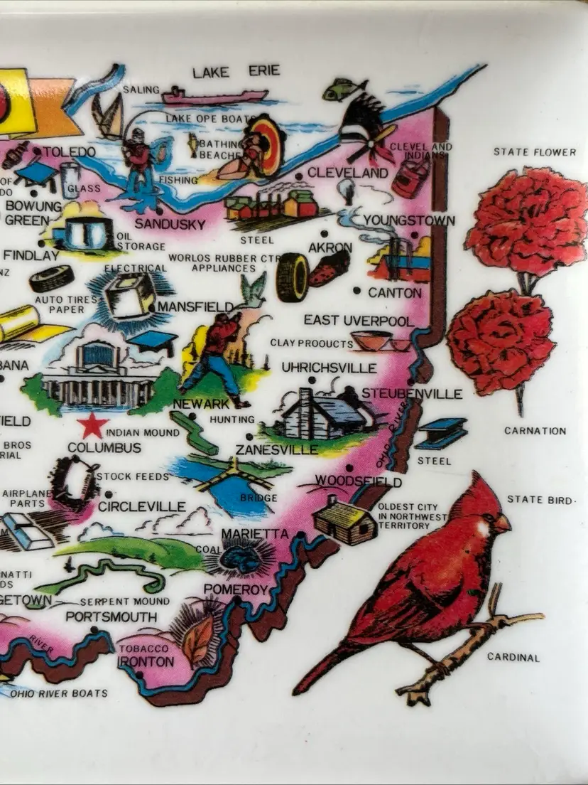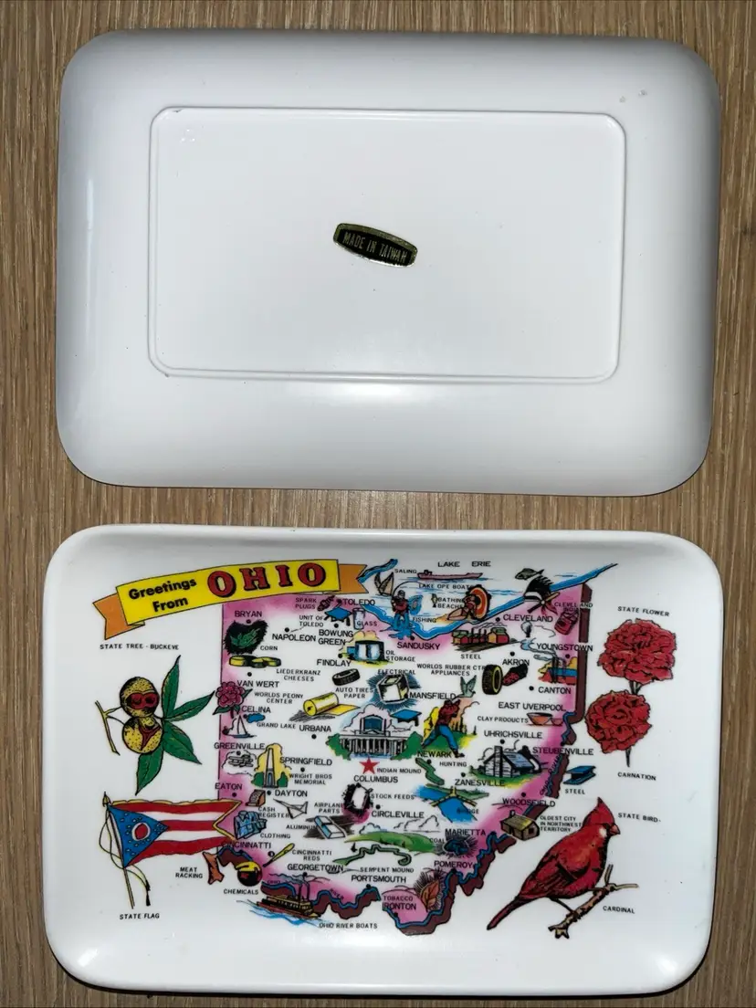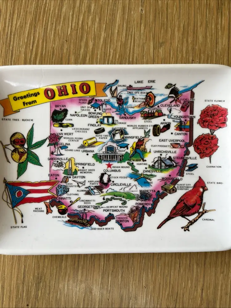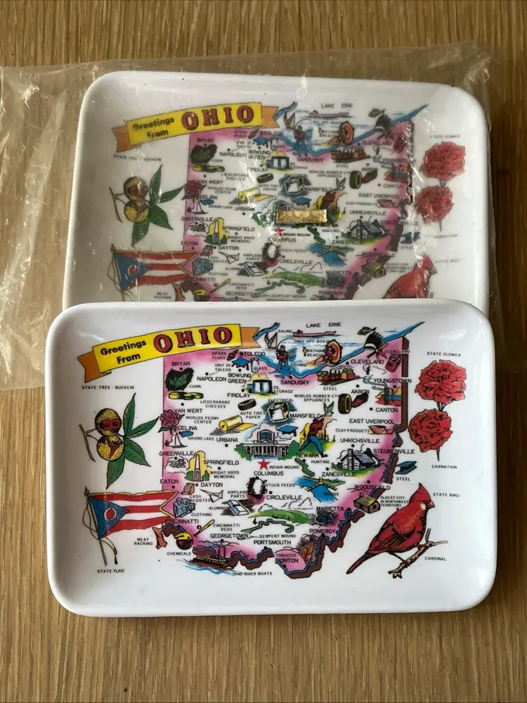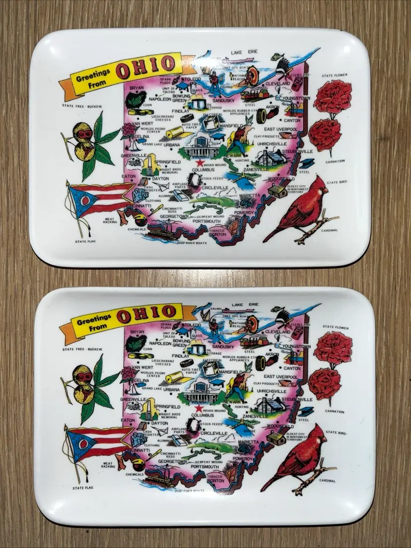 Set of 2 vintage "Greetings from Ohio" souvenir melamine trays with map of Ohio. Approximately 6" long and 4" wide. Made in Taiwan. Pre-owned and in good, vintage condition. Expect normal wear such as scuffs or scratches. See photos and ask any questions prior to purchase. Thank you for your interest in this item. I try my best to accurately describe each item that I list for sale including any known defects. All items are sold AS IS. What you see in the photos is exactly what you get, nothing more, nothing less. If an item is not specifically listed as new then it is in pre-owned, used condition and wear should be expected. I do not accept returns so please take your time to review the item description, condition description and photos.