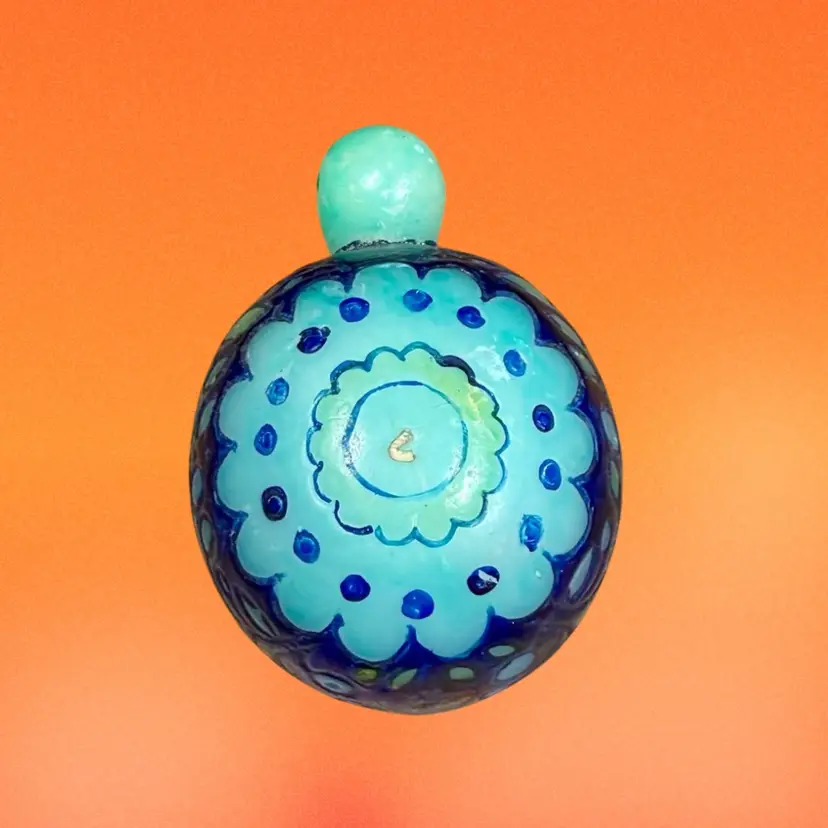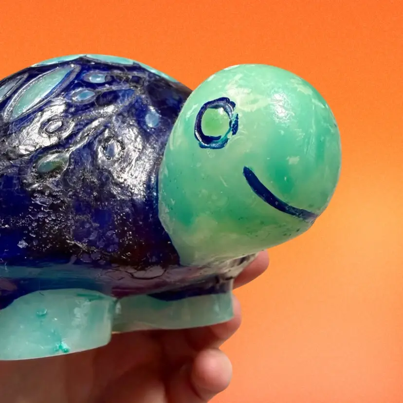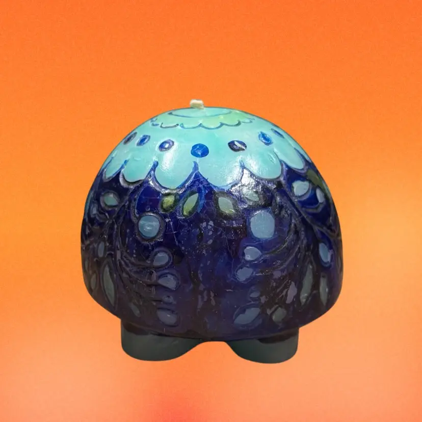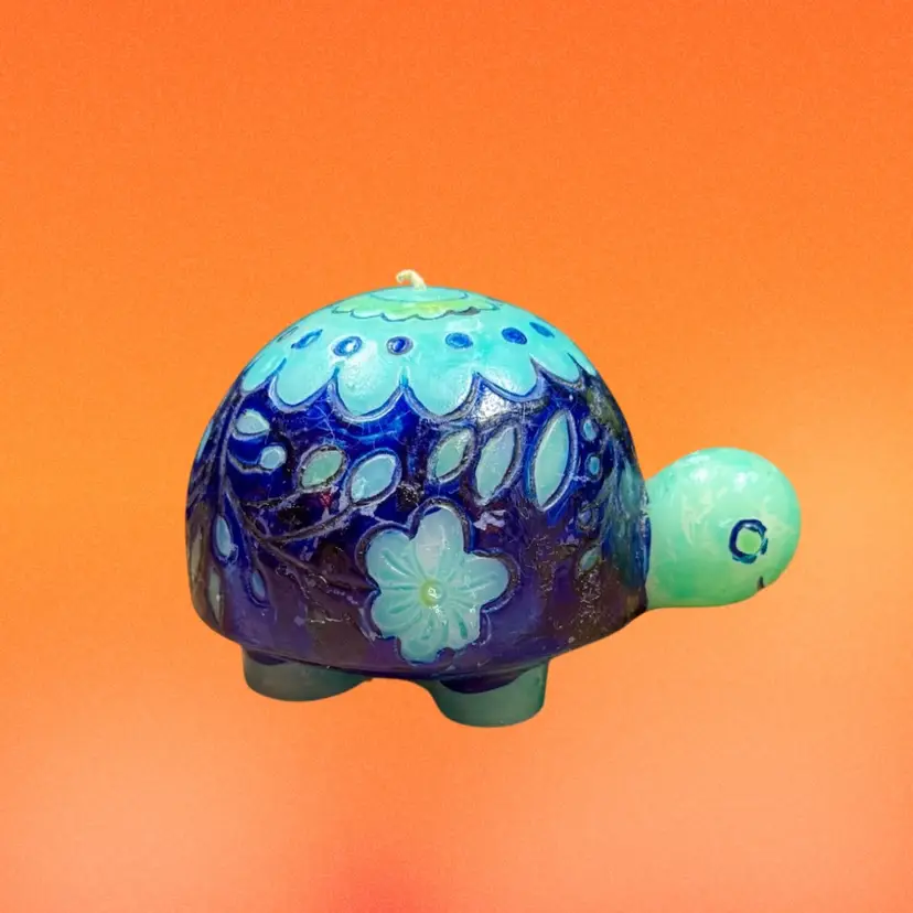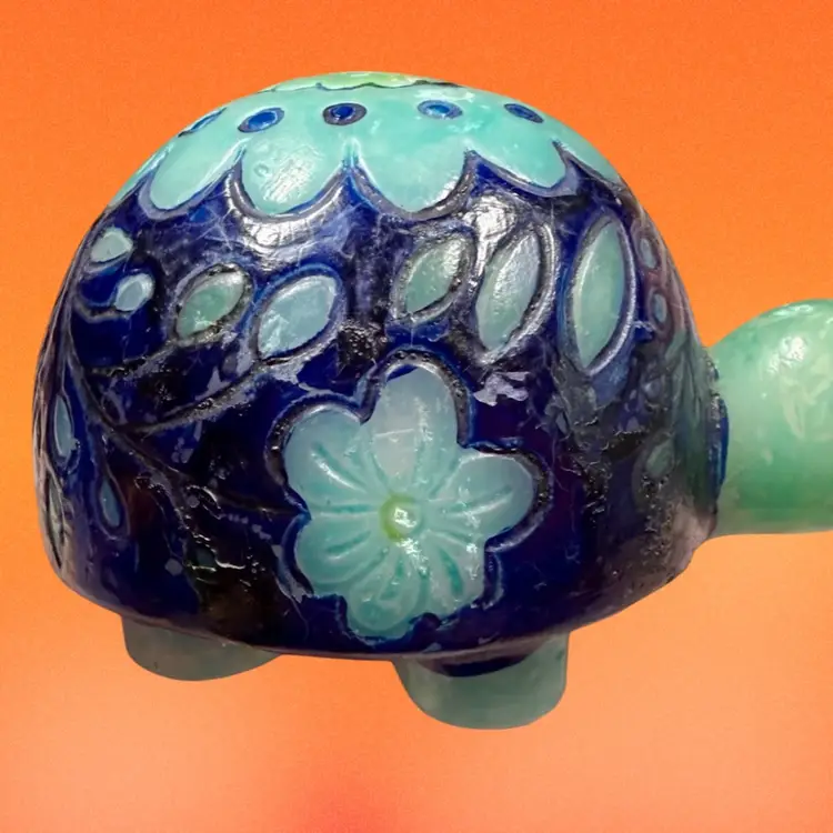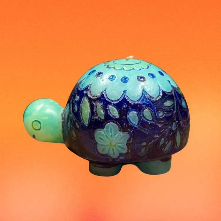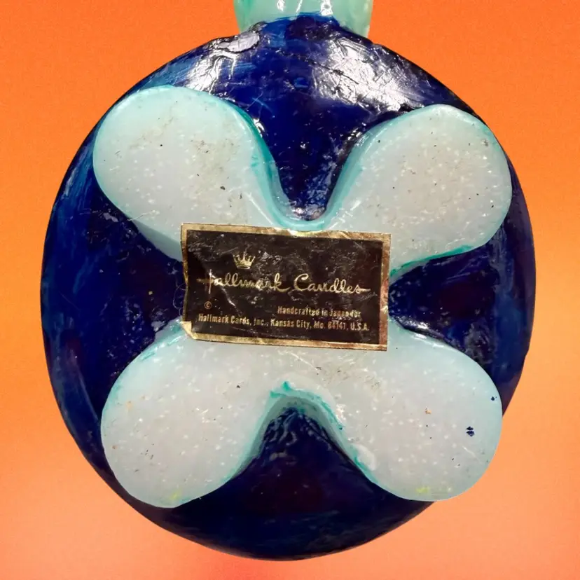 5.5”x4”x3.5”. Groovy Hallmark turtle candle, unbranded and unscented. Features a blue and teal flower power design. Had hallmark sticker on bottom. No major issues, although surface may have some minor scratches and imperfections. The texture of the surface isn’t pristine and smooth! See photos.
