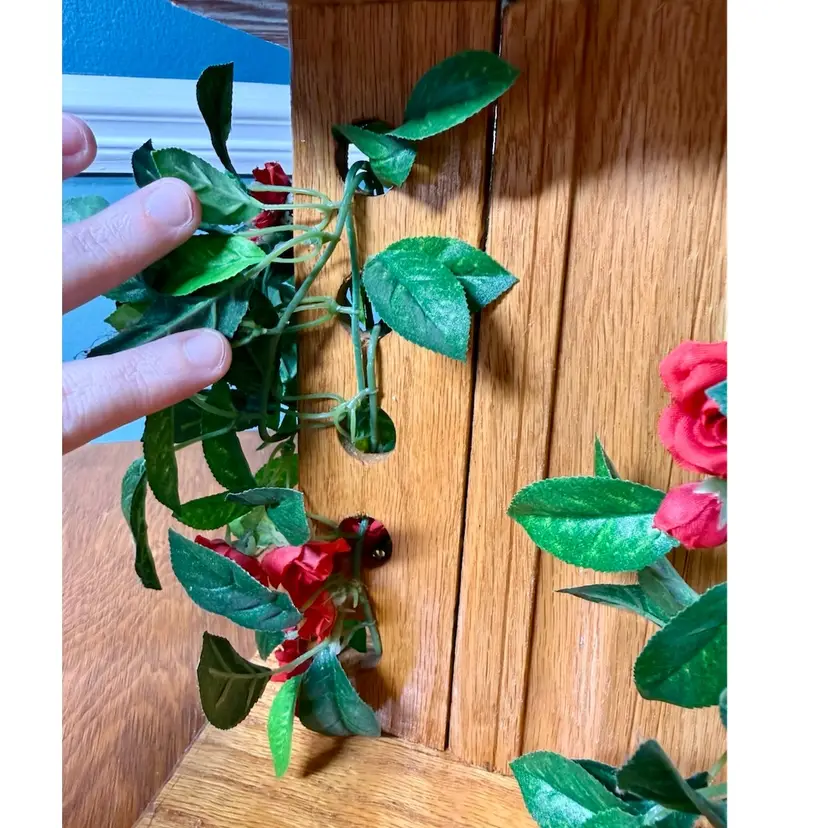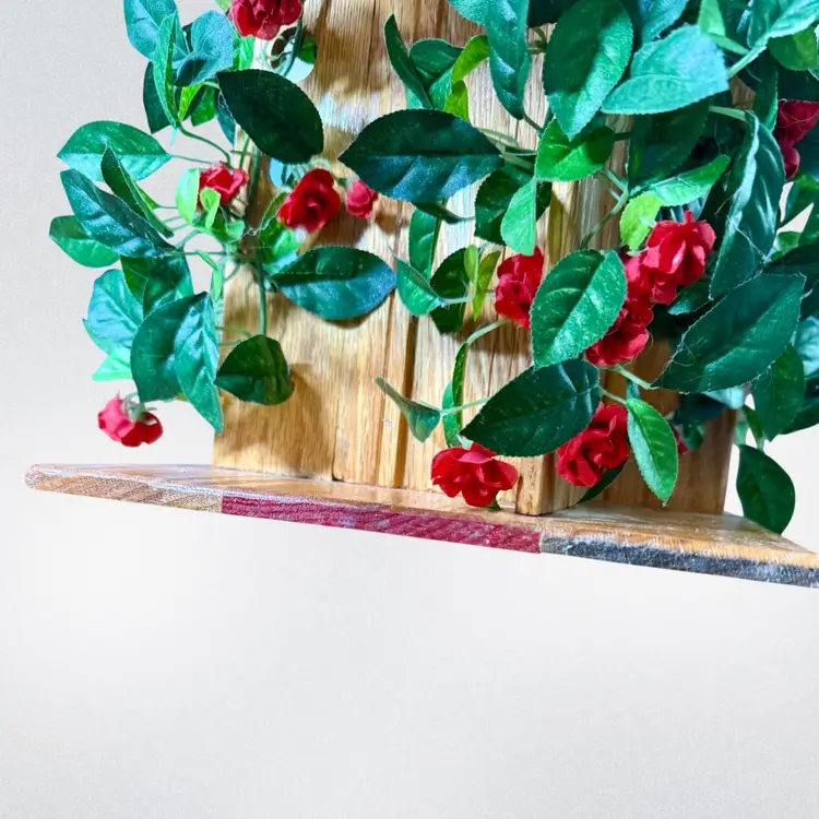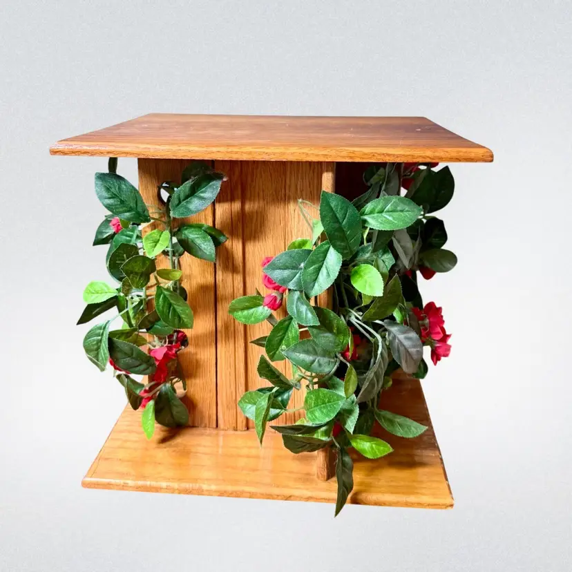 10"x9"x9.25". Groovy AND whimsical wooden pedestal stand or plant stand! A truly unique piece! Handcrafted by Frank Hasenorhl and signed on the bottom. It is hard to see in photos, but each corner of the pedestal has a row of holes in which you can decorate (currently has faux flowers woven through the holes). Current flowers can be removed and replaced if desired. Can be used to display a small plant, sculpture, etc! Might be a little dusty. Weighs 3 lb 2 oz. NOTE could use a fresh coat of wood conditioner/stain. A corner has a little chip exposing fresh wood, and an edge of the base seems unfinished/has red paint exposed. Please see photos.
