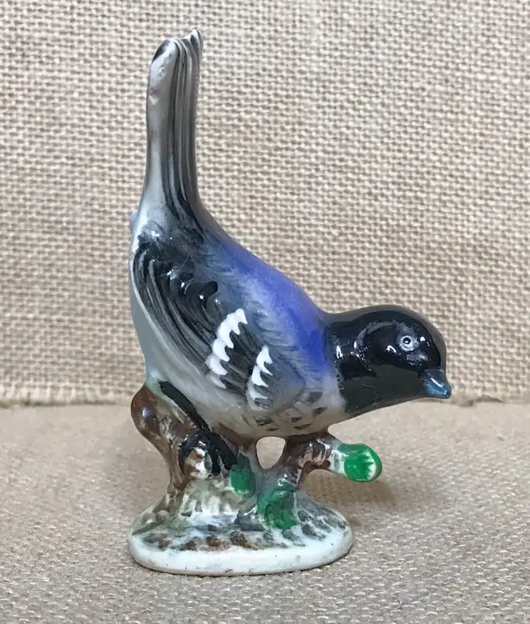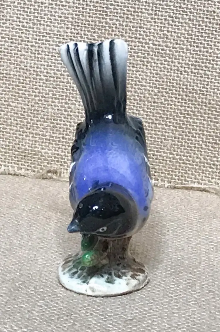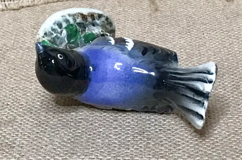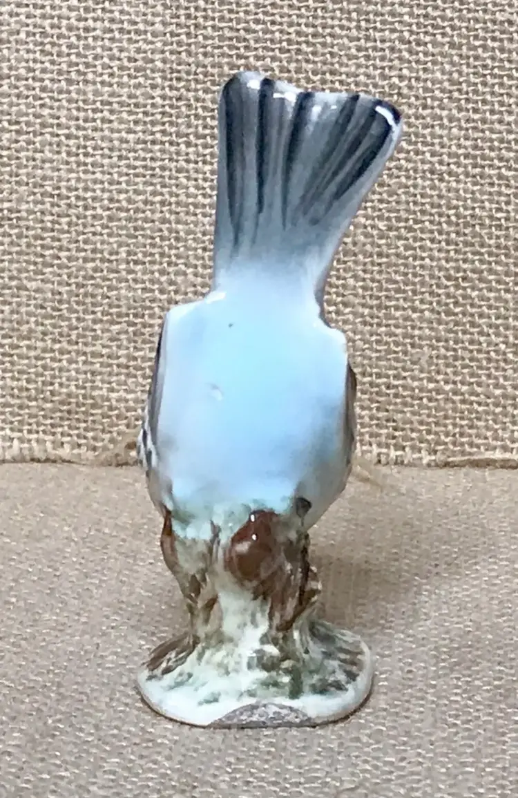 Condition: Some tiny areas of wear to glossiness. Tiny paint chips on beak. Some tiny marks. Small chip on backside. Backside of base is chipped, grounded, and stained. Tiny chips on one side of base. Bottom is grounded with some staining. Some fade to “grosbeak.”