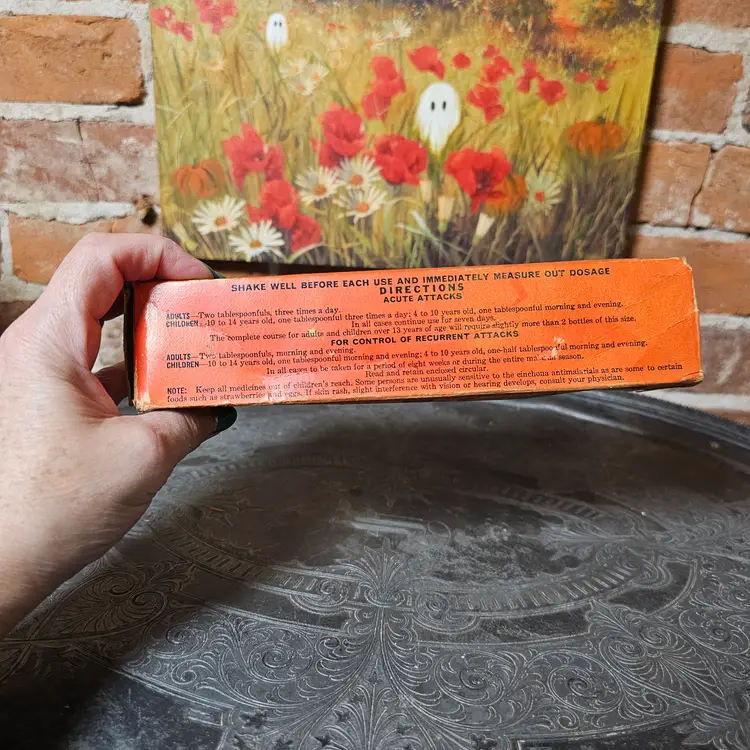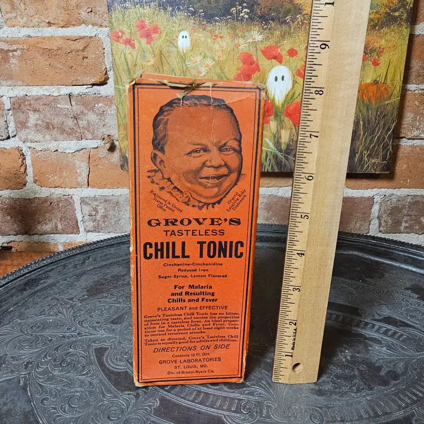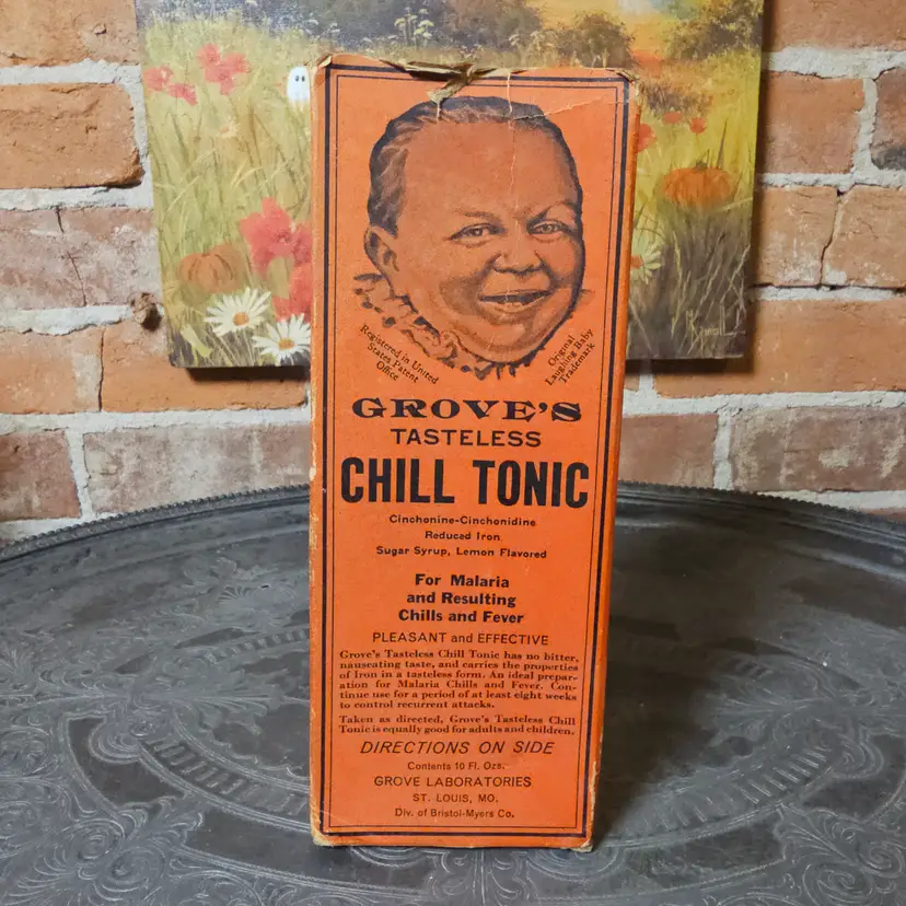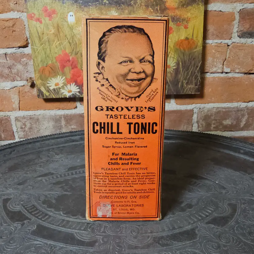 BOX ONLY Step back in time with this vintage Grove’s Tasteless Chill Tonic box, once marketed as a remedy for malaria, chills, and fever. Produced by Grove Laboratories of St. Louis, Missouri (a division of Bristol-Myers Co.), this striking orange box with bold black lettering and smiling child illustration makes it a fantastic piece of vintage advertising and apothecary history.