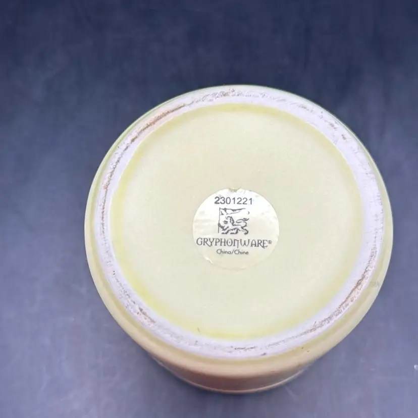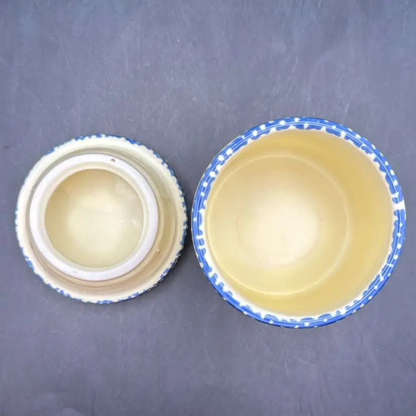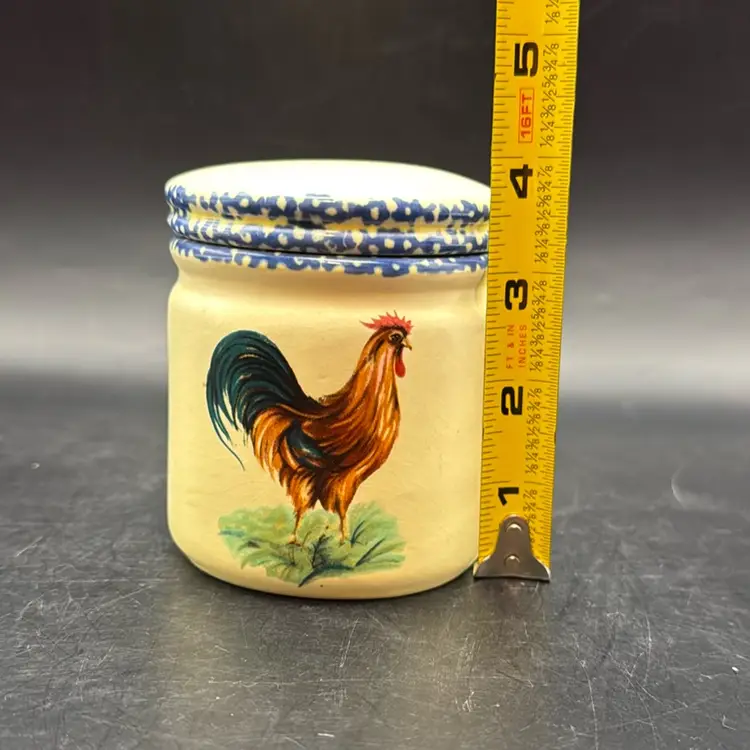 Design: Pale yellow body with a hand-painted rooster motif and a blue patterned lid.