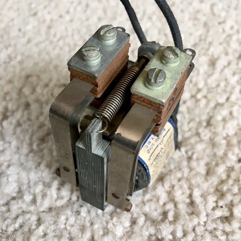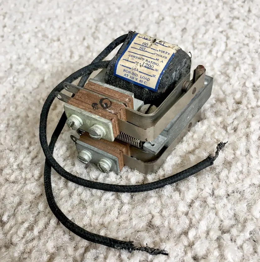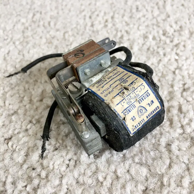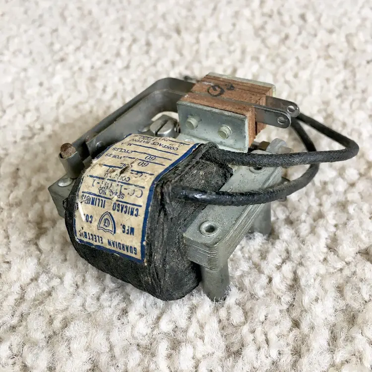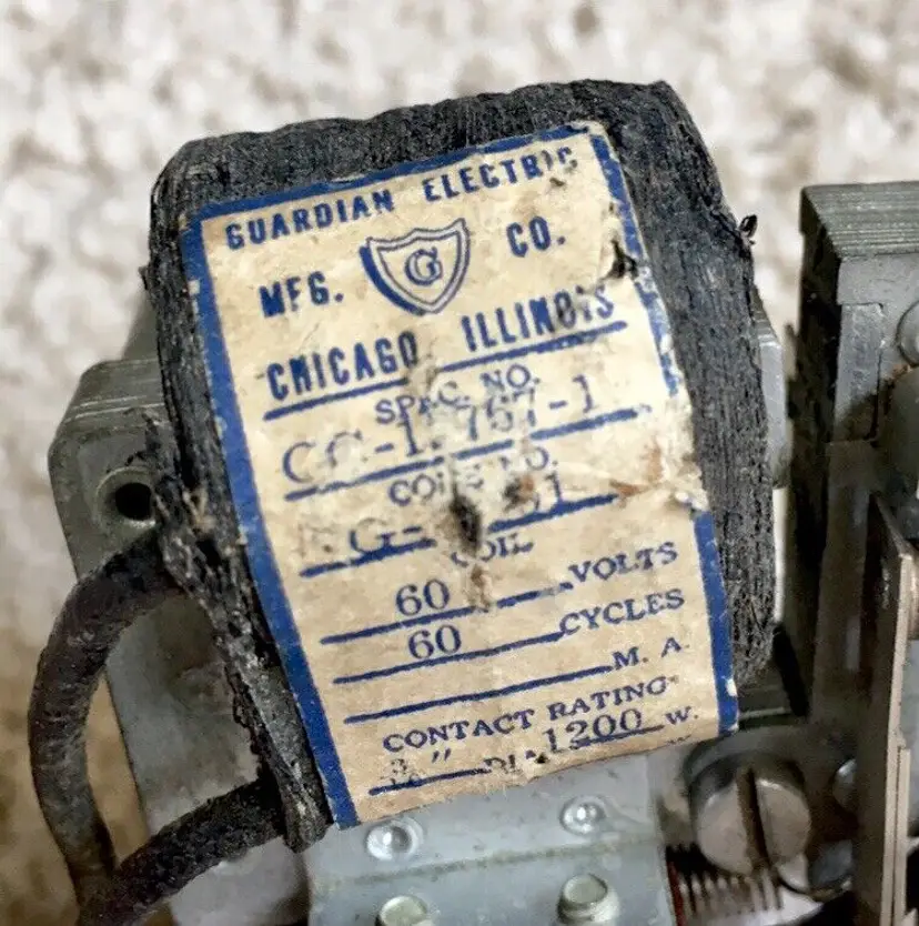 Rare vintage relay coil made by GUARDIAN ELECTRIC MFG CO. in Chicago, Illinois. Kind of hard to make out all the information on the attached label, but looks like… SPEC NO. CC -15757-1, CODE NO. G-1-51, COIL 60 VOLTS 60 CYCLES, CONTACT RATING 3/16” DIA. 1200 W., NON-IND. LOAD, AT 110 V. 60 C.. Item appears to be in good condition, but is UNTESTED. It was included with some very old television/radio tube equipment I acquired. Measures about 1.75” wide and 2.25” high. See pics for more details and please zoom in for closeups.
