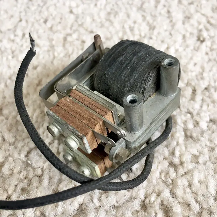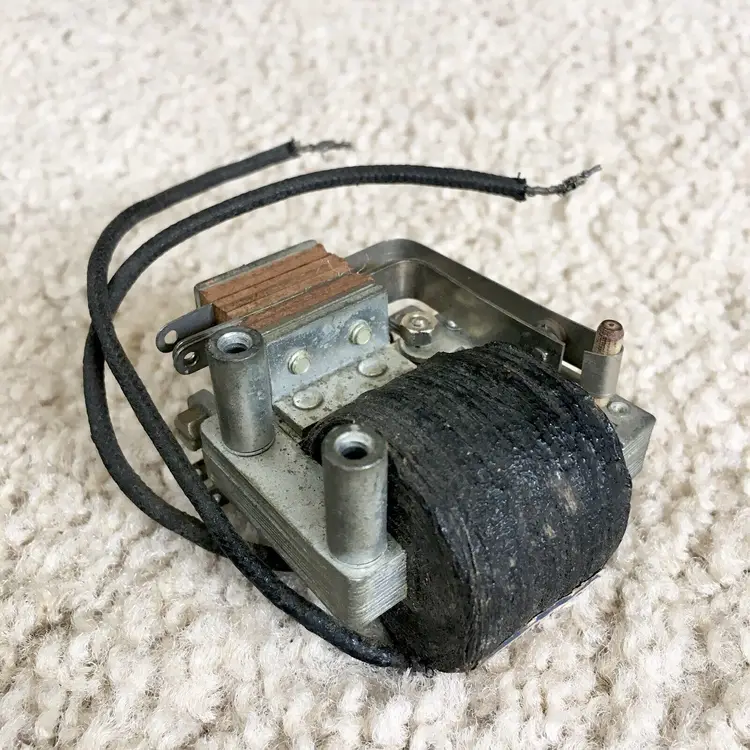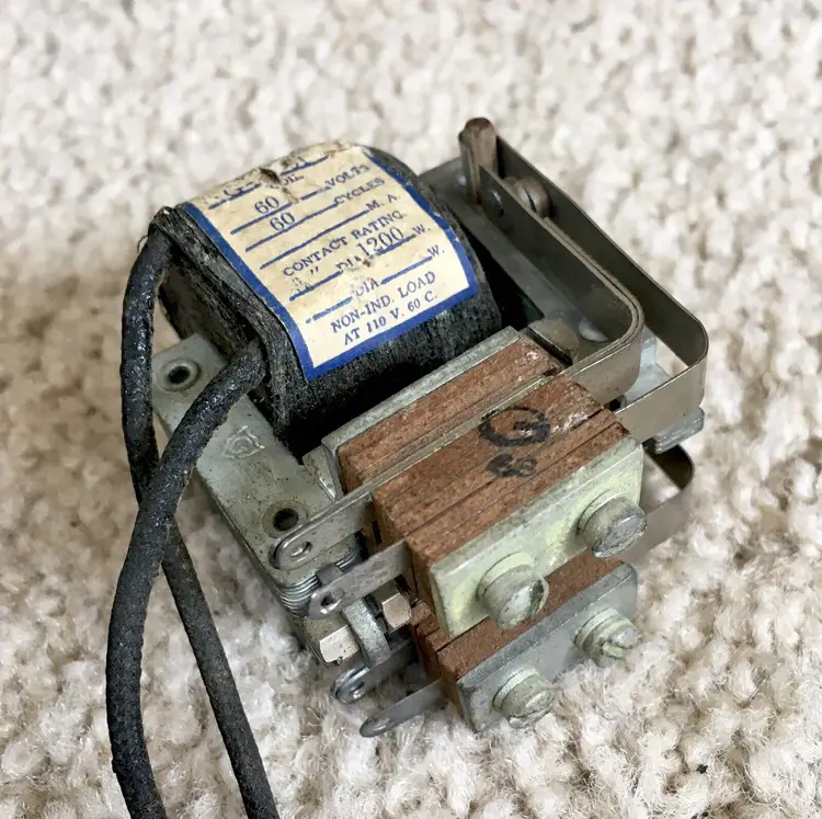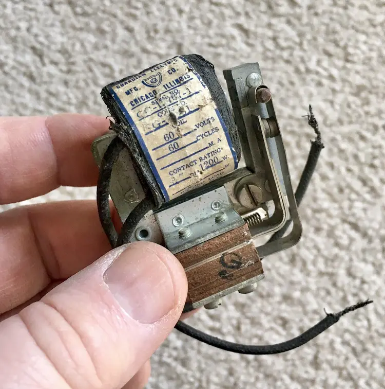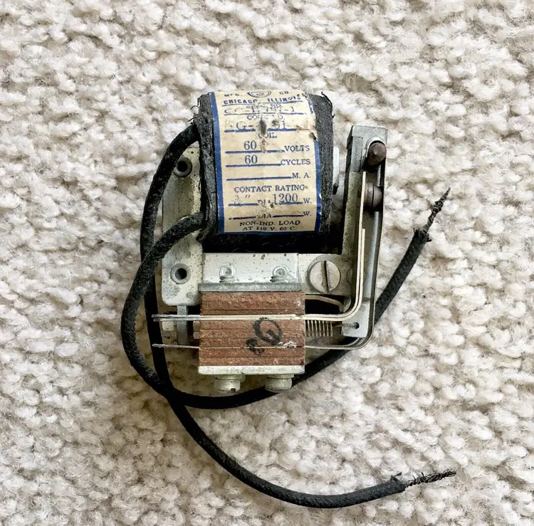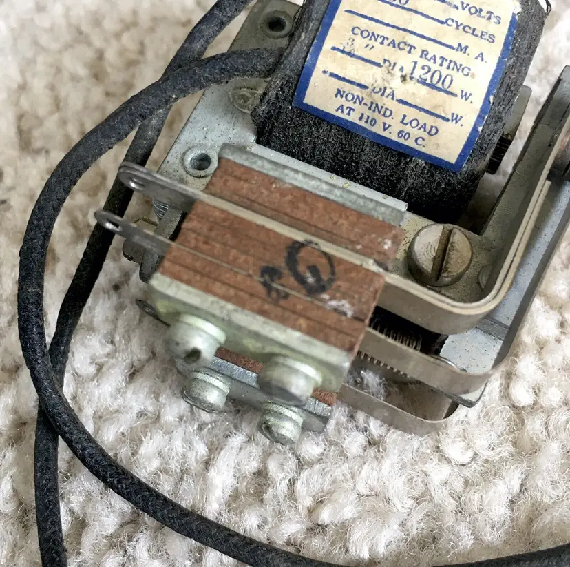 Rare vintage relay coil made by GUARDIAN ELECTRIC MFG CO. in Chicago, Illinois. Kind of hard to make out all the information on the attached label, but looks like… SPEC NO. CC -15757-1, CODE NO. G-1-51, COIL 60 VOLTS 60 CYCLES, CONTACT RATING 3/16” DIA. 1200 W., NON-IND. LOAD, AT 110 V. 60 C.. Item appears to be in good condition, but is UNTESTED. It was included with some very old television/radio tube equipment I acquired. Measures about 1.75” wide and 2.25” high. See pics for more details and please zoom in for closeups.
