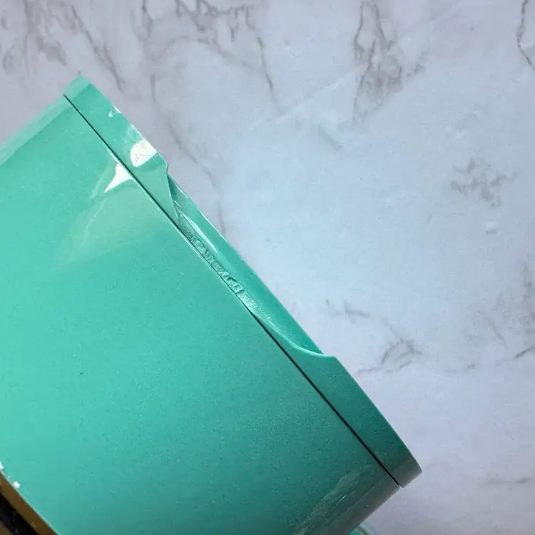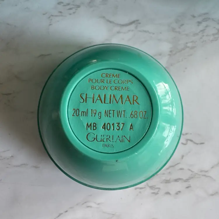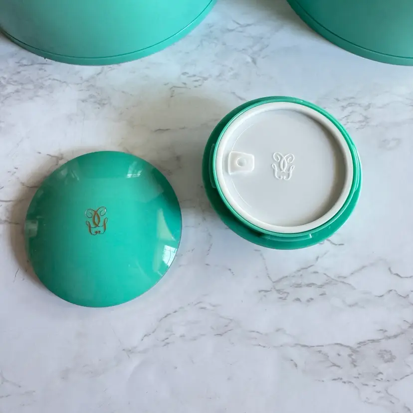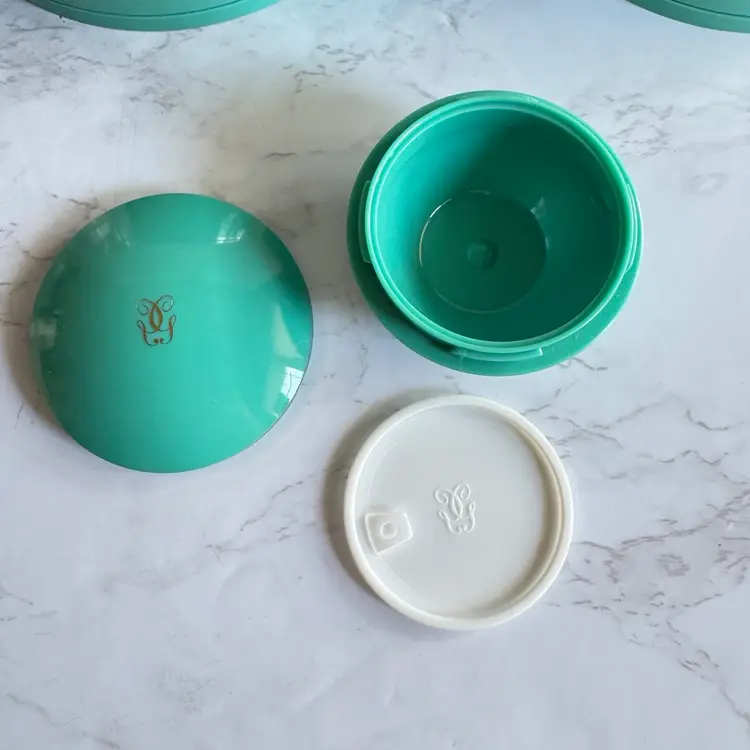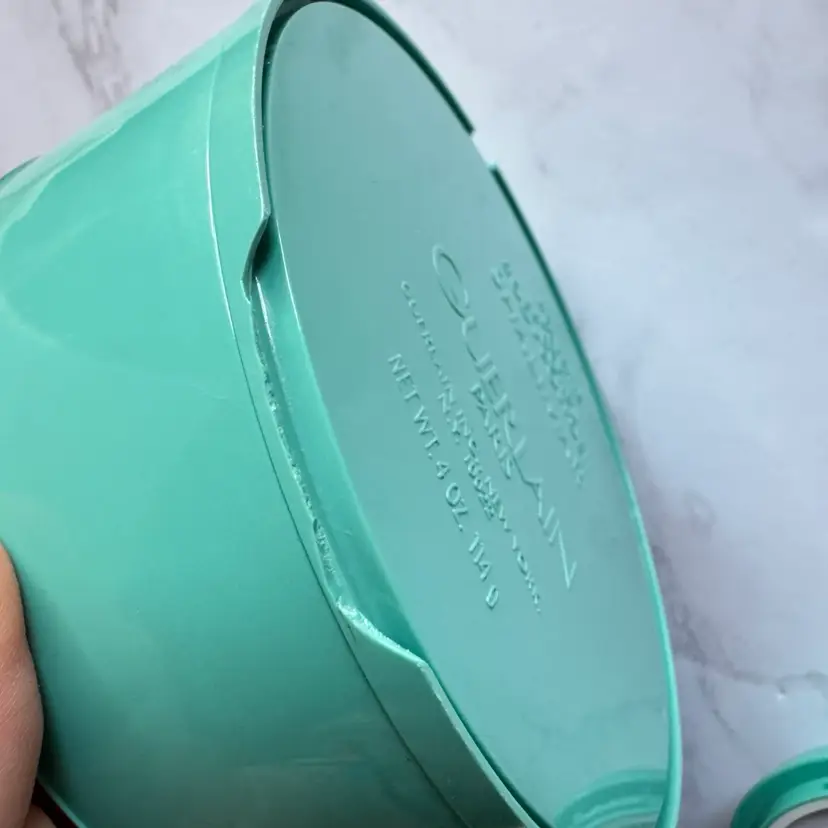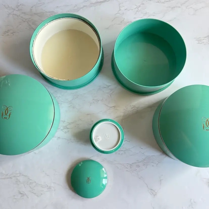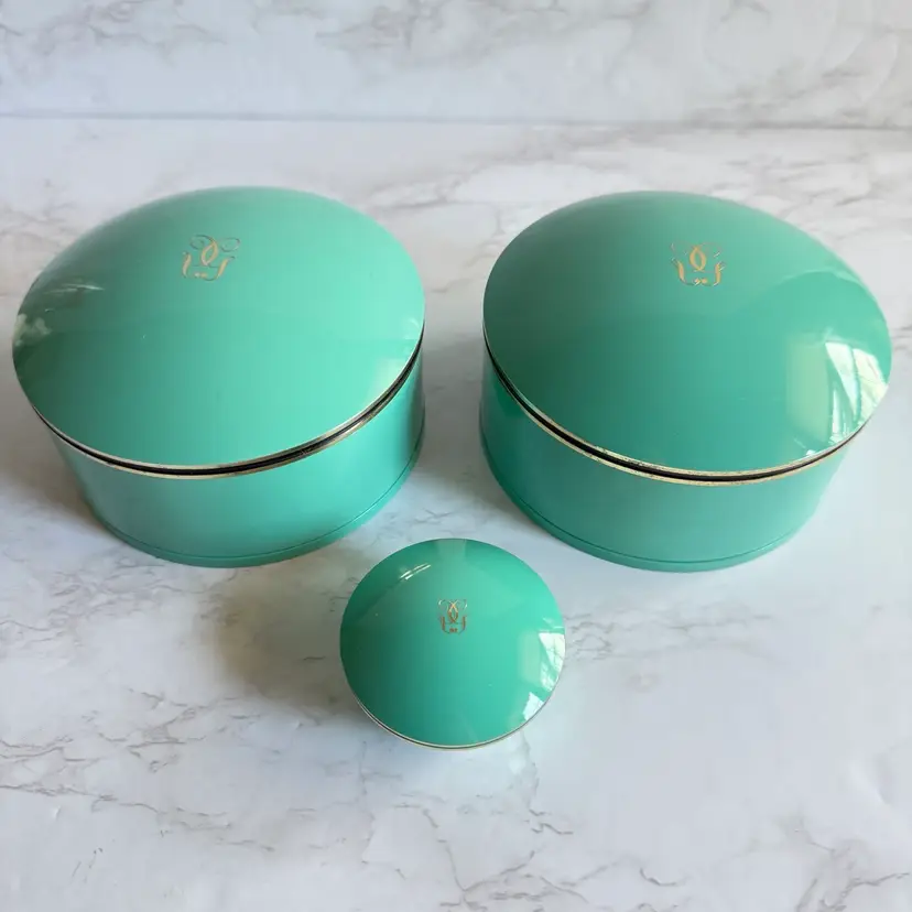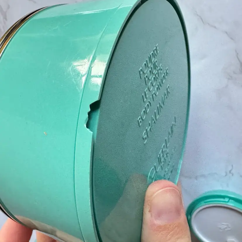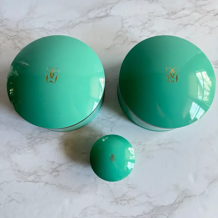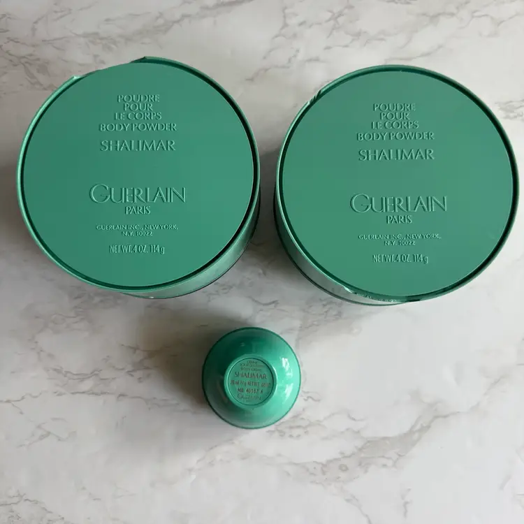 The two large powder canisters have chips on the bottom rim. The body creme canister is in good condition