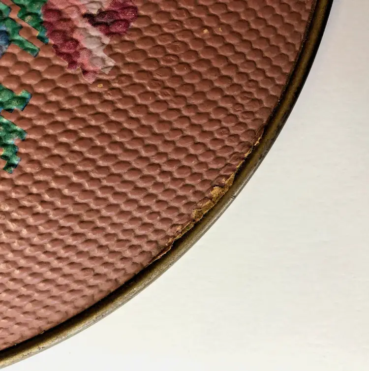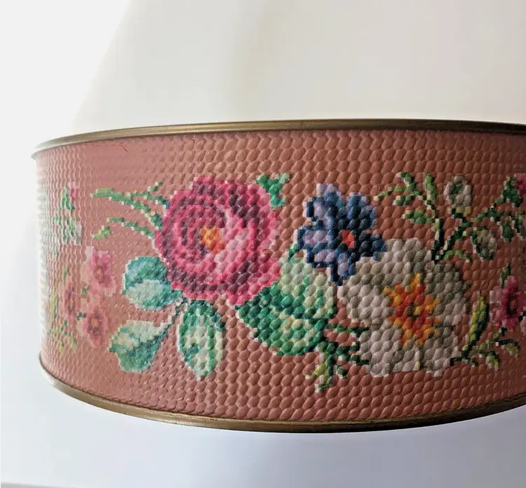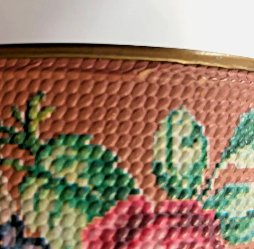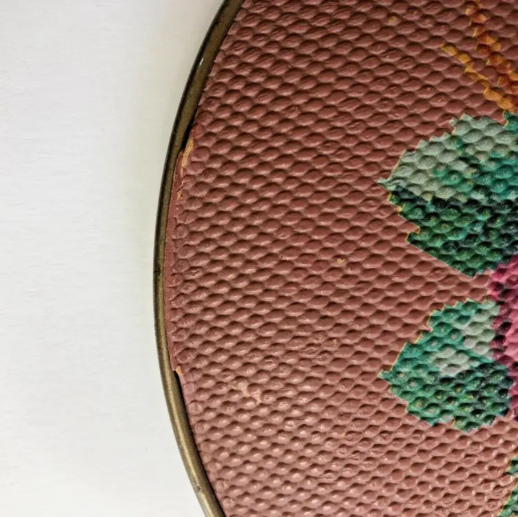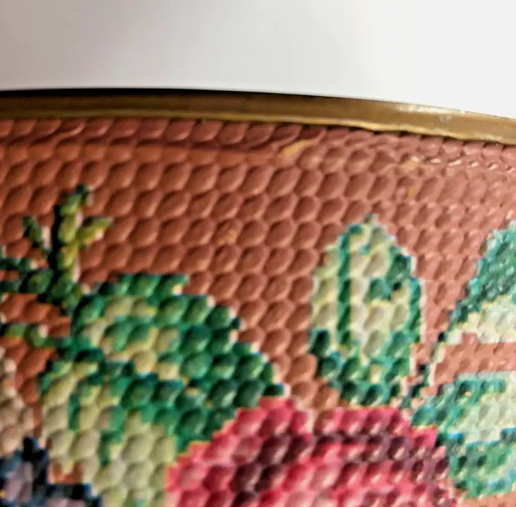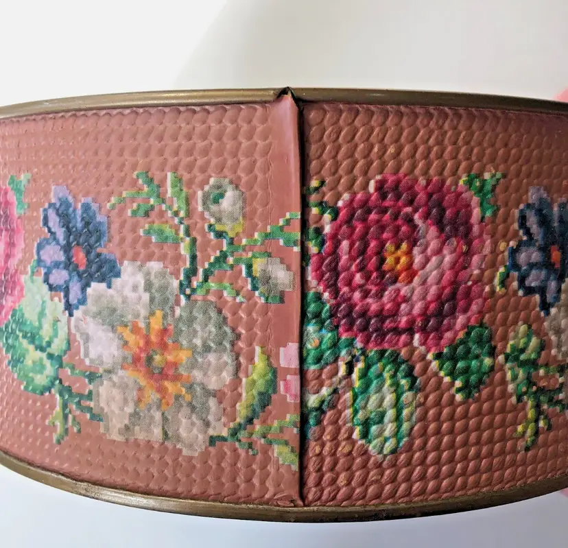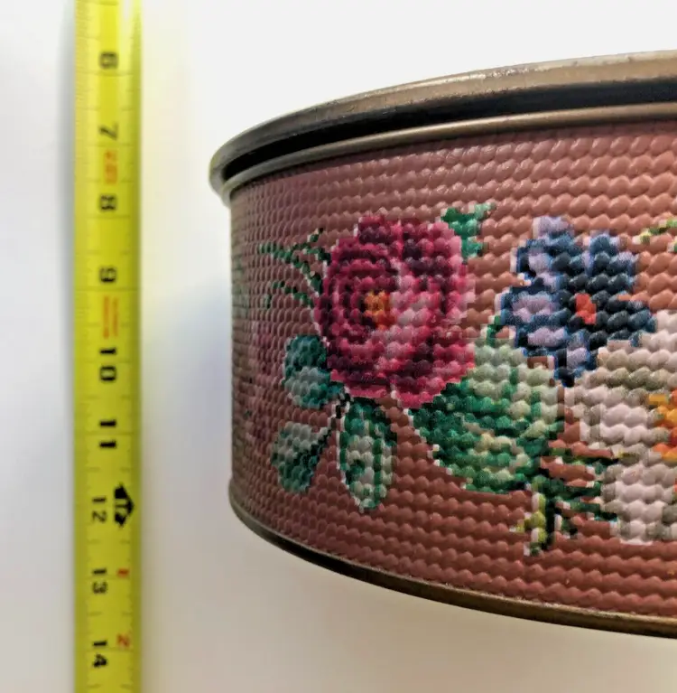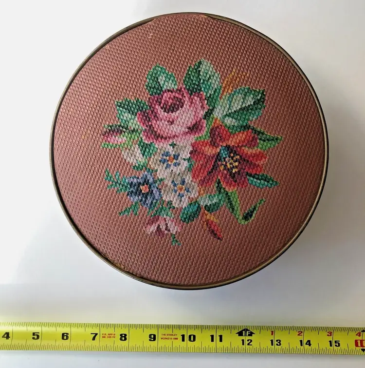 Perfectly imperfect floral tin to hold your most precious treasures, a sewing kit, or just to make you happy as it sits upon your shelf. This reminds me of an embroidered stool seat that my great-aunt made, which I still have in my guest room.