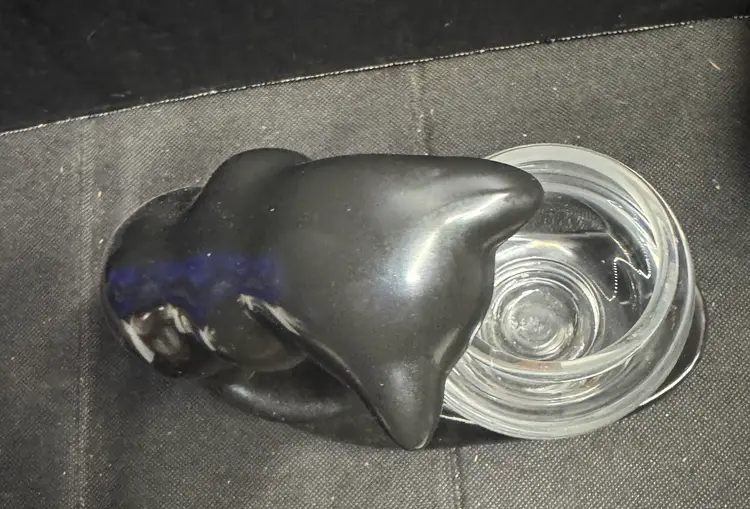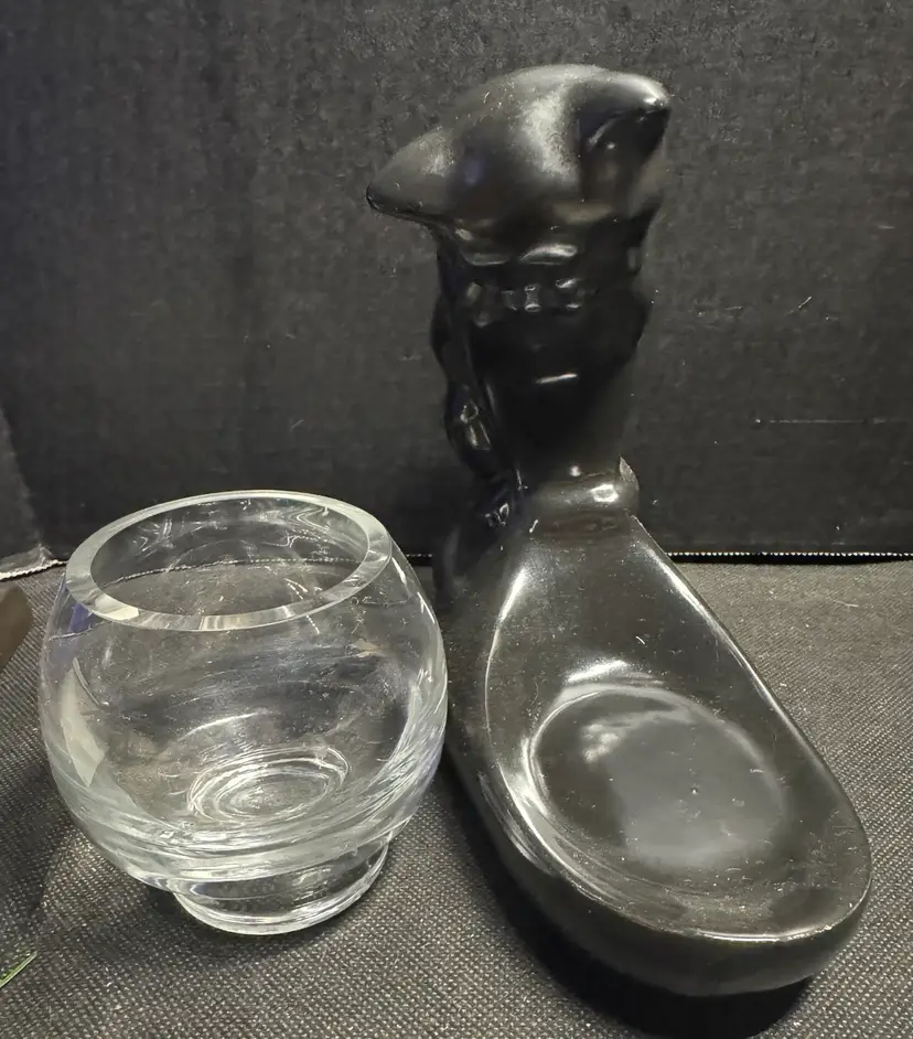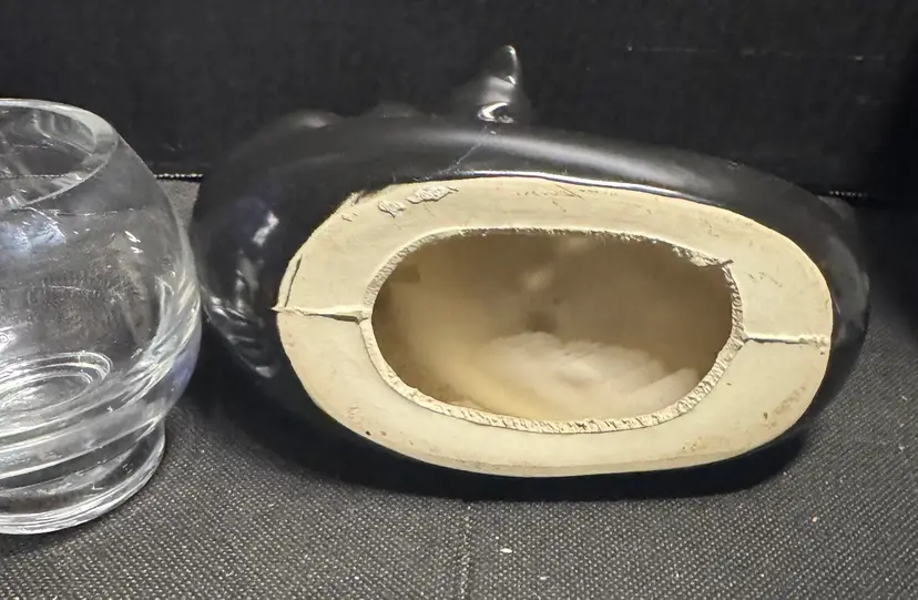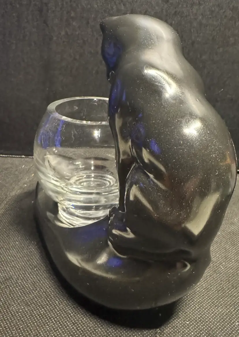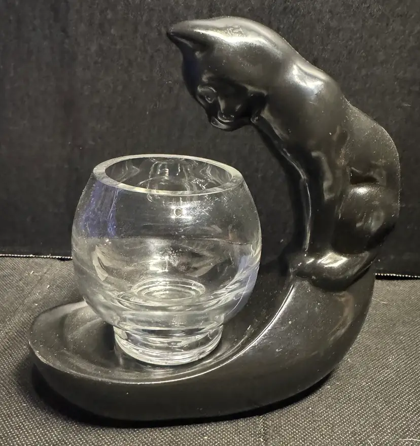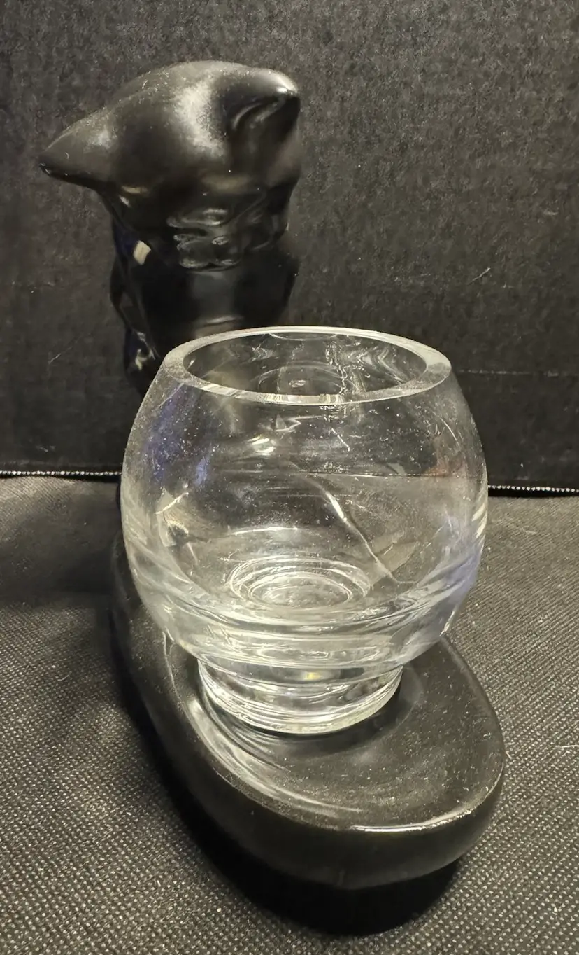 This vintage ceramic sculpture features a black cat with a mischievous expression on its face starring into the top of a glass fish bowl. The cat is crafted by Royal Haeger, a renowned brand in the world of pottery. The sculpture is made of high-quality ceramic and stands at approximately 8 inches tall and 8 inches wide.
