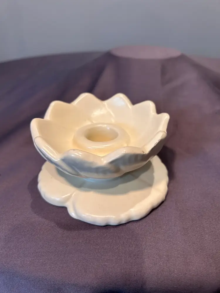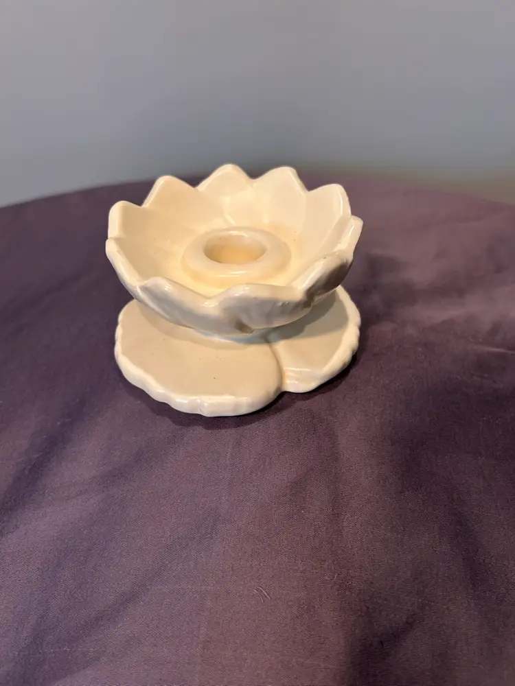 Matte, white creamy ivory Haeger pottery ceramic candle holder. Measurements are, base 4” across, lily 3.75 across, 2.25 inches tall. Simple but classic Art Nouveau or MCM esthetic. No flaws.