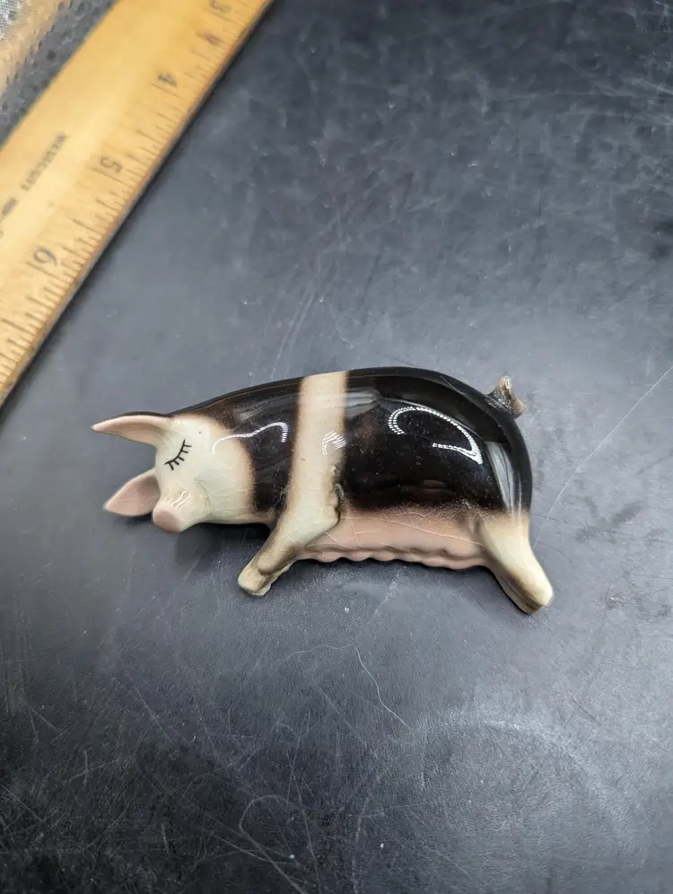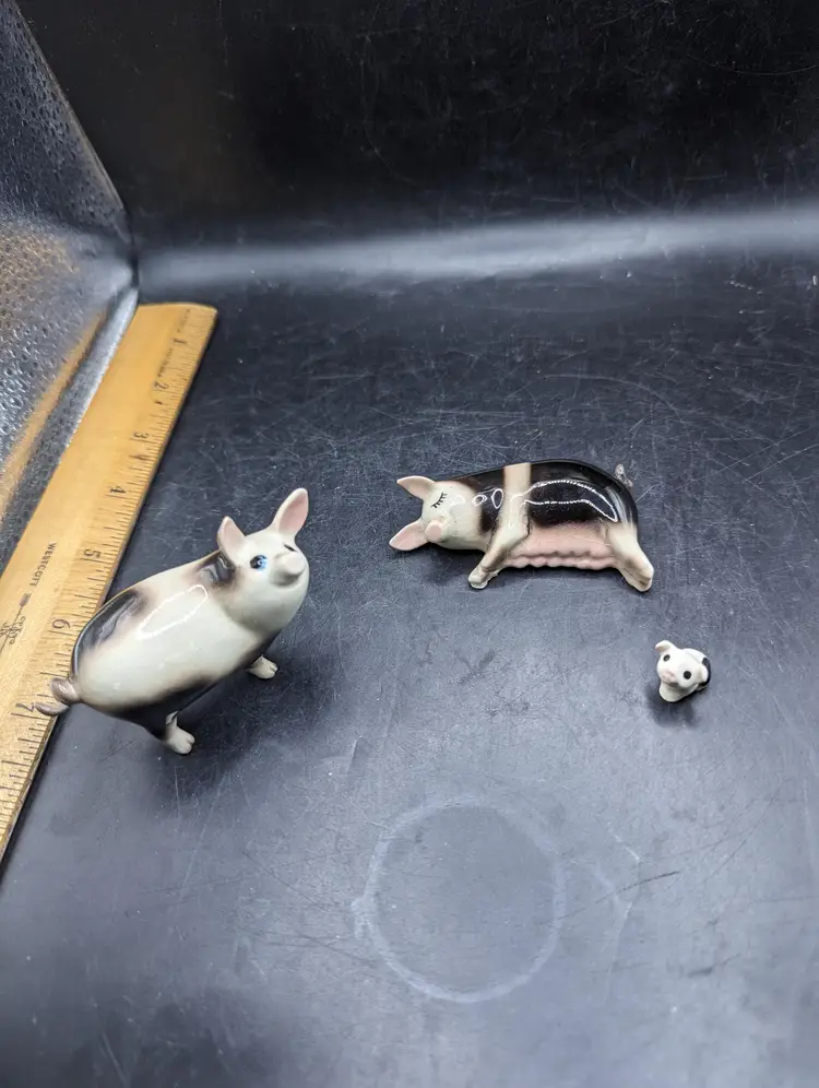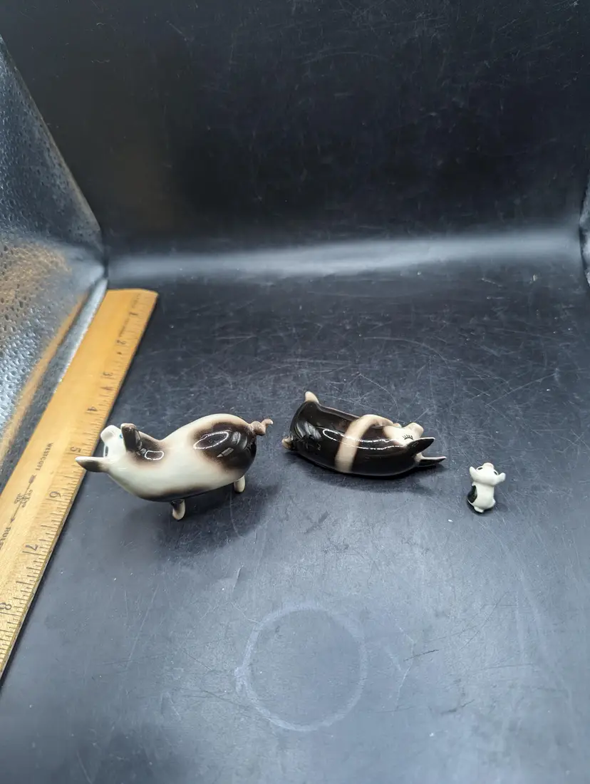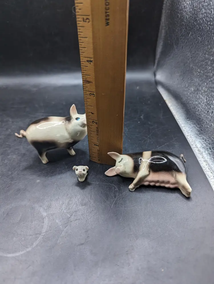 This is a lovely Vintage Hagen Renaker Papa Pig, Mama Pig And Baby Pig Family. The Papa pig is standing. The mama pig is laying down ready to feed her baby. The baby pig is just hanging out. No chips or cracks. Please see all pictures for condition.