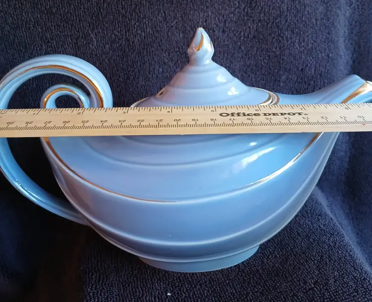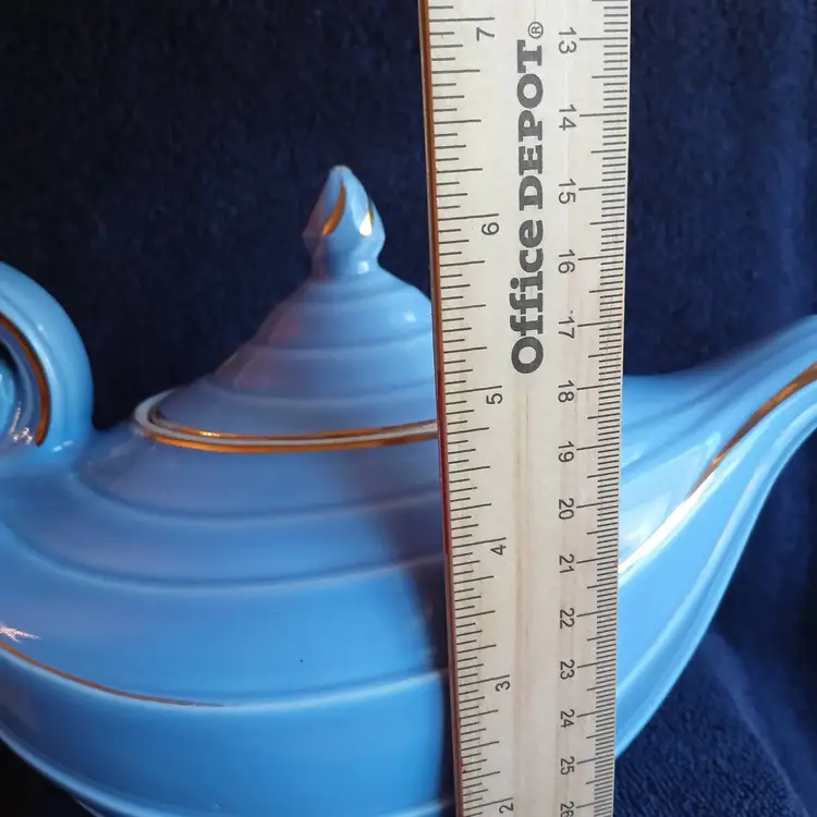This iconic genie lamp style of teapot stands out in a crowd, and is one of the reasons it is so highly sought after. This color is completely different and much lighter than the cobalt blue colored one.