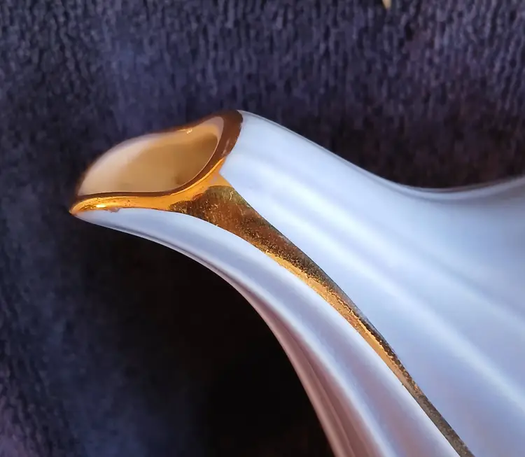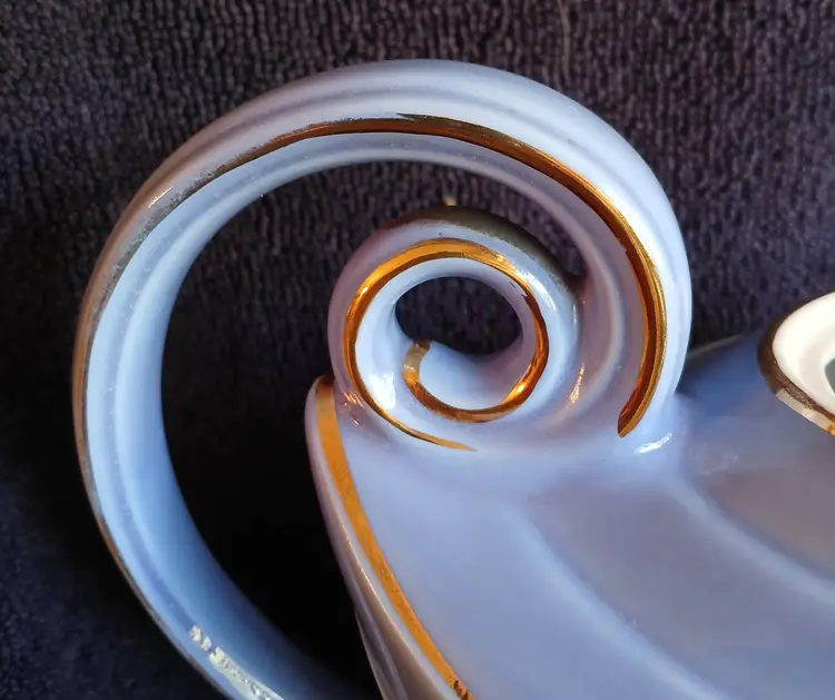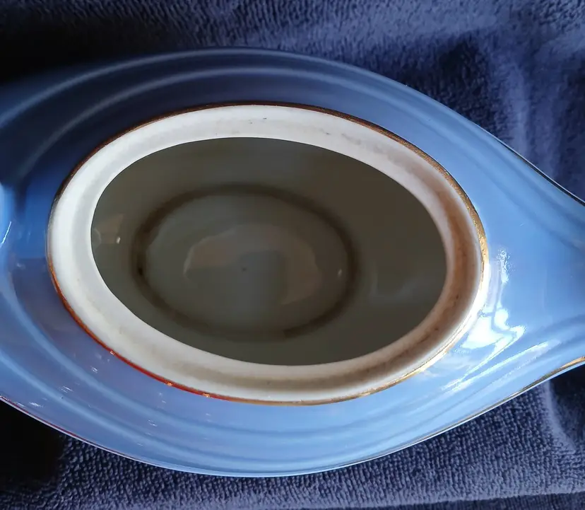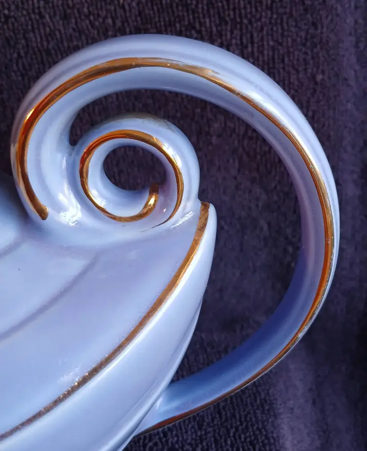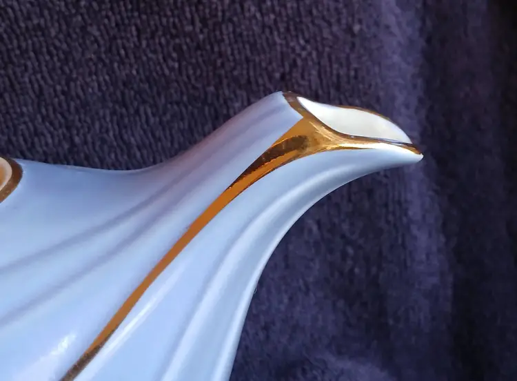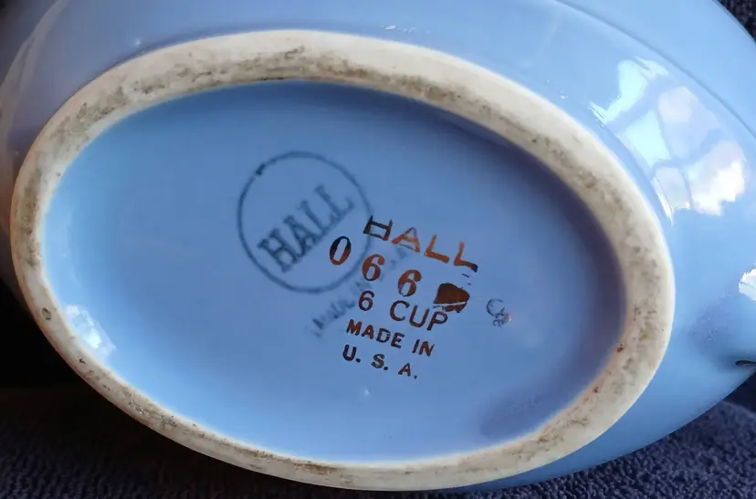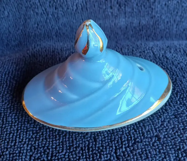 This is a 1930's Halls China Aladdin teapot. It is a cornflower blue color with gold trim. This estate sale find is in great condition for being almost 100 years old. There is some minor wear from usage, but absolutely no chips, cracks or crazing in the paint. It looks like it was used a few times and then sat for display purposes only.